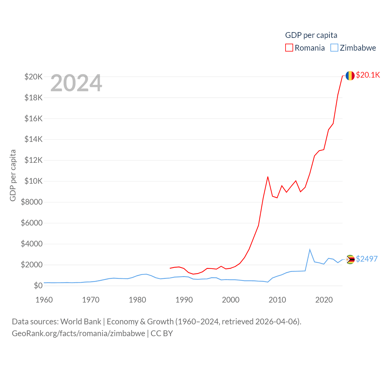 By GDP, Romania ranks 42/197 ($383B) and Zimbabwe ranks 102/197 ($41.5B). By GDP per capita, Romania ranks 58/197 ($20,080), while Zimbabwe ranks 148/197 ($2,497).