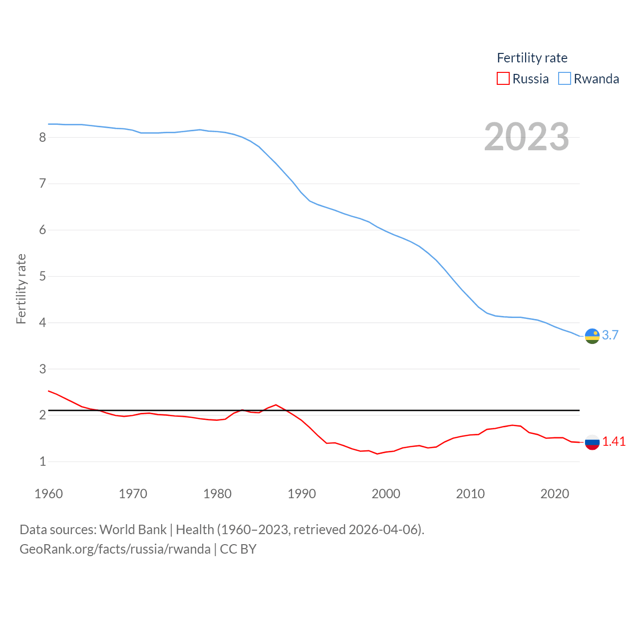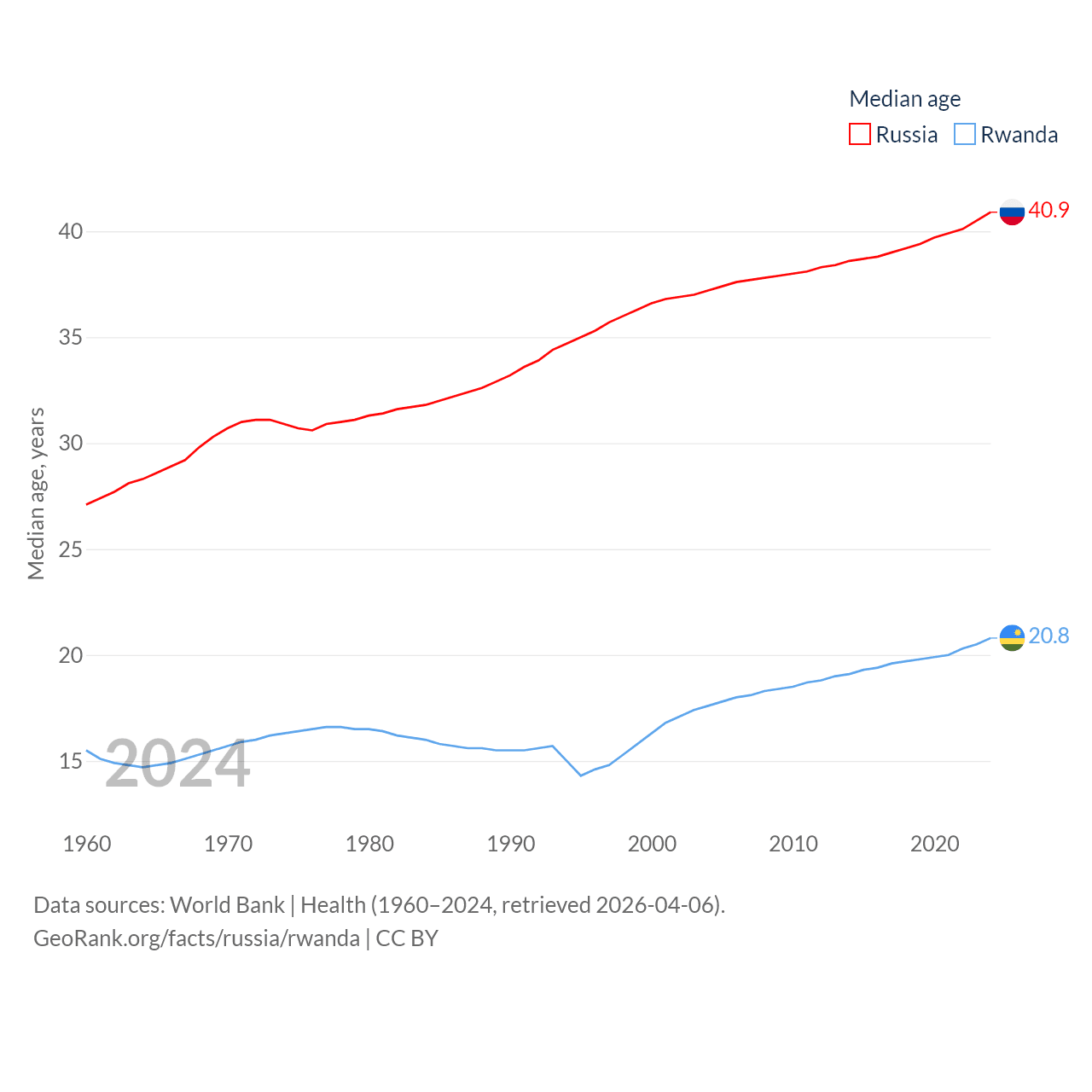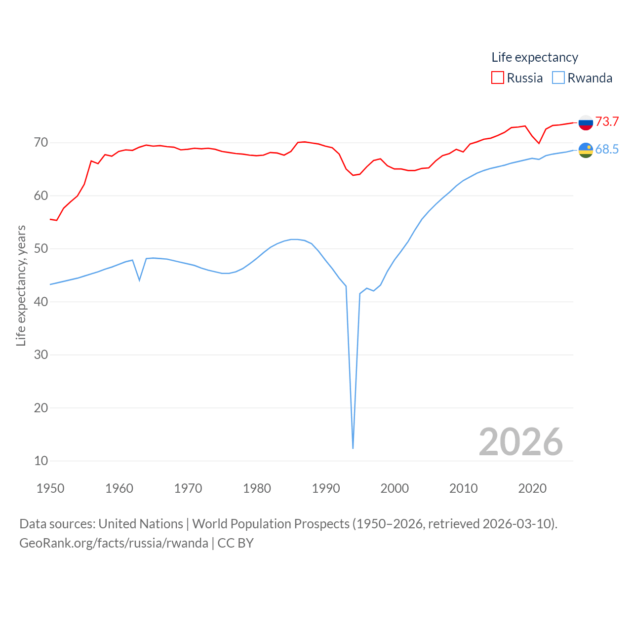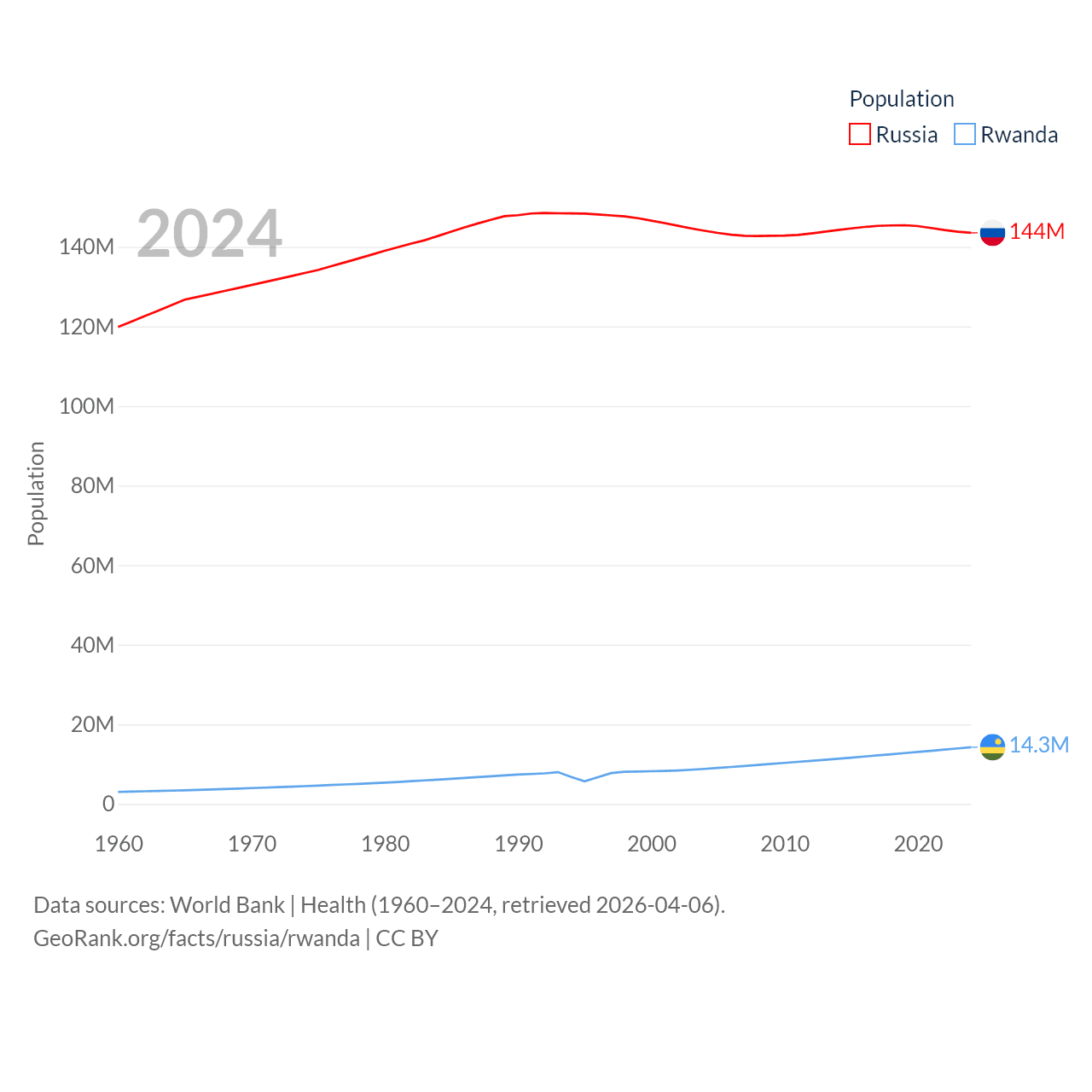 Russia has a population of 144M (ranked 9/197), compared with 14.3M in Rwanda (ranked 77/197). Russia's land area is 6,323,145 sq mi versus 9,525 sq mi for Rwanda (ranked 1st vs. 146th).