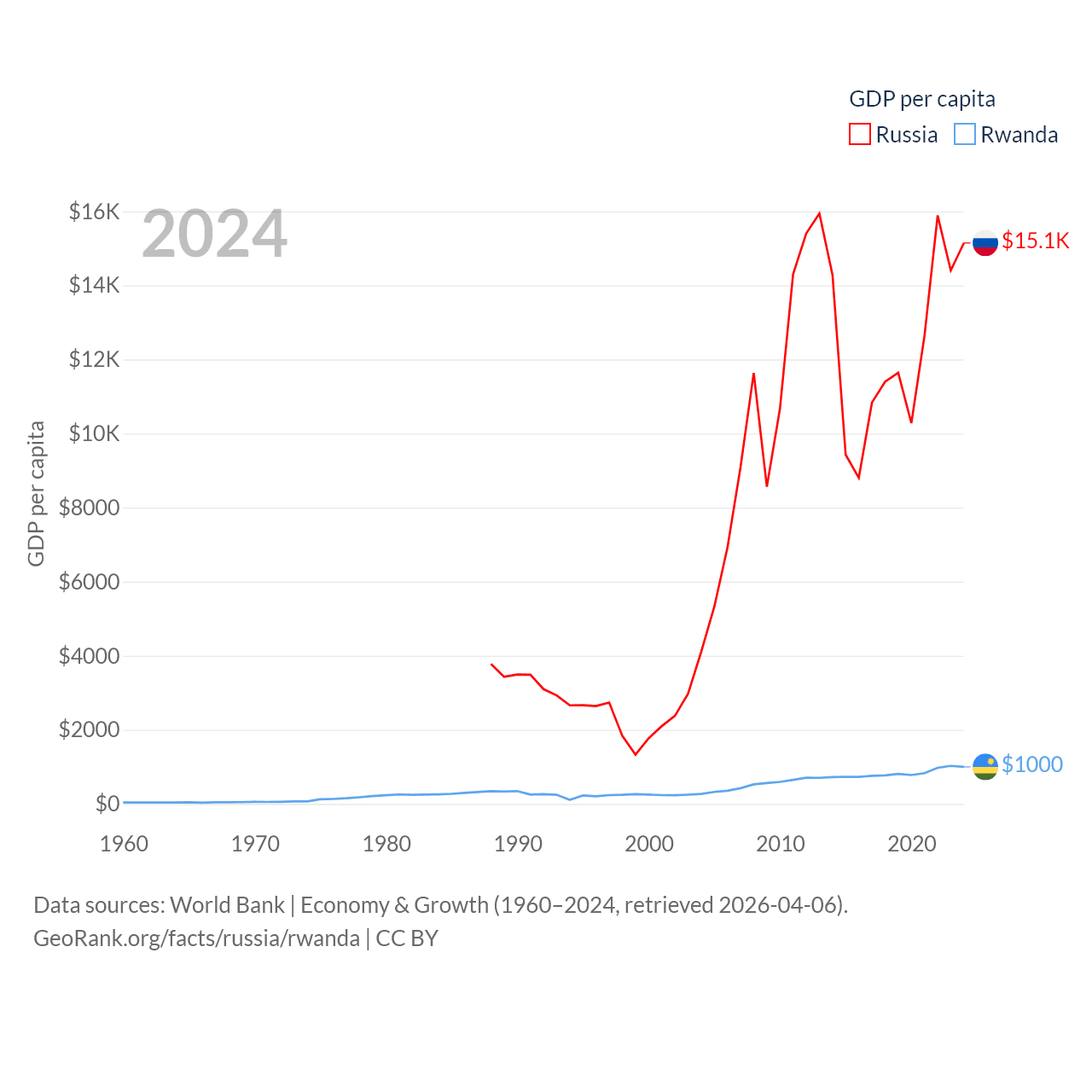 By GDP, Russia ranks 11/197 ($2.17T) and Rwanda ranks 144/197 ($14.3B). By GDP per capita, Russia ranks 68/197 ($15,145), while Rwanda ranks 178/197 ($1,000).