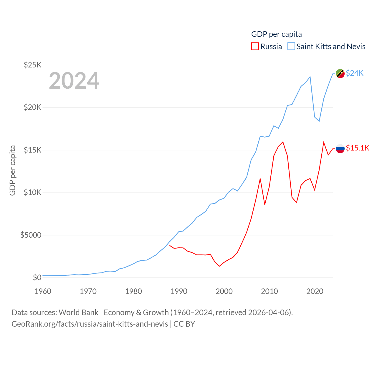 By GDP, Russia ranks 11/197 ($2.17T) and Saint Kitts and Nevis ranks 187/197 ($1.12B). By GDP per capita, Russia ranks 68/197 ($15,145), while Saint Kitts and Nevis ranks 51/197 ($23,961).