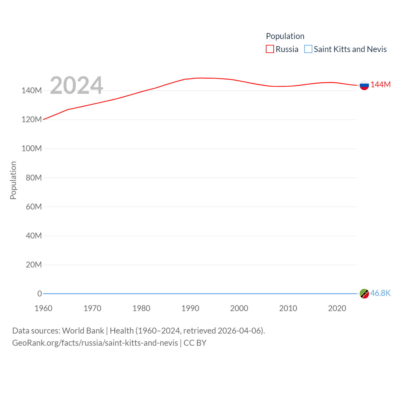 Russia has a population of 144M (ranked 9/197), compared with 46.8K in Saint Kitts and Nevis (ranked 189/197). Russia's land area is 6,323,145 sq mi versus 100.4 sq mi for Saint Kitts and Nevis (ranked 1st vs. 189th).