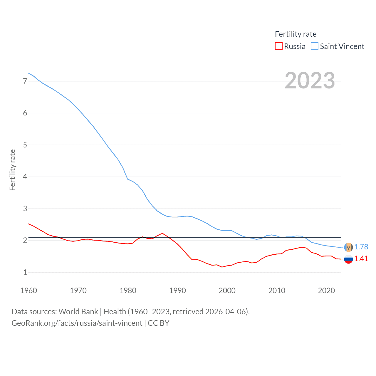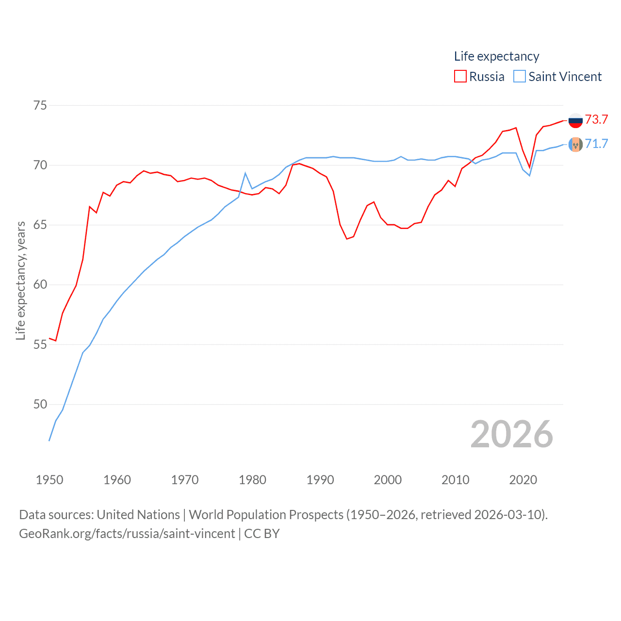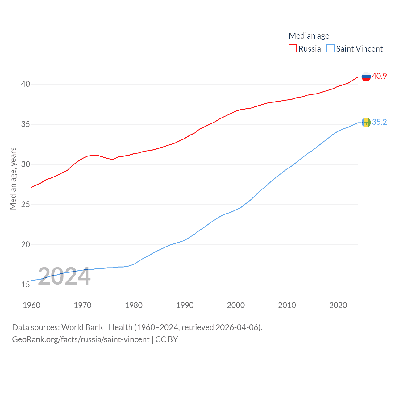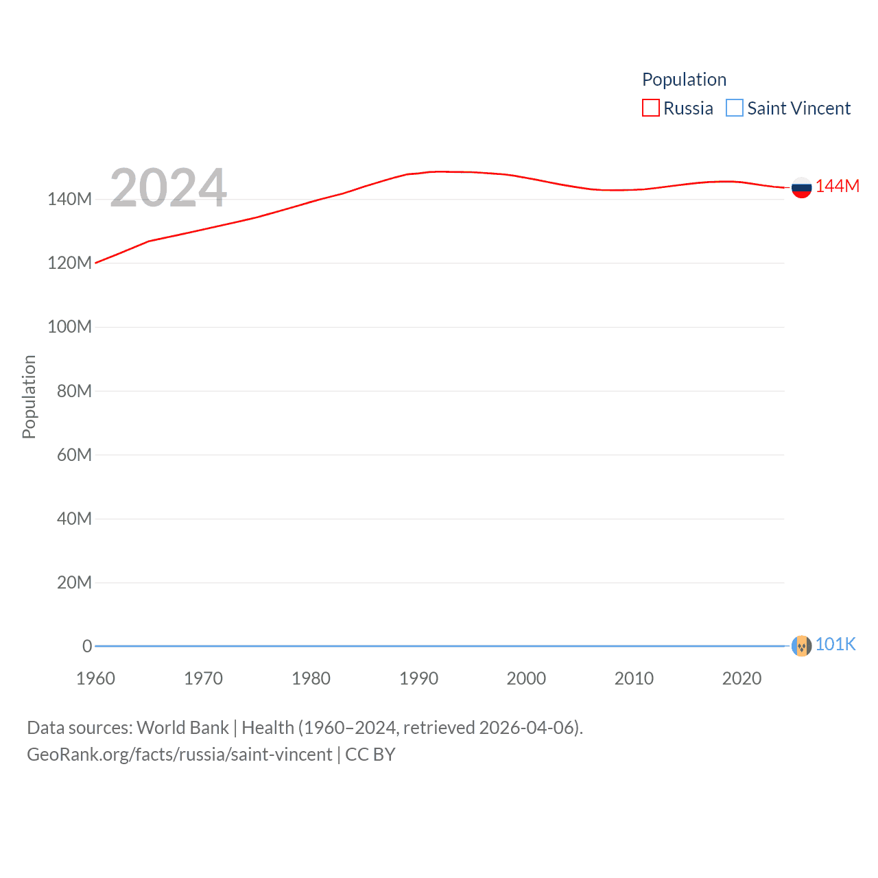 Russia has a population of 144M (ranked 9/197), compared with 101K in Saint Vincent (ranked 184/197). Russia's land area is 6,323,145 sq mi versus 150.6 sq mi for Saint Vincent (ranked 1st vs. 185th).
