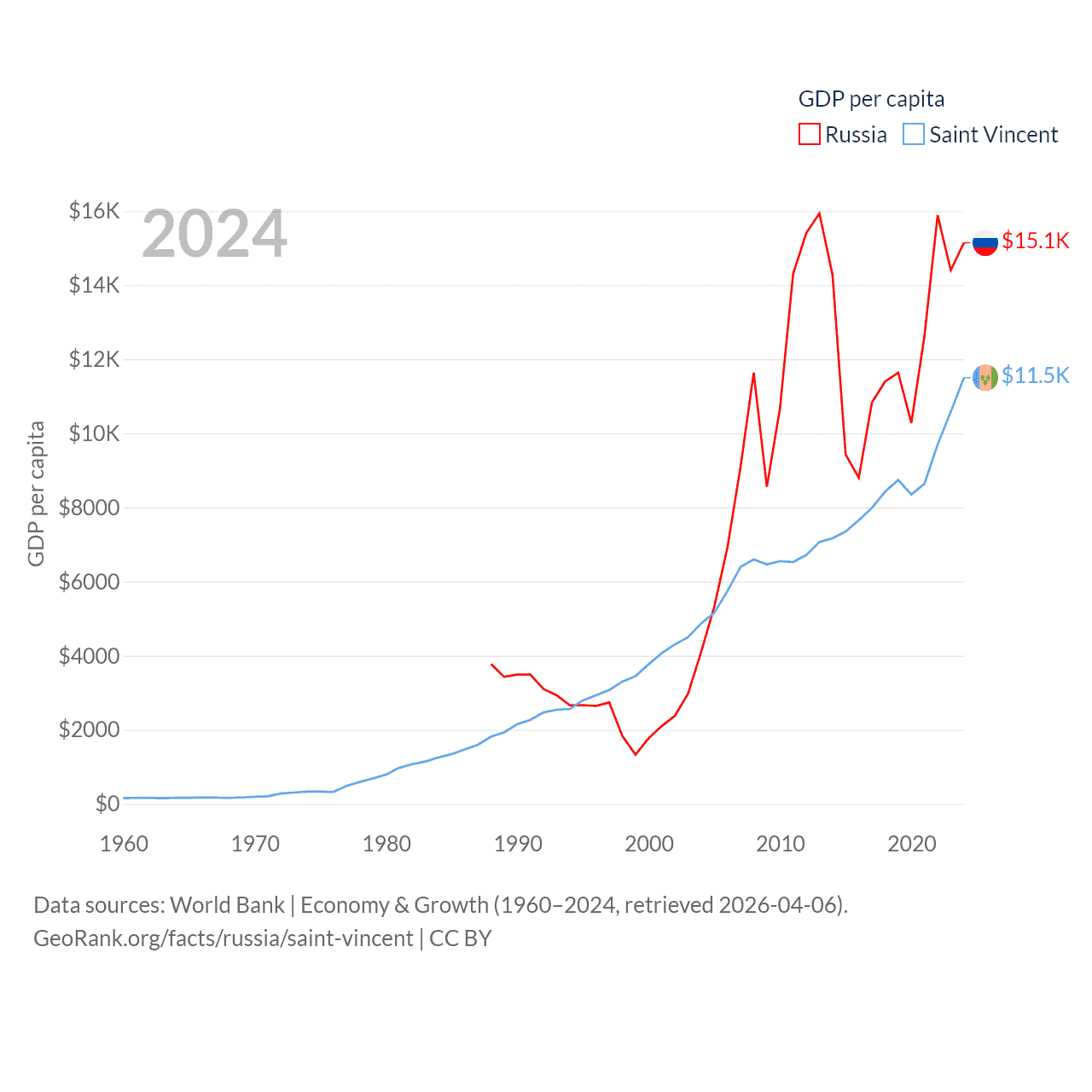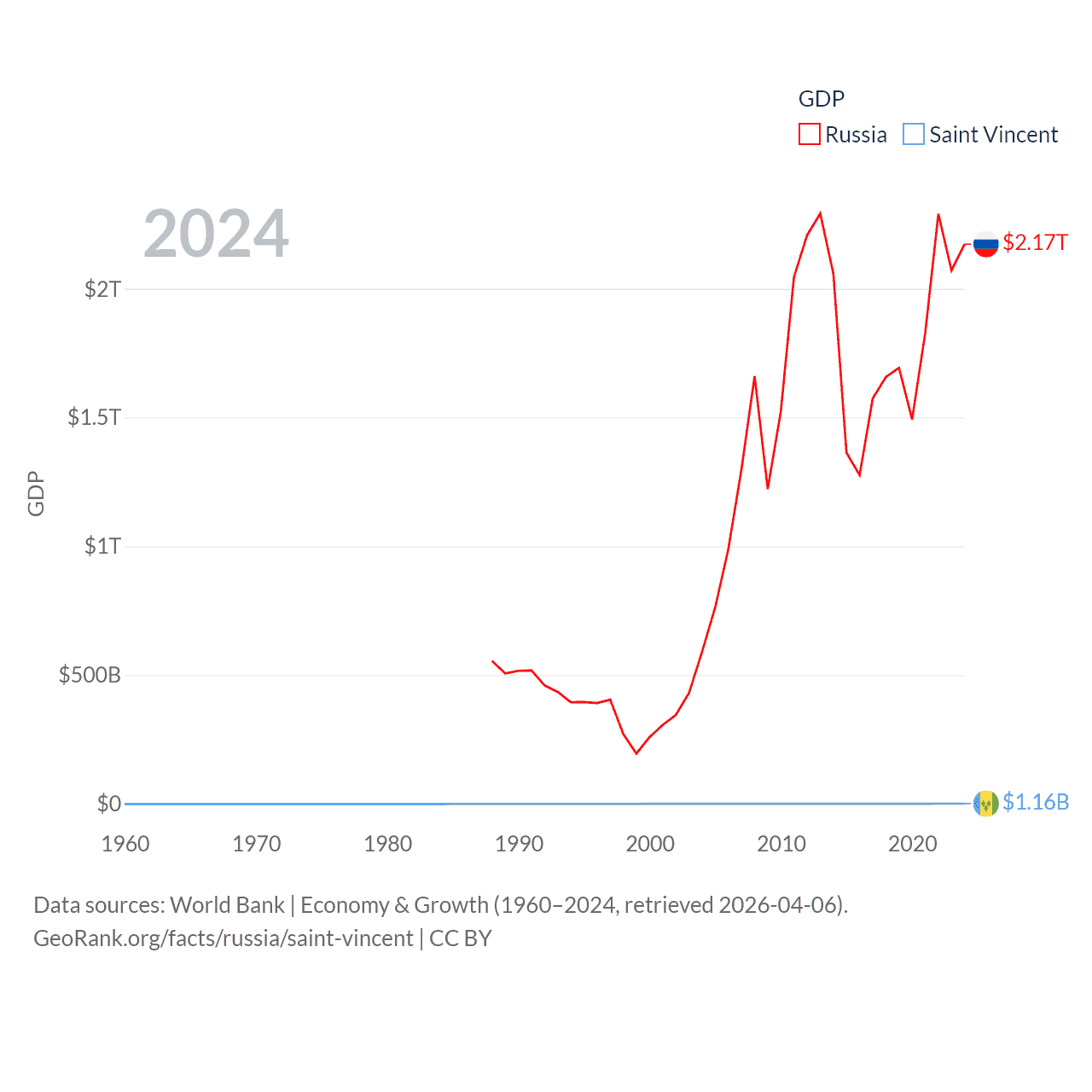By GDP, Russia ranks 11/197 ($2.17T) and Saint Vincent ranks 186/197 ($1.16B). By GDP per capita, Russia ranks 68/197 ($15,145), while Saint Vincent ranks 81/197 ($11,501).