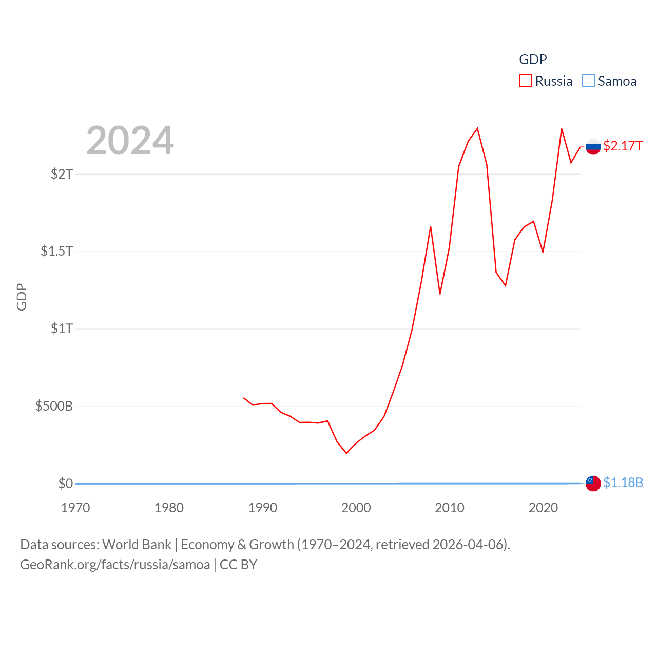 By GDP, Russia ranks 11/197 ($2.17T) and Samoa ranks 185/197 ($1.18B). By GDP per capita, Russia ranks 68/197 ($15,145), while Samoa ranks 117/197 ($5,393).