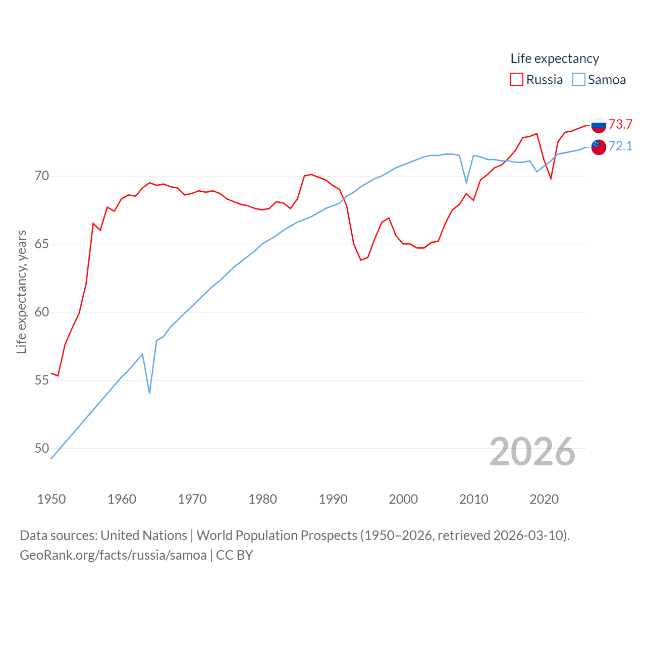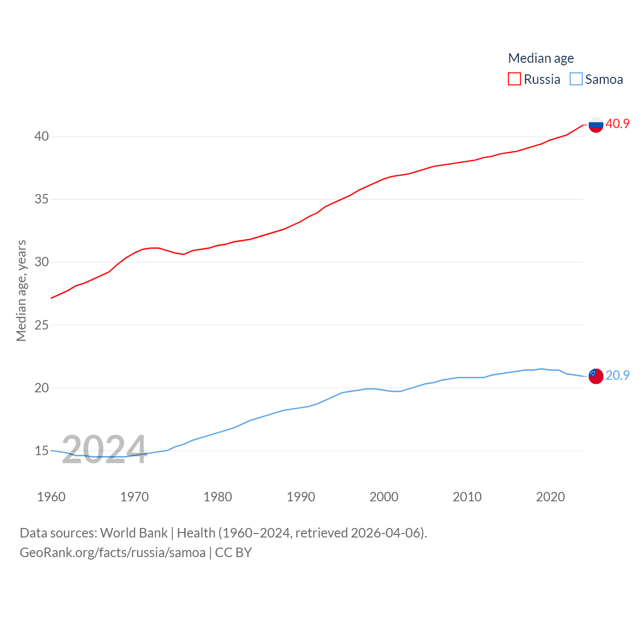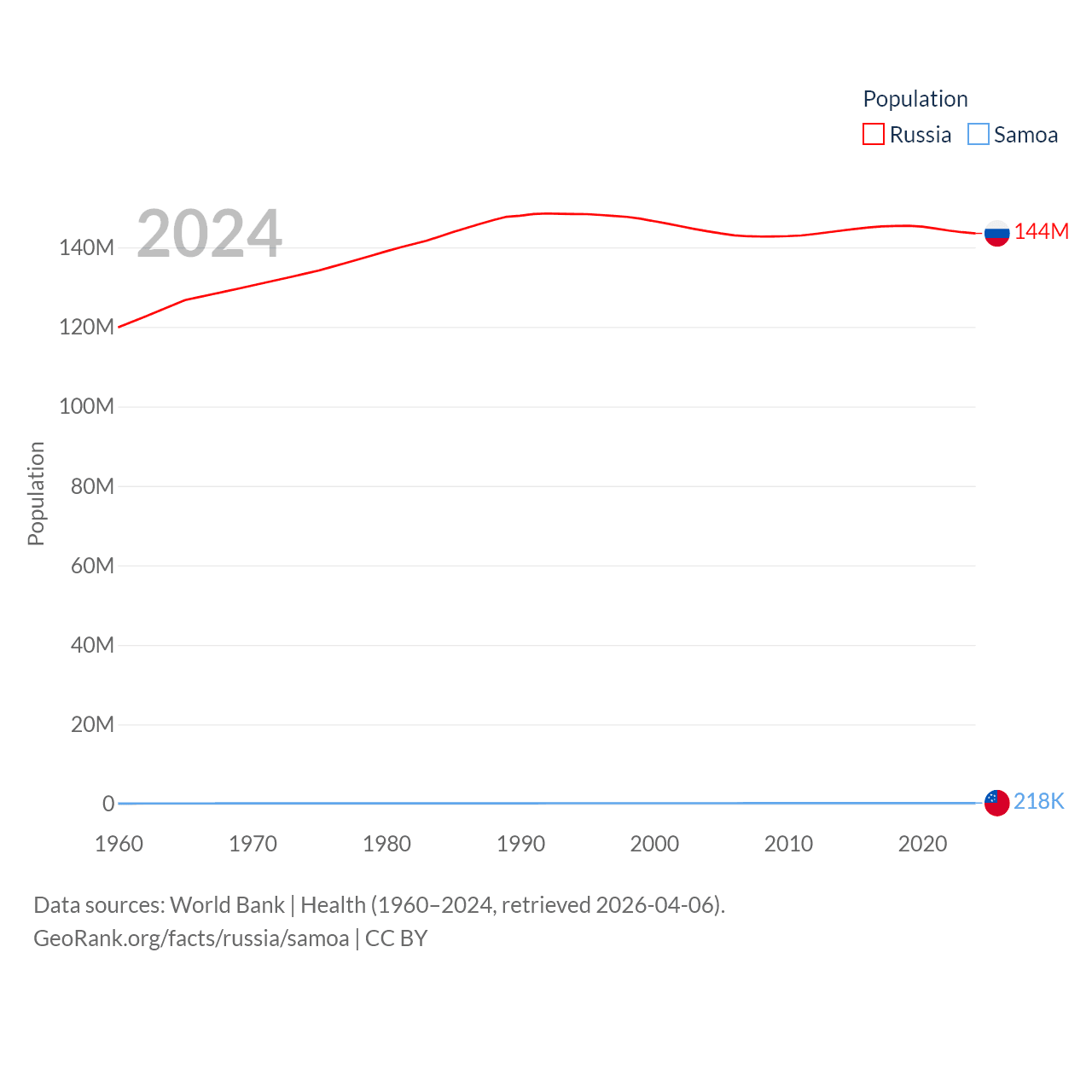 Russia has a population of 144M (ranked 9/197), compared with 218K in Samoa (ranked 177/197). Russia's land area is 6,323,145 sq mi versus 1,073 sq mi for Samoa (ranked 1st vs. 168th).