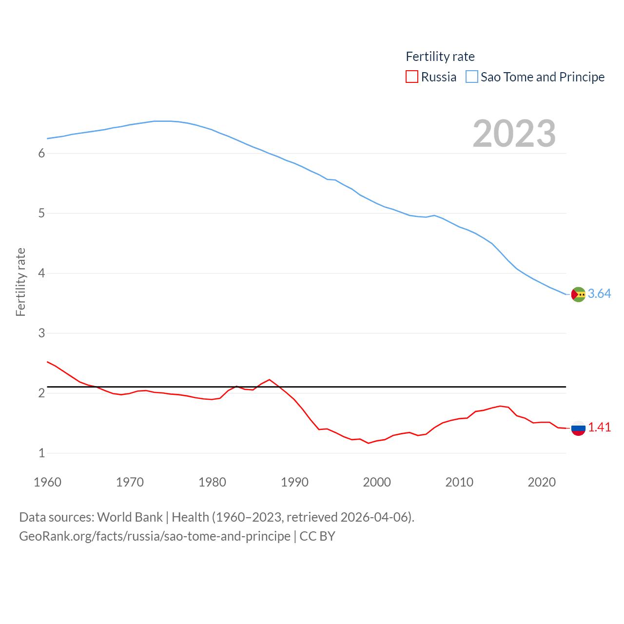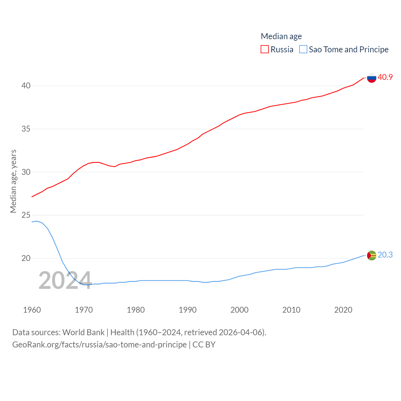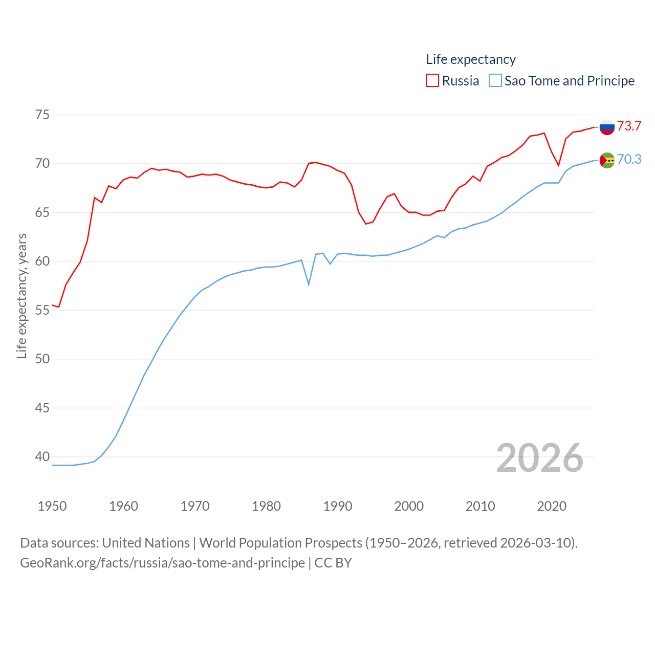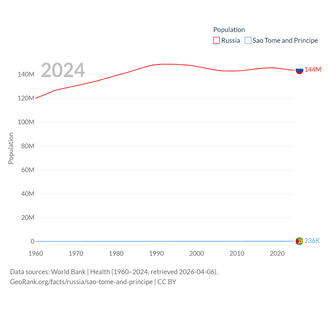 Russia has a population of 144M (ranked 9/197), compared with 236K in Sao Tome and Principe (ranked 176/197). Russia's land area is 6,323,145 sq mi versus 371 sq mi for Sao Tome and Principe (ranked 1st vs. 172nd).