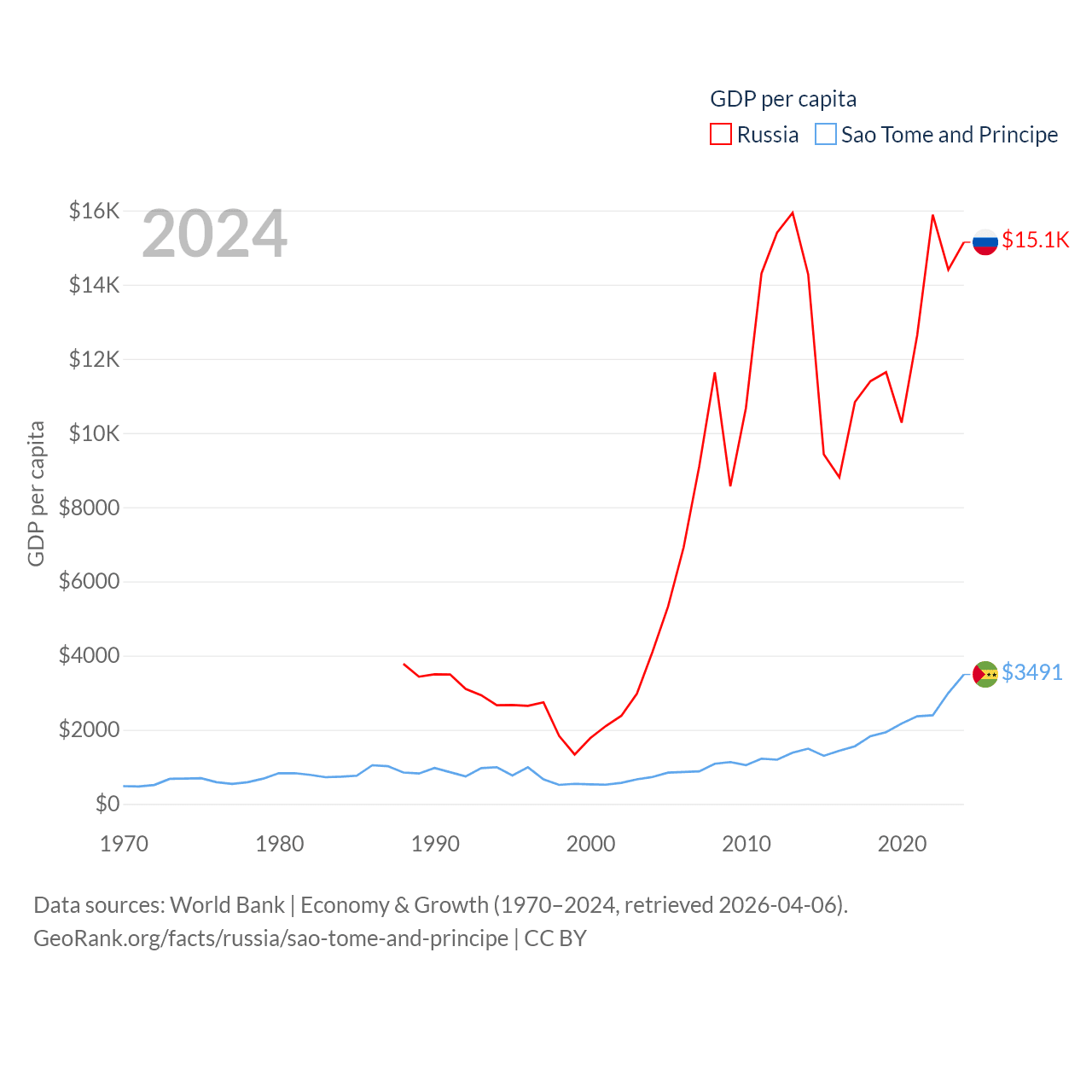 By GDP, Russia ranks 11/197 ($2.17T) and Sao Tome and Principe ranks 189/197 ($822M). By GDP per capita, Russia ranks 68/197 ($15,145), while Sao Tome and Principe ranks 134/197 ($3,491).