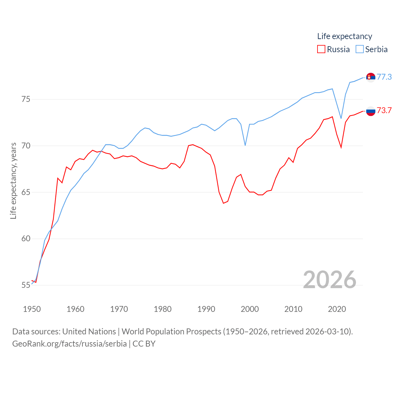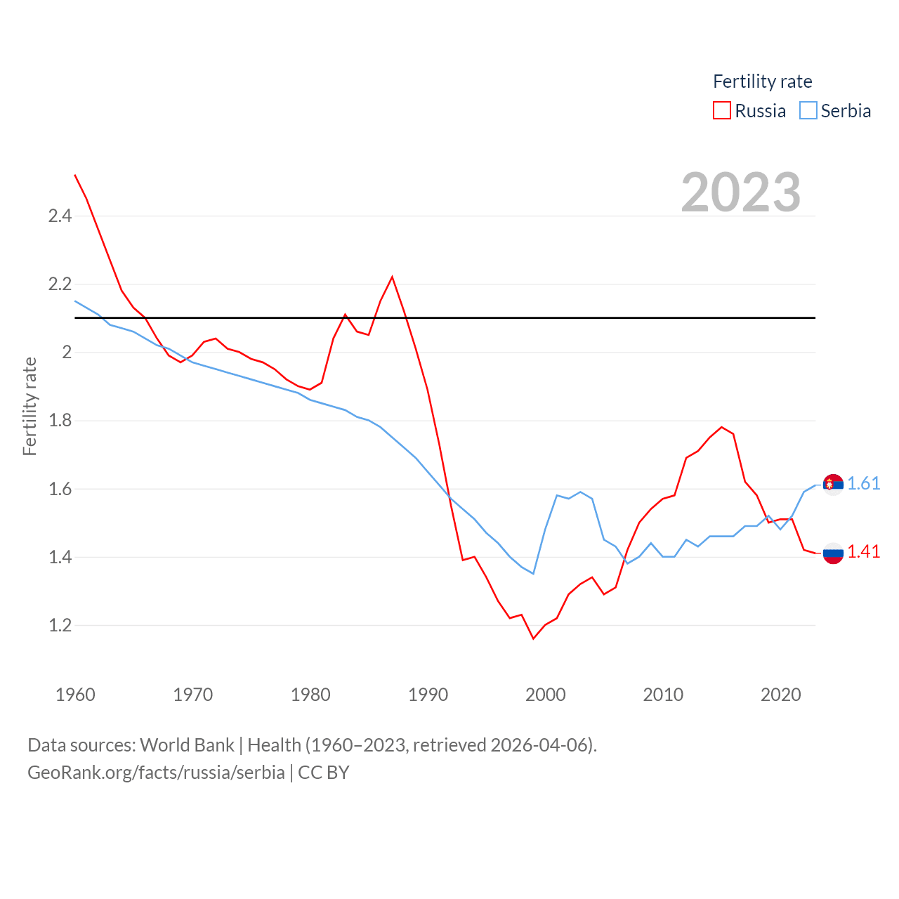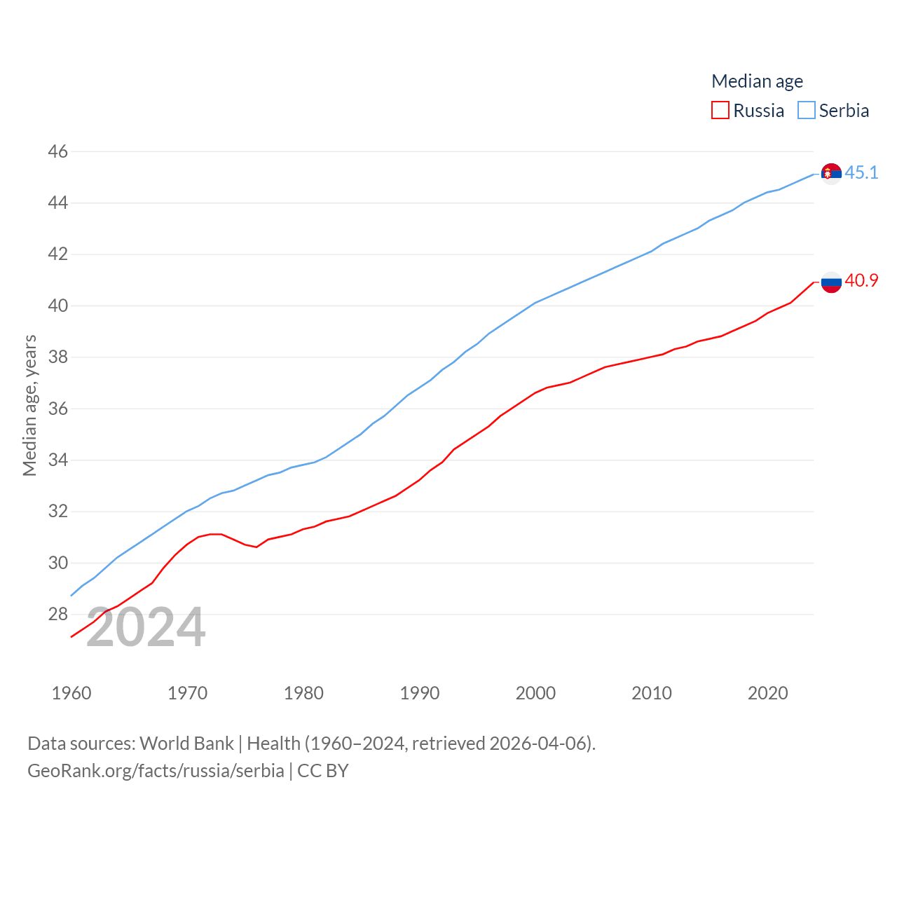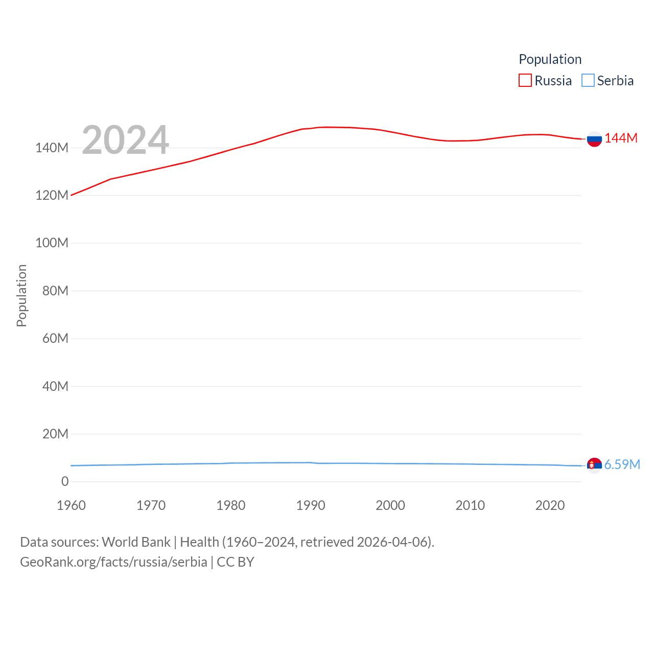 Russia has a population of 144M (ranked 9/197), compared with 6.59M in Serbia (ranked 109/197). Russia's land area is 6,323,145 sq mi versus 32,467 sq mi for Serbia (ranked 1st vs. 111th).