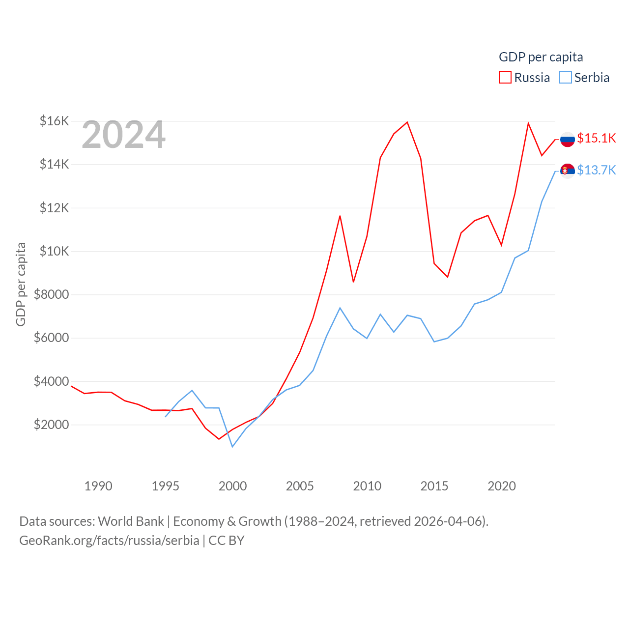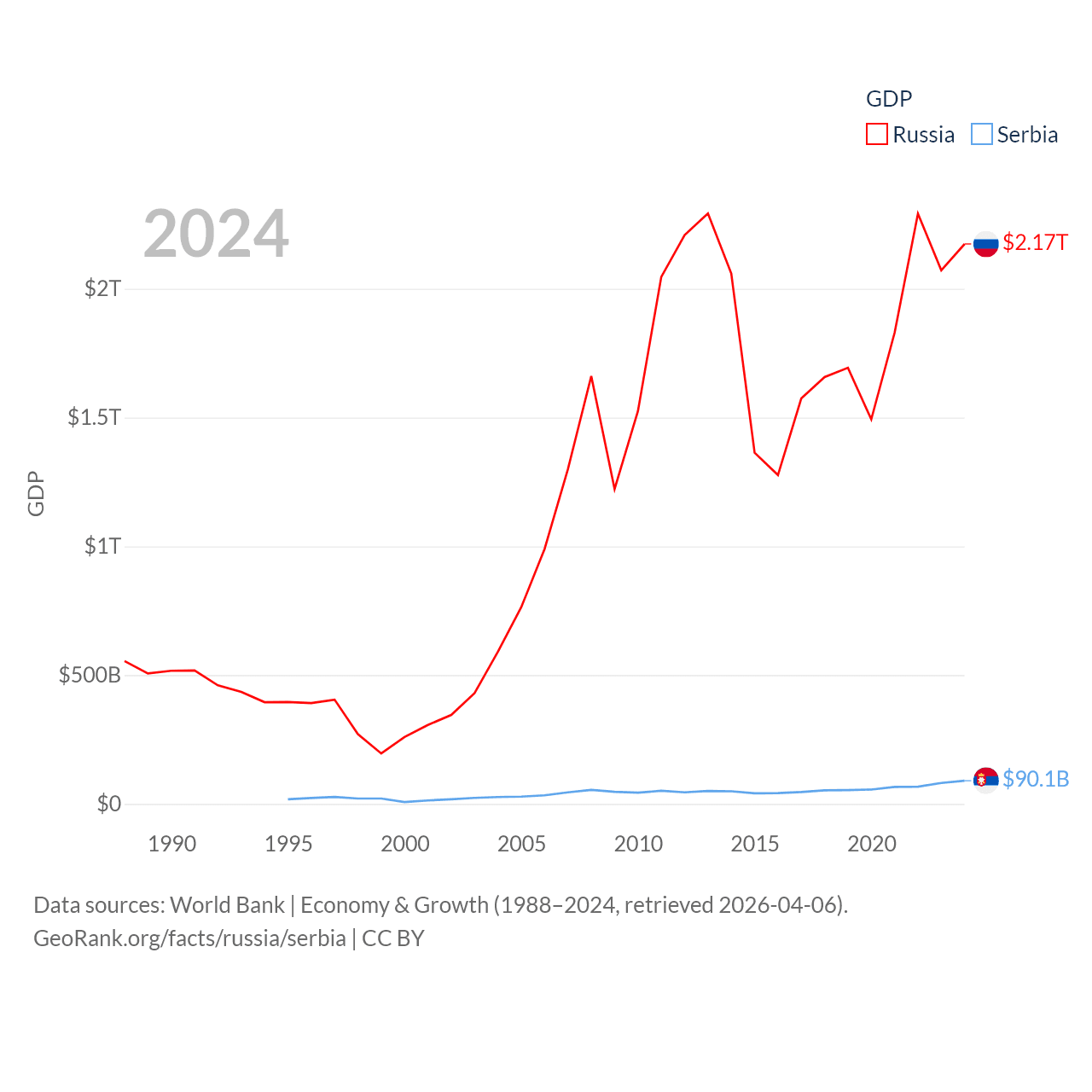 By GDP, Russia ranks 11/197 ($2.17T) and Serbia ranks 76/197 ($90.1B). By GDP per capita, Russia ranks 68/197 ($15,145), while Serbia ranks 73/197 ($13,679).