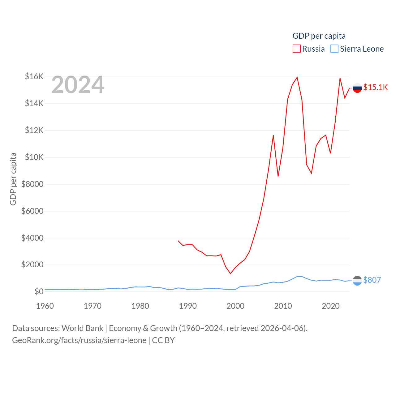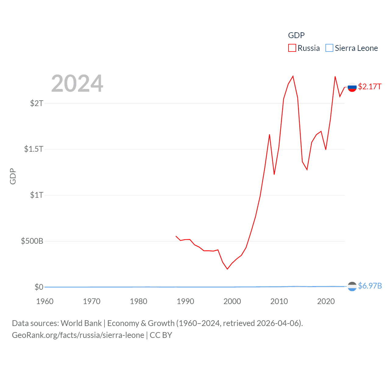 By GDP, Russia ranks 11/197 ($2.17T) and Sierra Leone ranks 160/197 ($6.97B). By GDP per capita, Russia ranks 68/197 ($15,145), while Sierra Leone ranks 186/197 ($807).