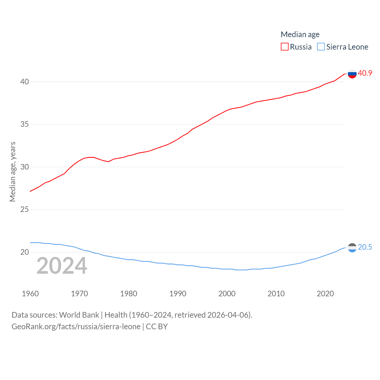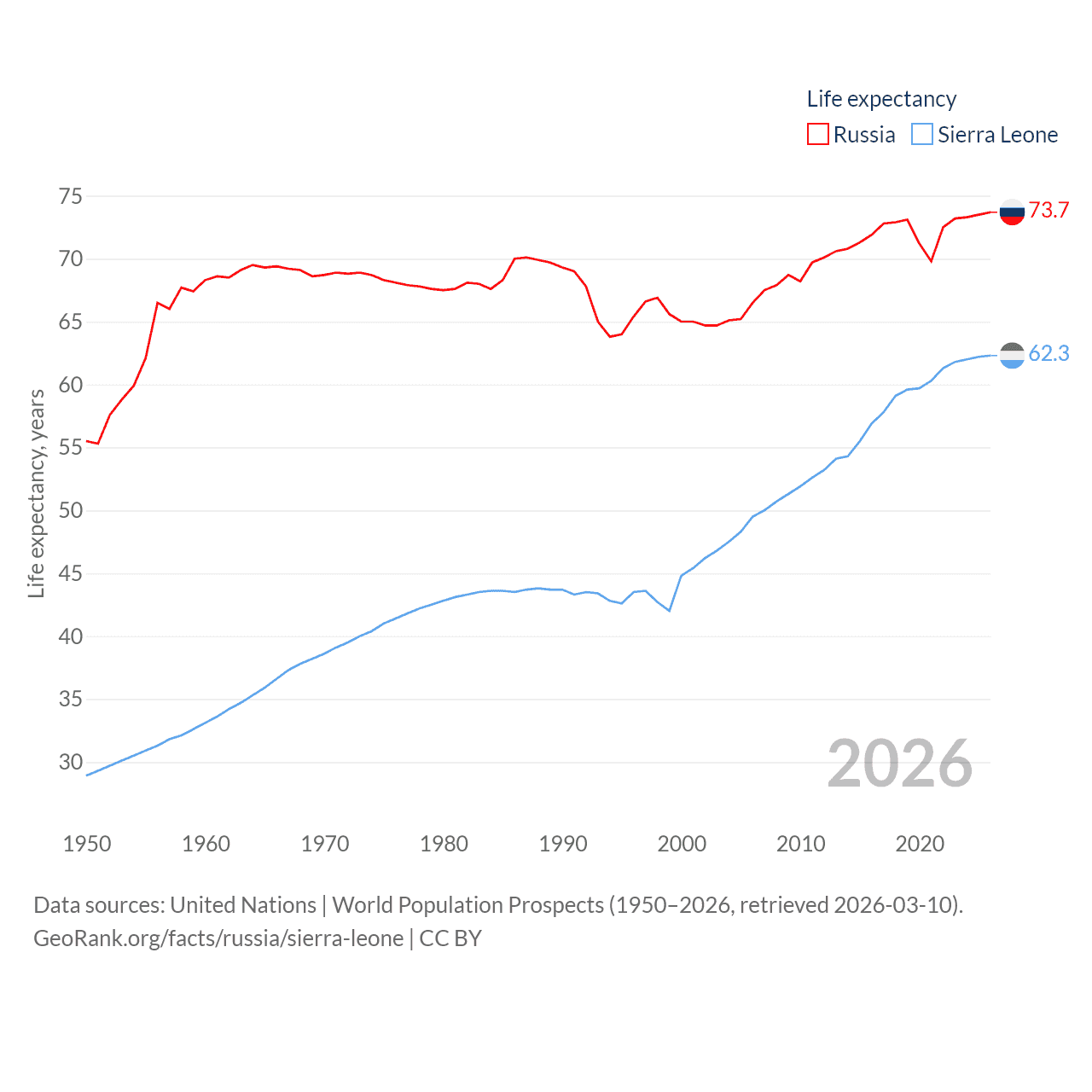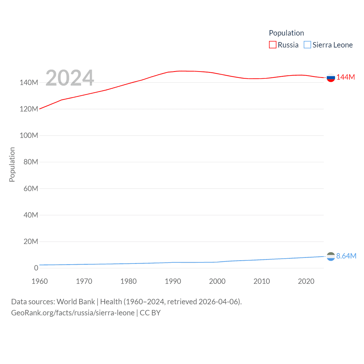 Russia has a population of 144M (ranked 9/197), compared with 8.64M in Sierra Leone (ranked 102/197). Russia's land area is 6,323,145 sq mi versus 27,869 sq mi for Sierra Leone (ranked 1st vs. 116th).
