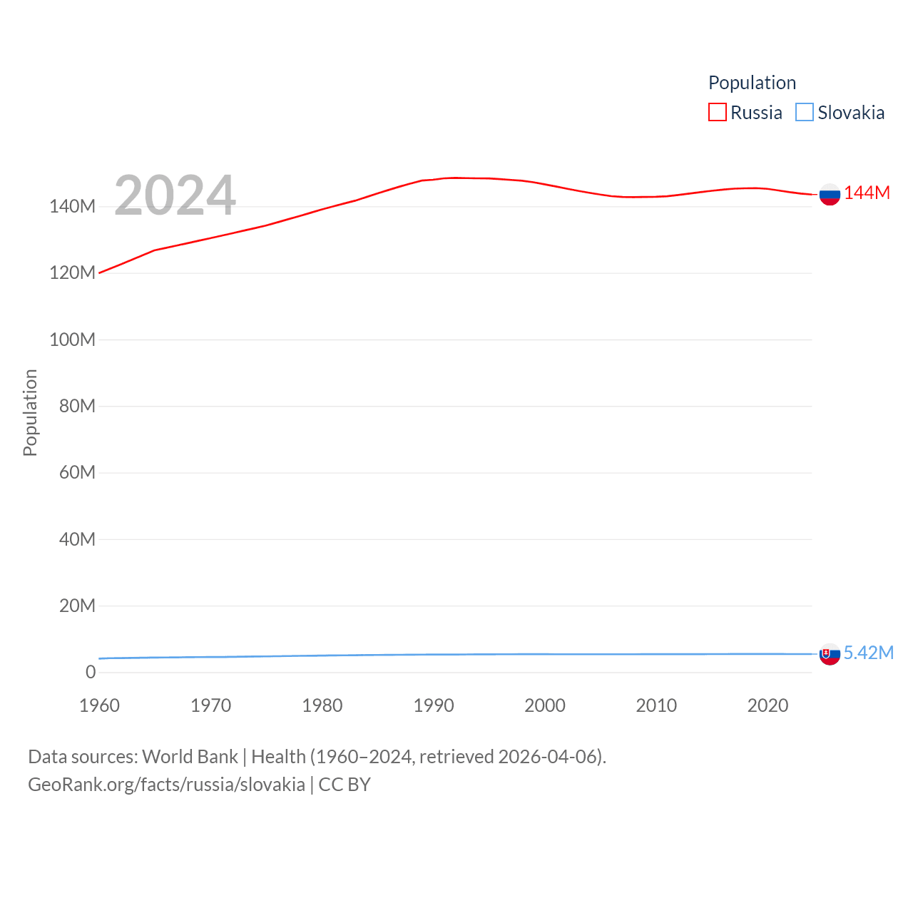 Russia has a population of 144M (ranked 9/197), compared with 5.42M in Slovakia (ranked 119/197). Russia's land area is 6,323,145 sq mi versus 18,564 sq mi for Slovakia (ranked 1st vs. 128th).