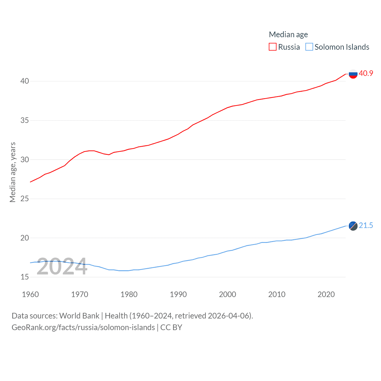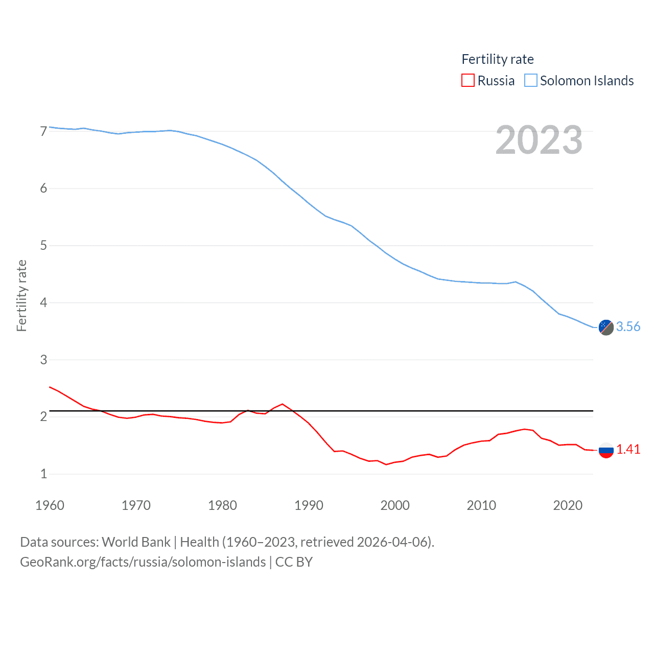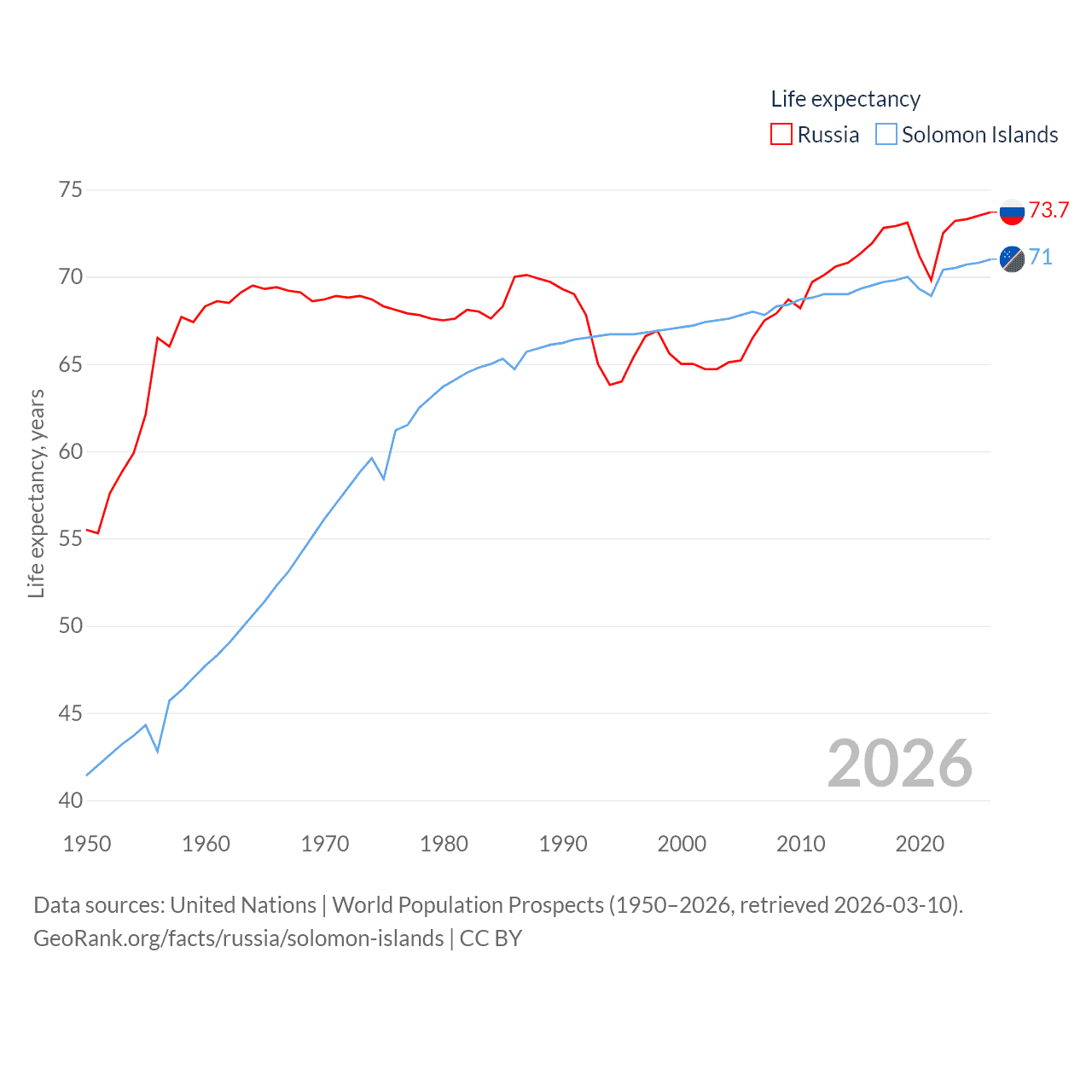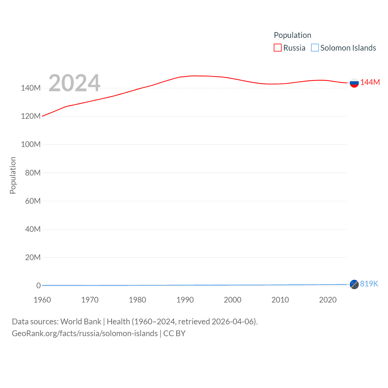 Russia has a population of 144M (ranked 9/197), compared with 819K in The Solomon Islands (ranked 162/197). Russia's land area is 6,323,145 sq mi versus 10,807 sq mi for The Solomon Islands (ranked 1st vs. 141st).