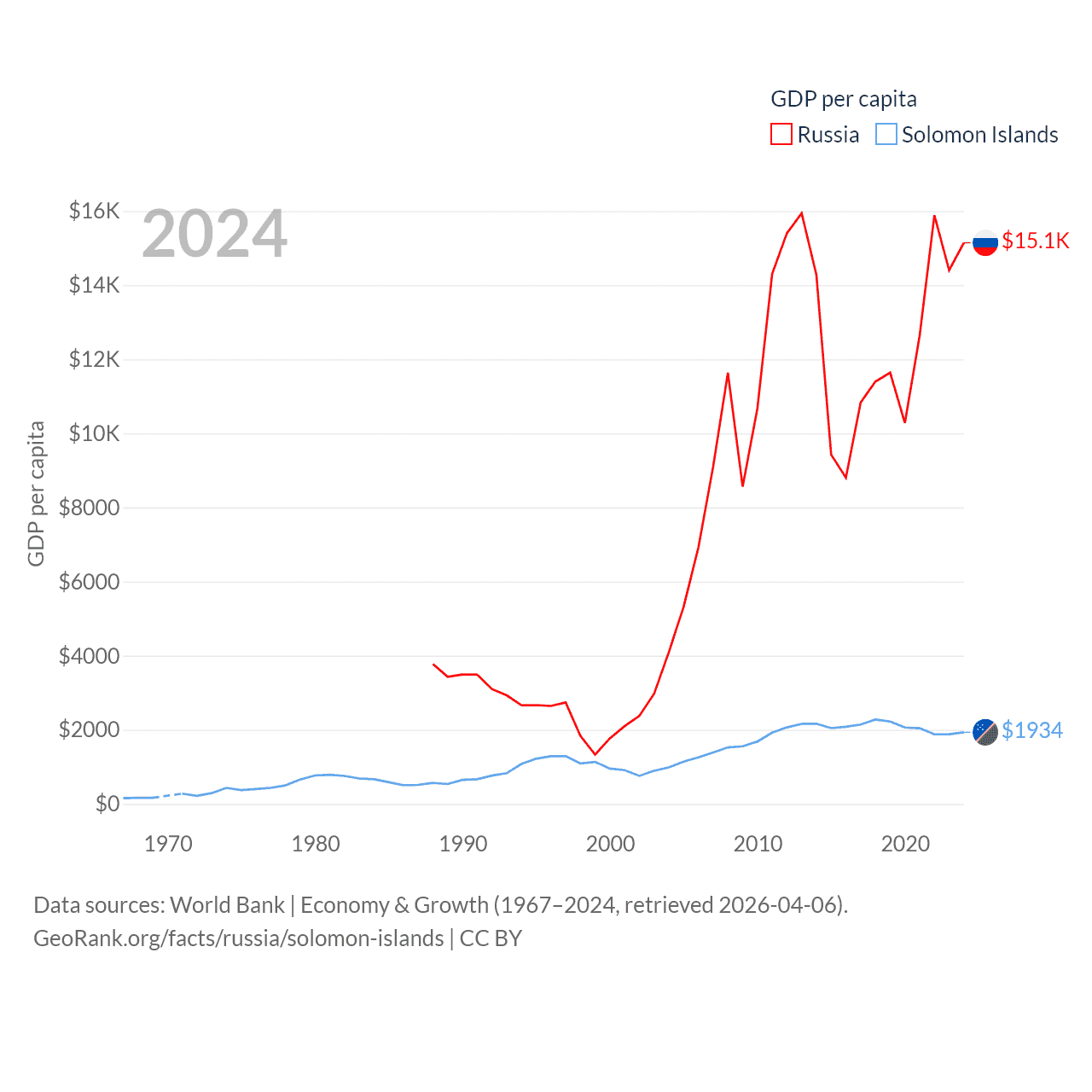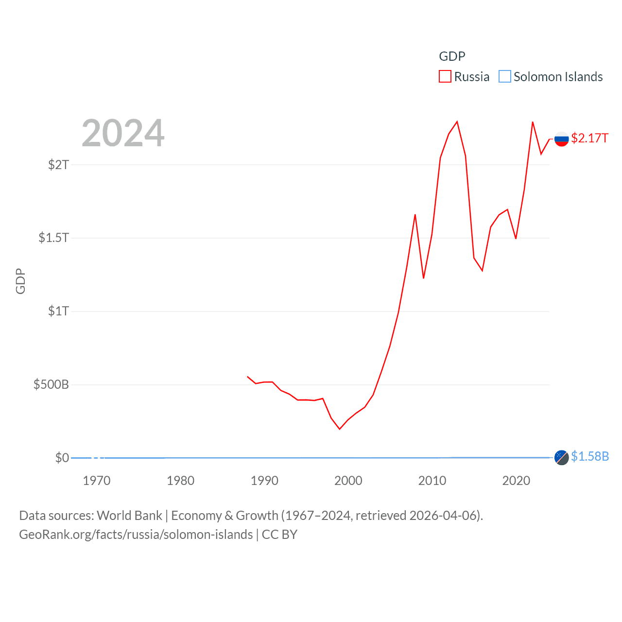 By GDP, Russia ranks 11/197 ($2.17T) and The Solomon Islands ranks 182/197 ($1.58B). By GDP per capita, Russia ranks 68/197 ($15,145), while The Solomon Islands ranks 157/197 ($1,934).