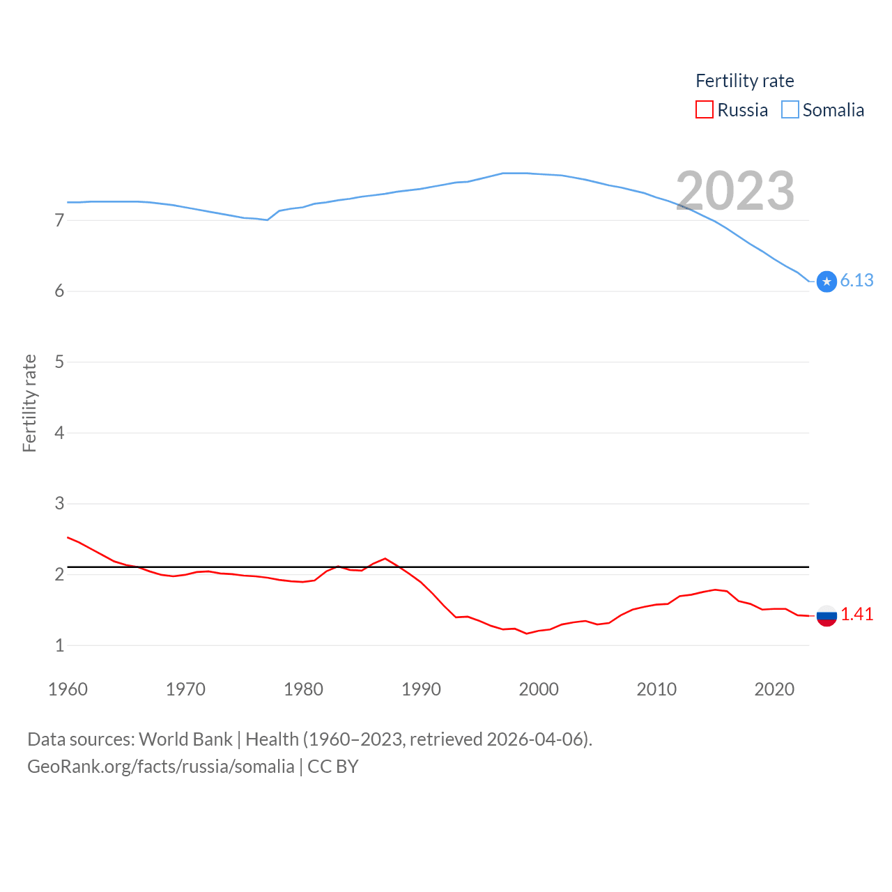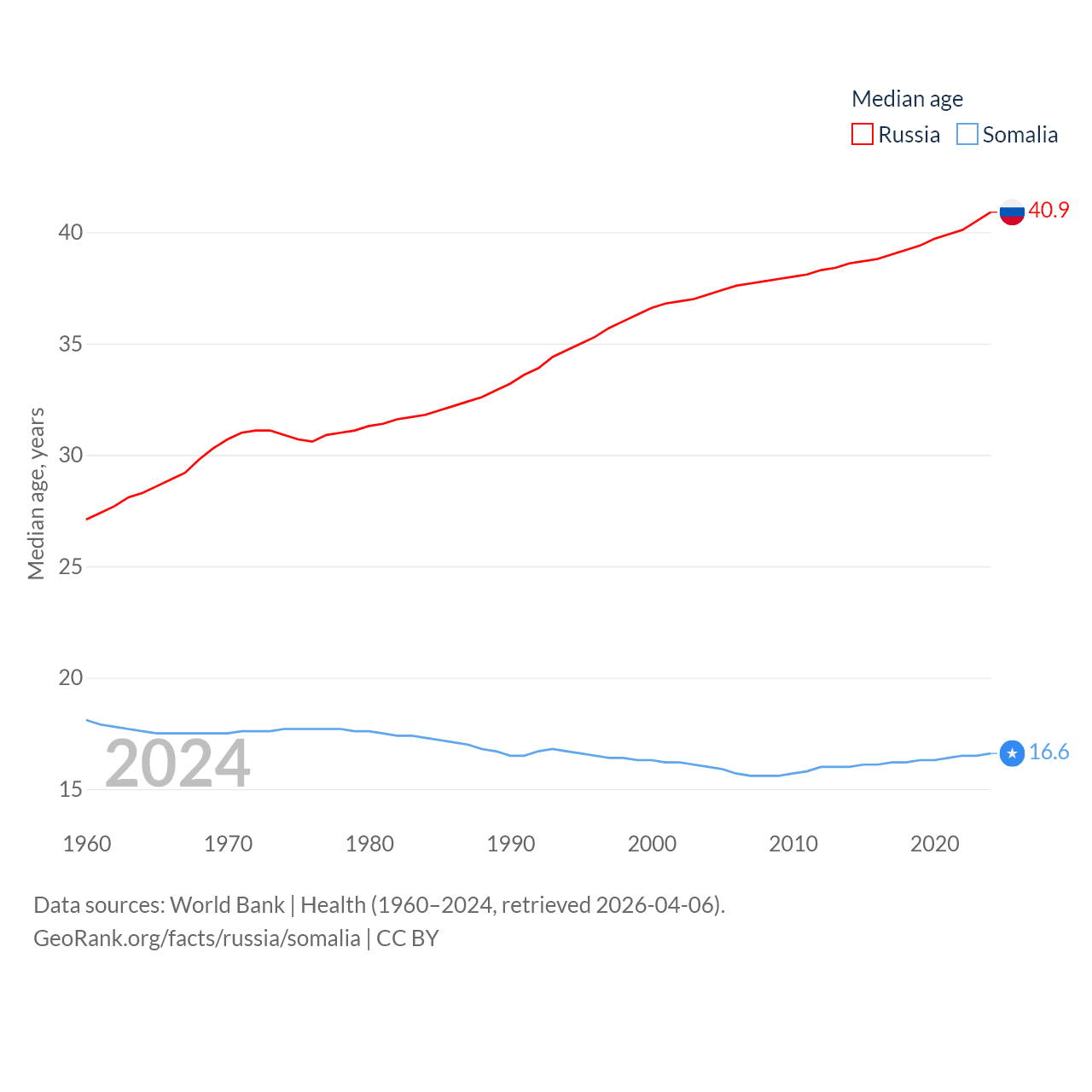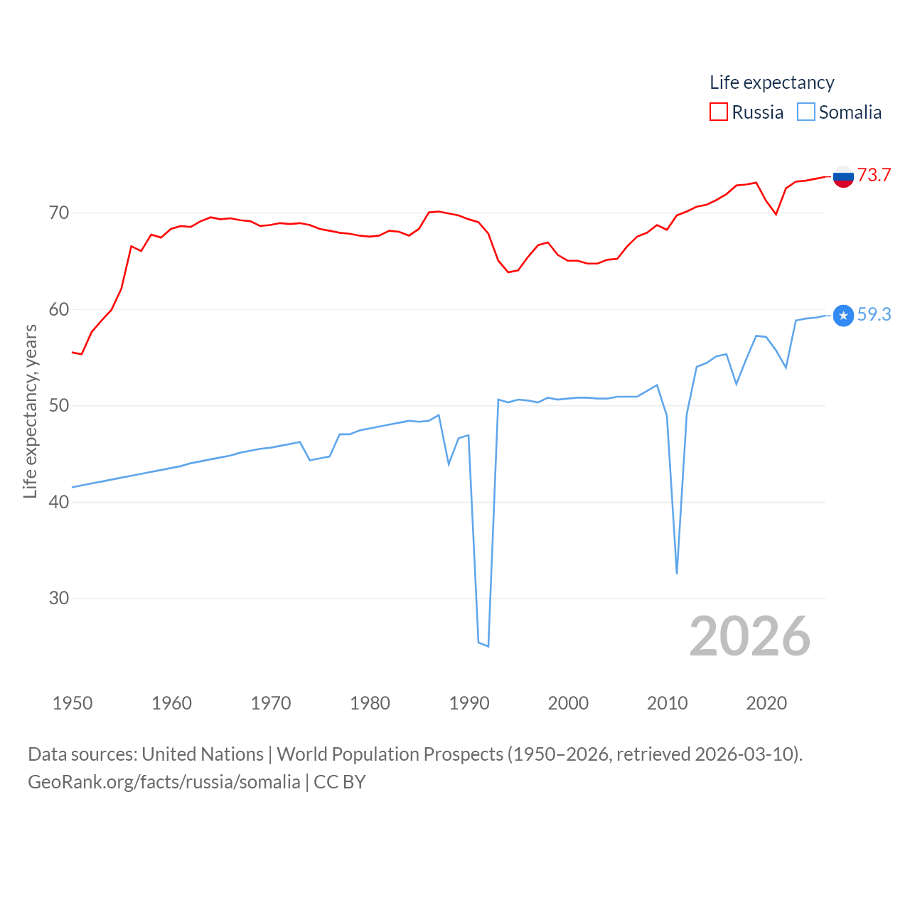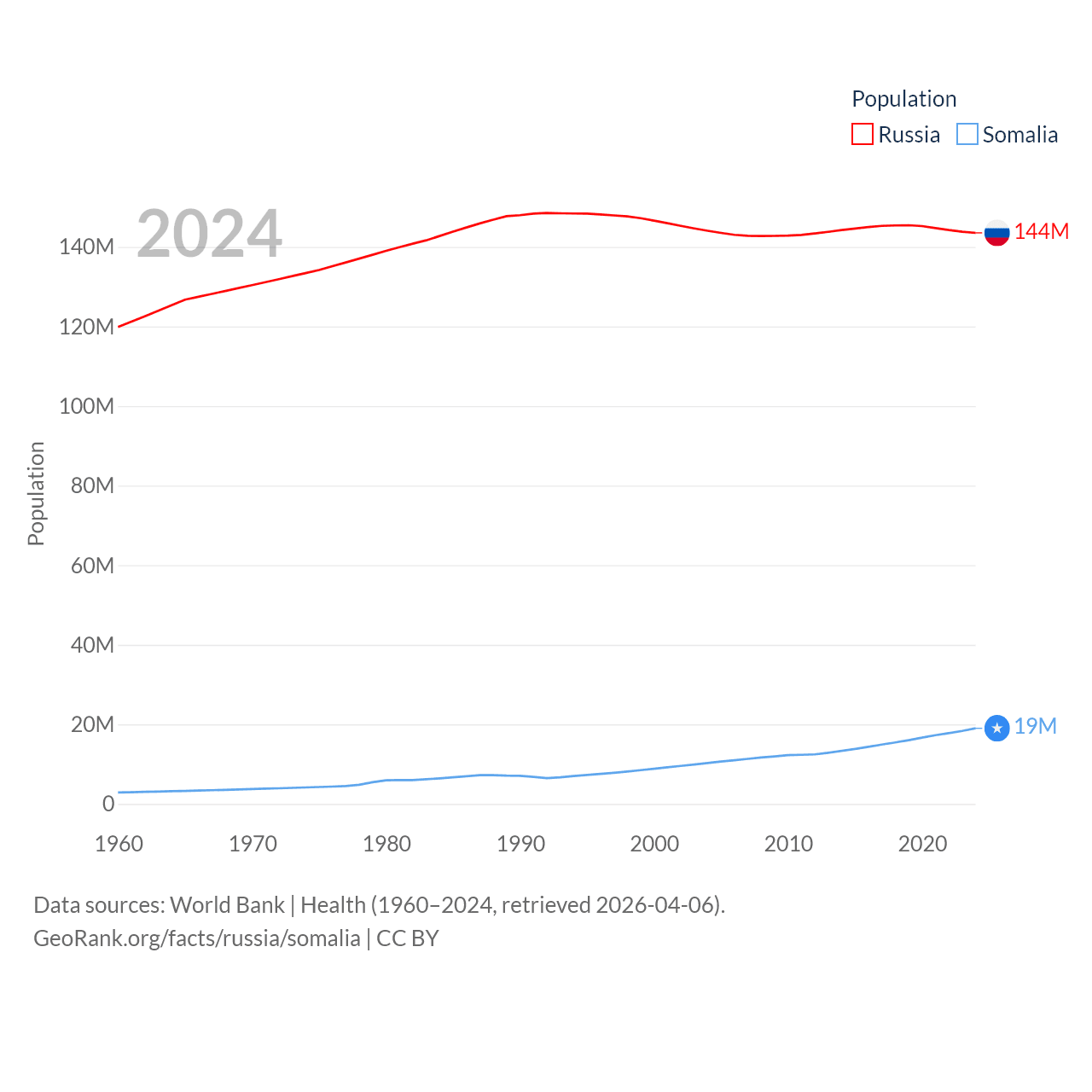 Russia has a population of 144M (ranked 9/197), compared with 19M in Somalia (ranked 68/197). Russia's land area is 6,323,145 sq mi versus 242,217 sq mi for Somalia (ranked 1st vs. 42nd).