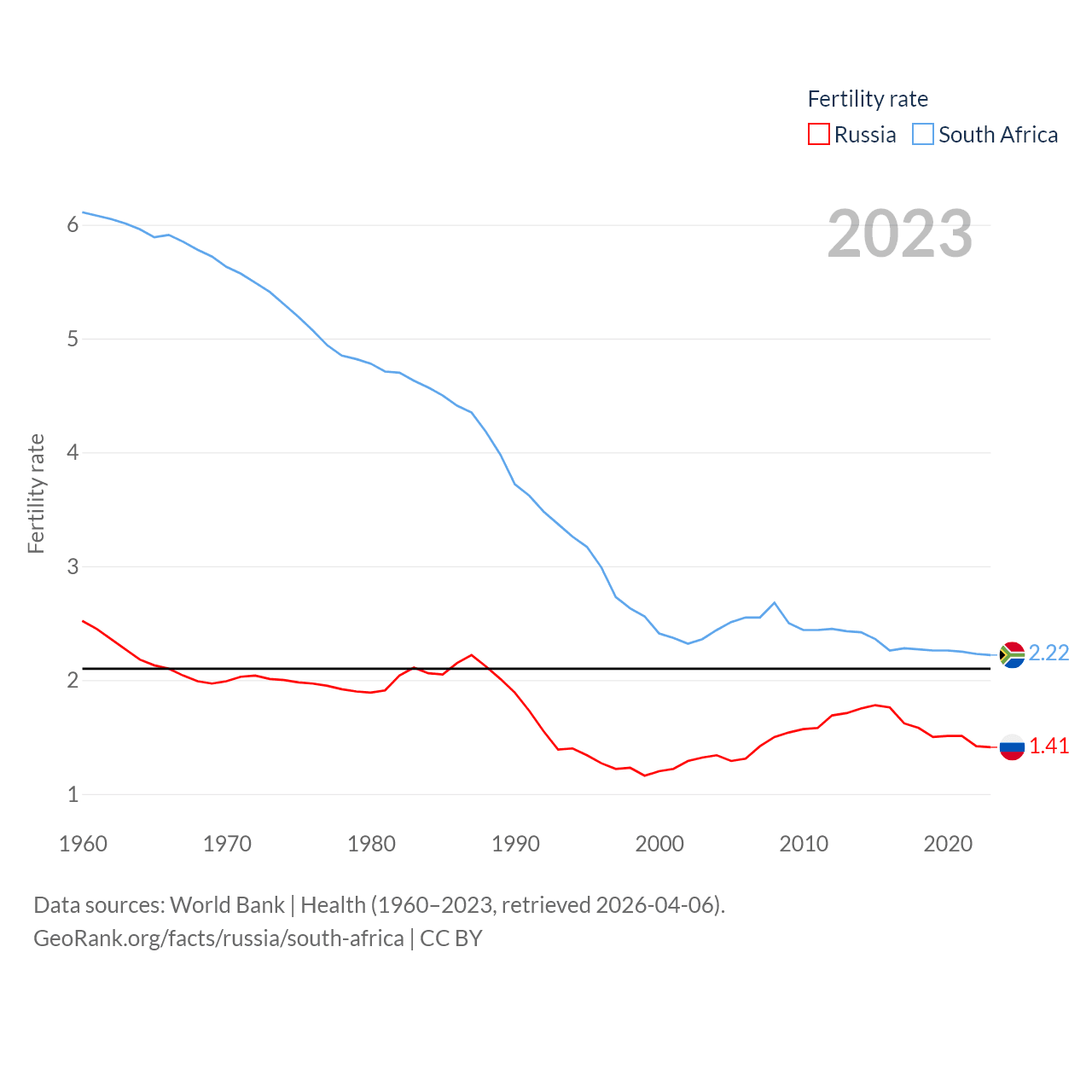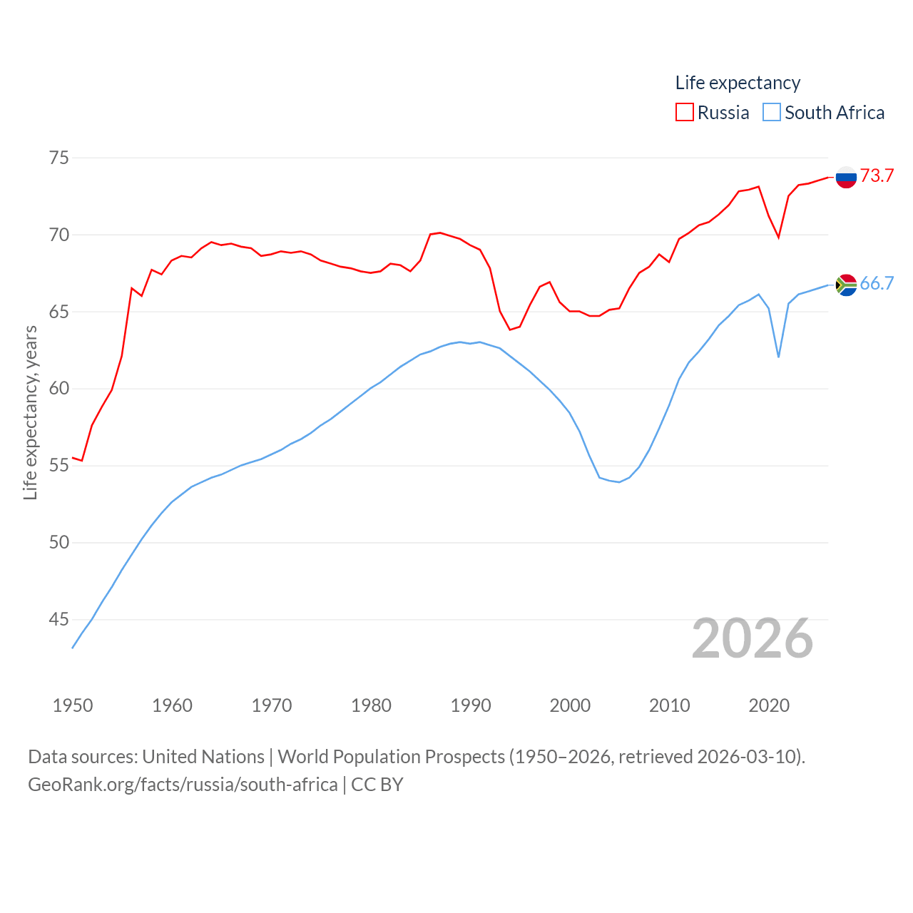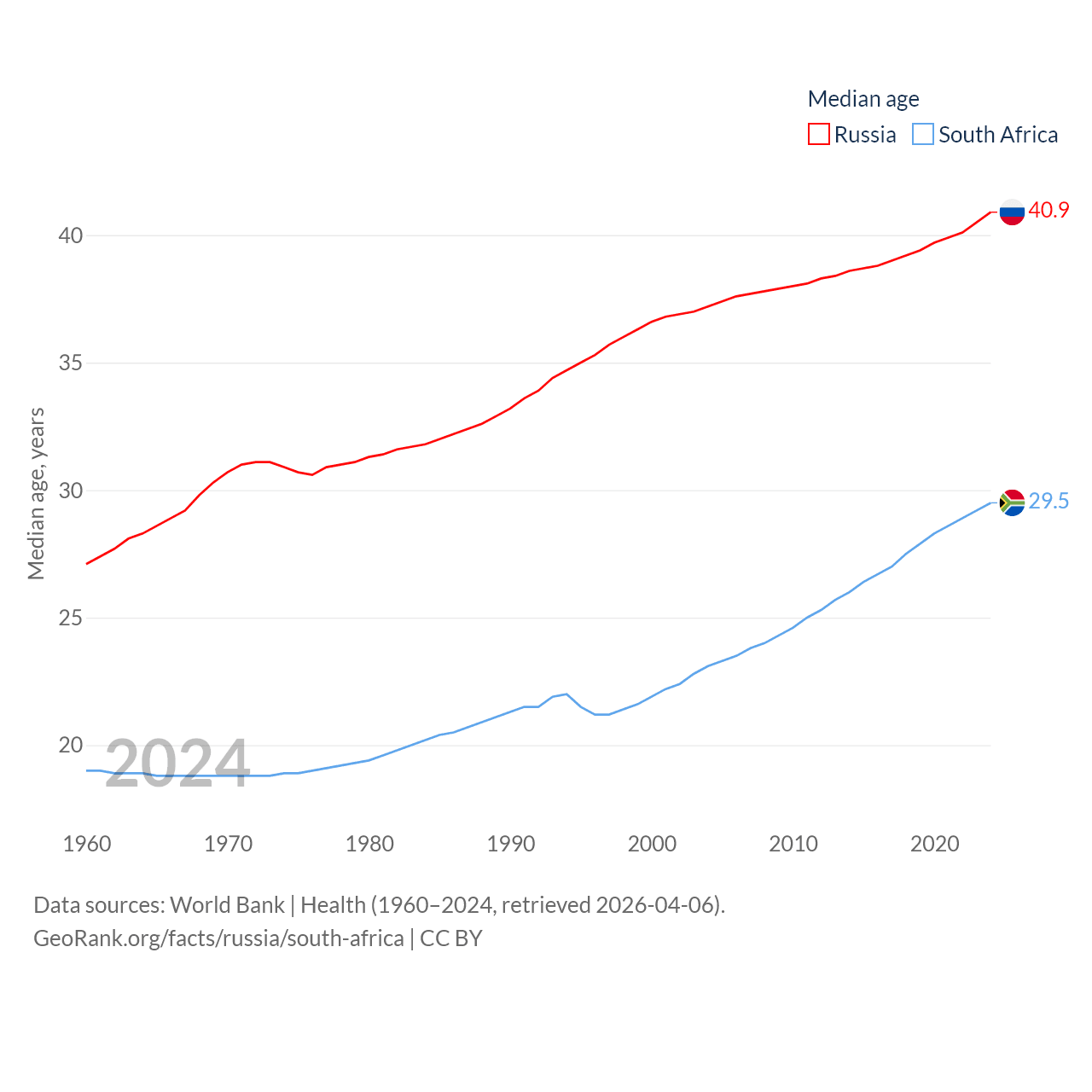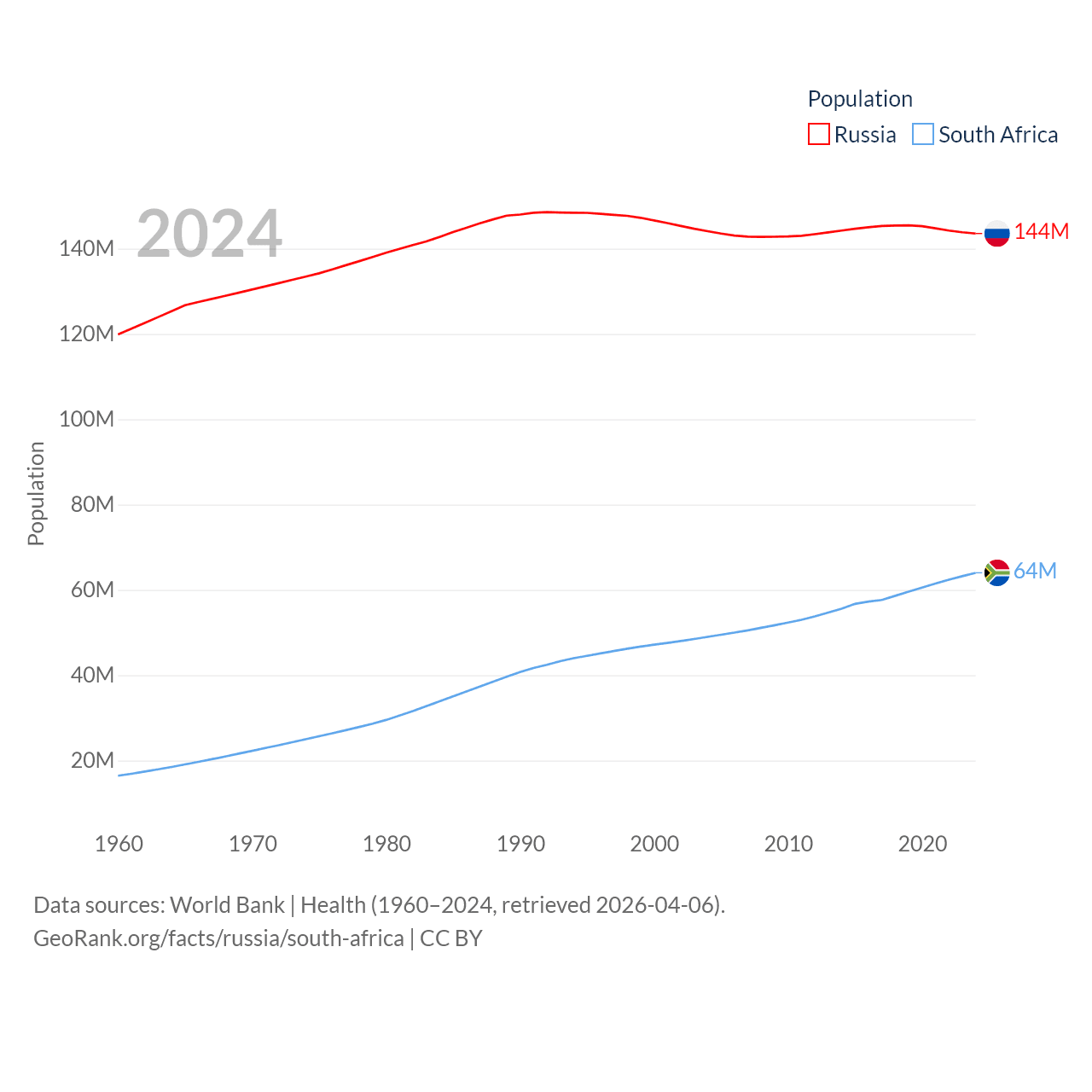 Russia has a population of 144M (ranked 9/197), compared with 64M in South Africa (ranked 24/197). Russia's land area is 6,323,145 sq mi versus 468,377 sq mi for South Africa (ranked 1st vs. 24th).