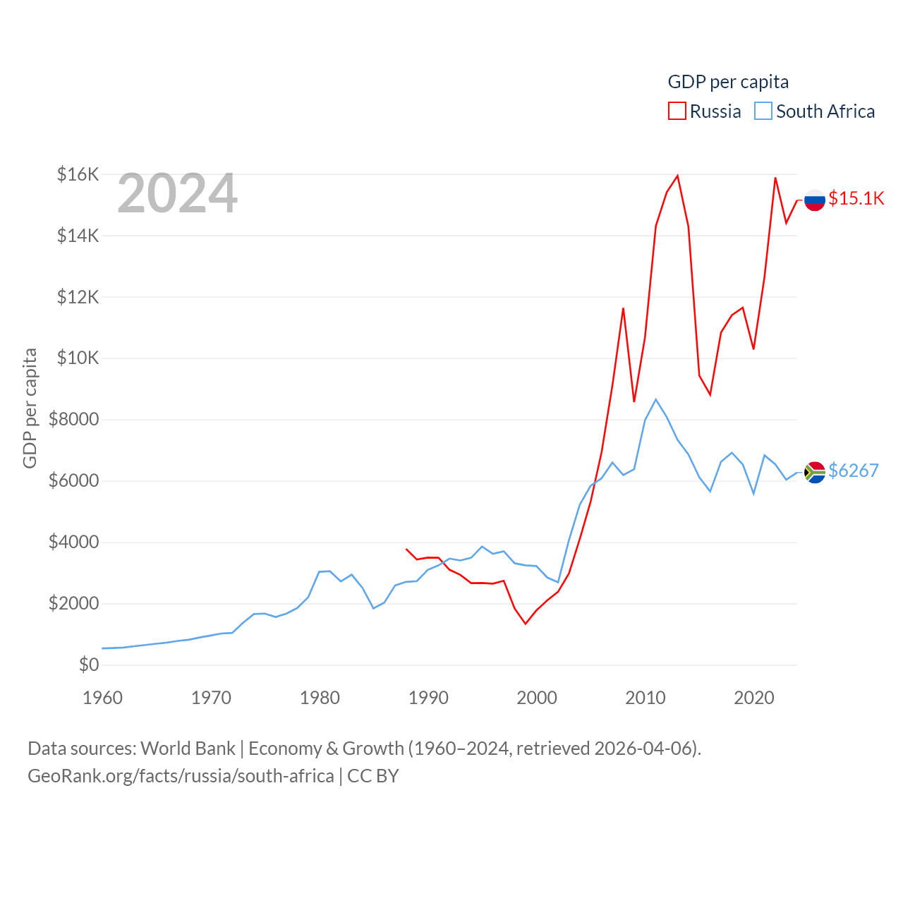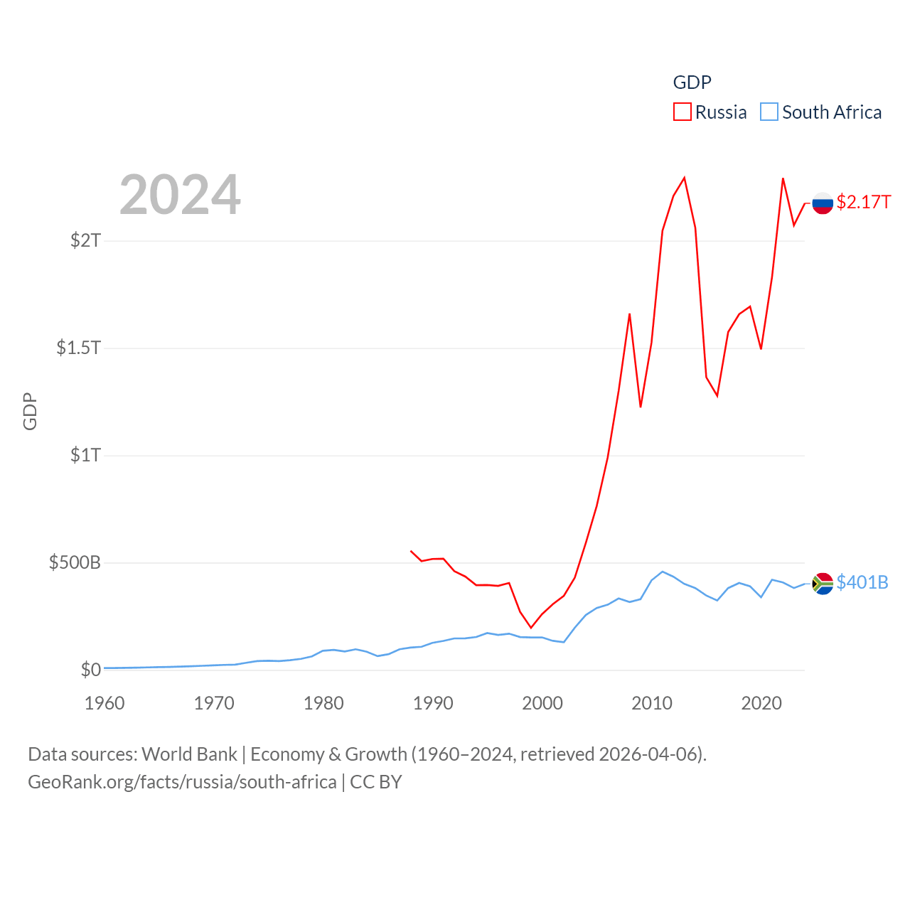 By GDP, Russia ranks 11/197 ($2.17T) and South Africa ranks 40/197 ($401B). By GDP per capita, Russia ranks 68/197 ($15,145), while South Africa ranks 111/197 ($6,267).
