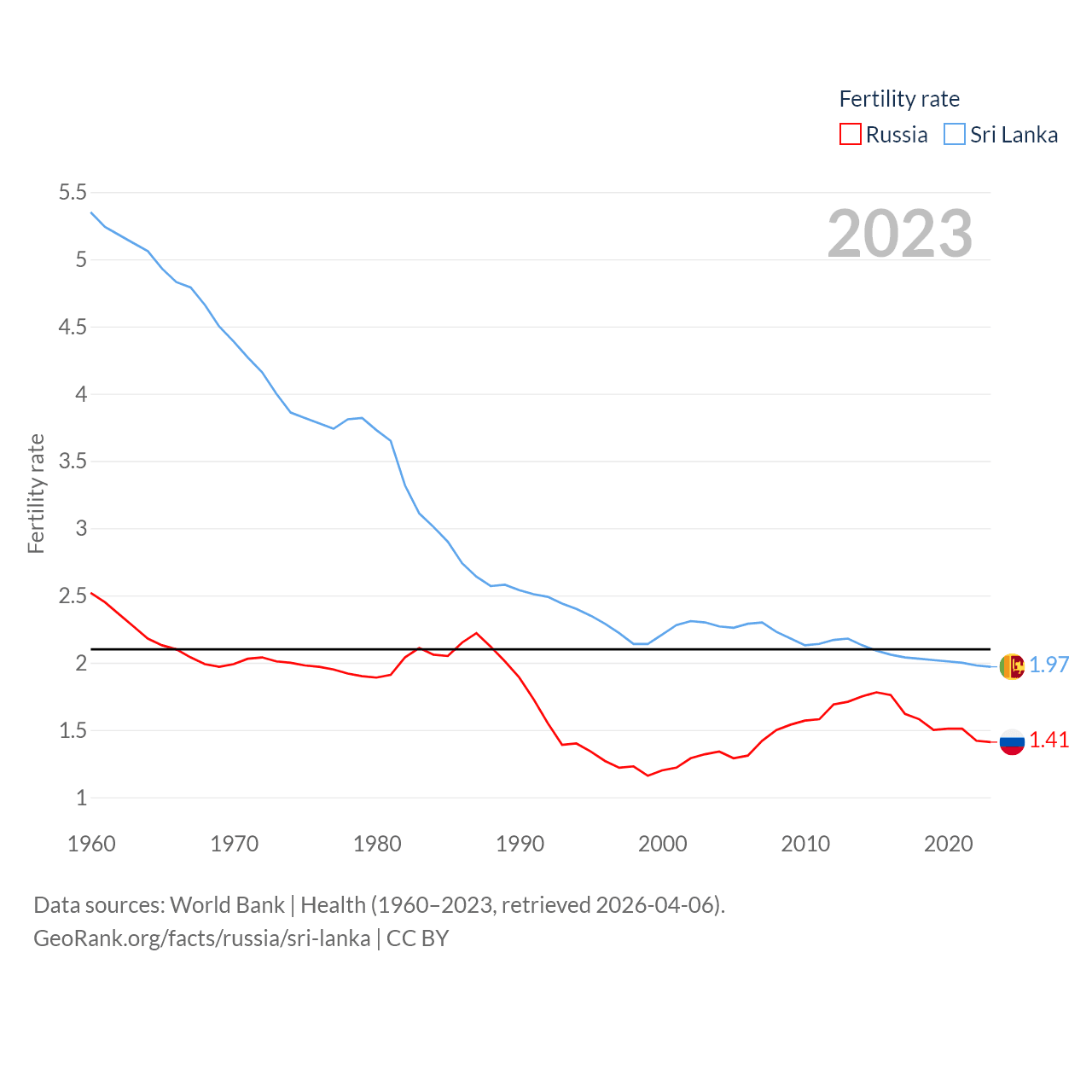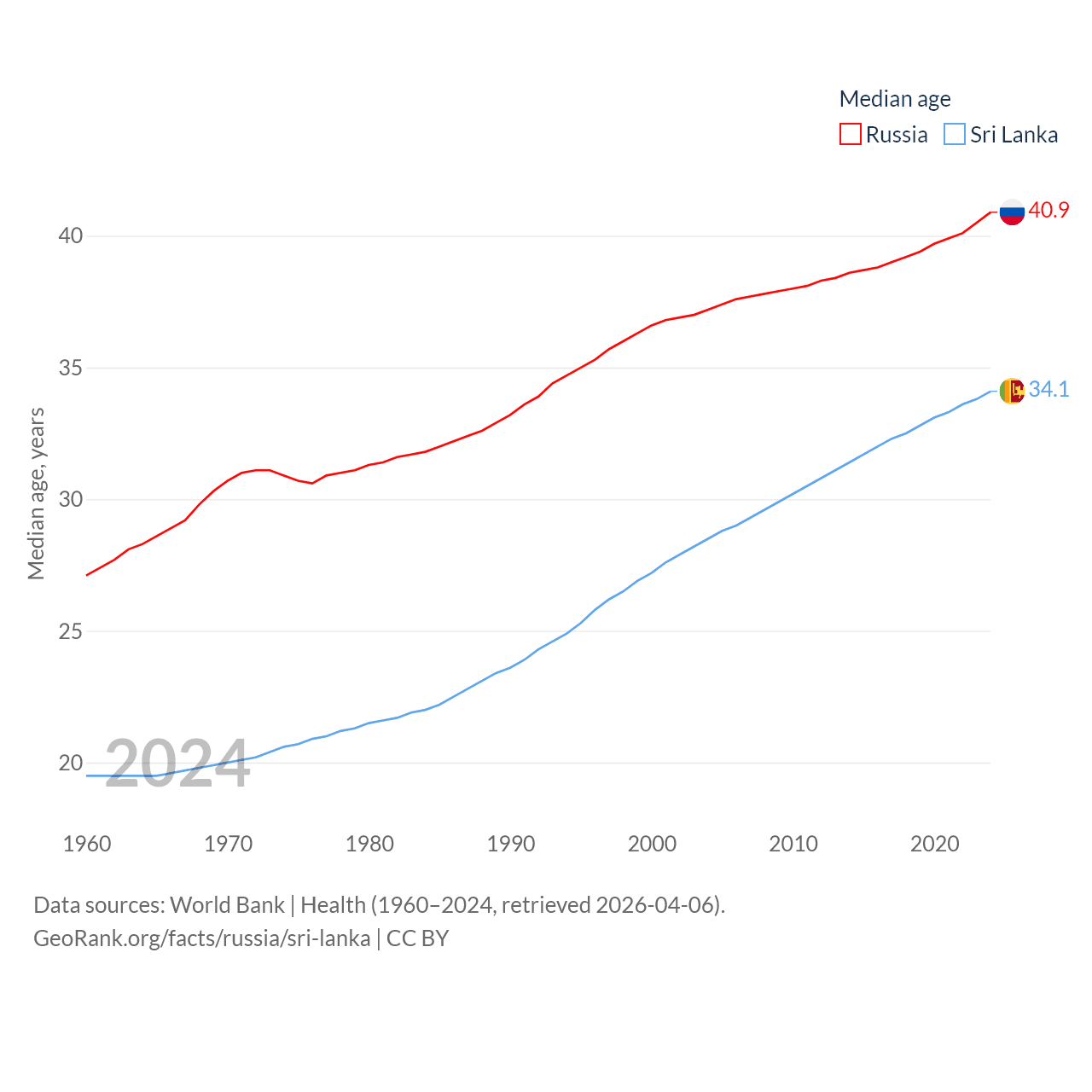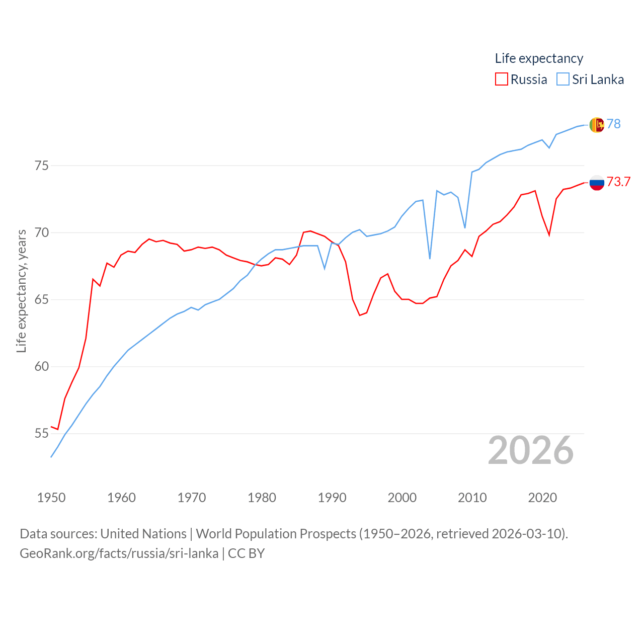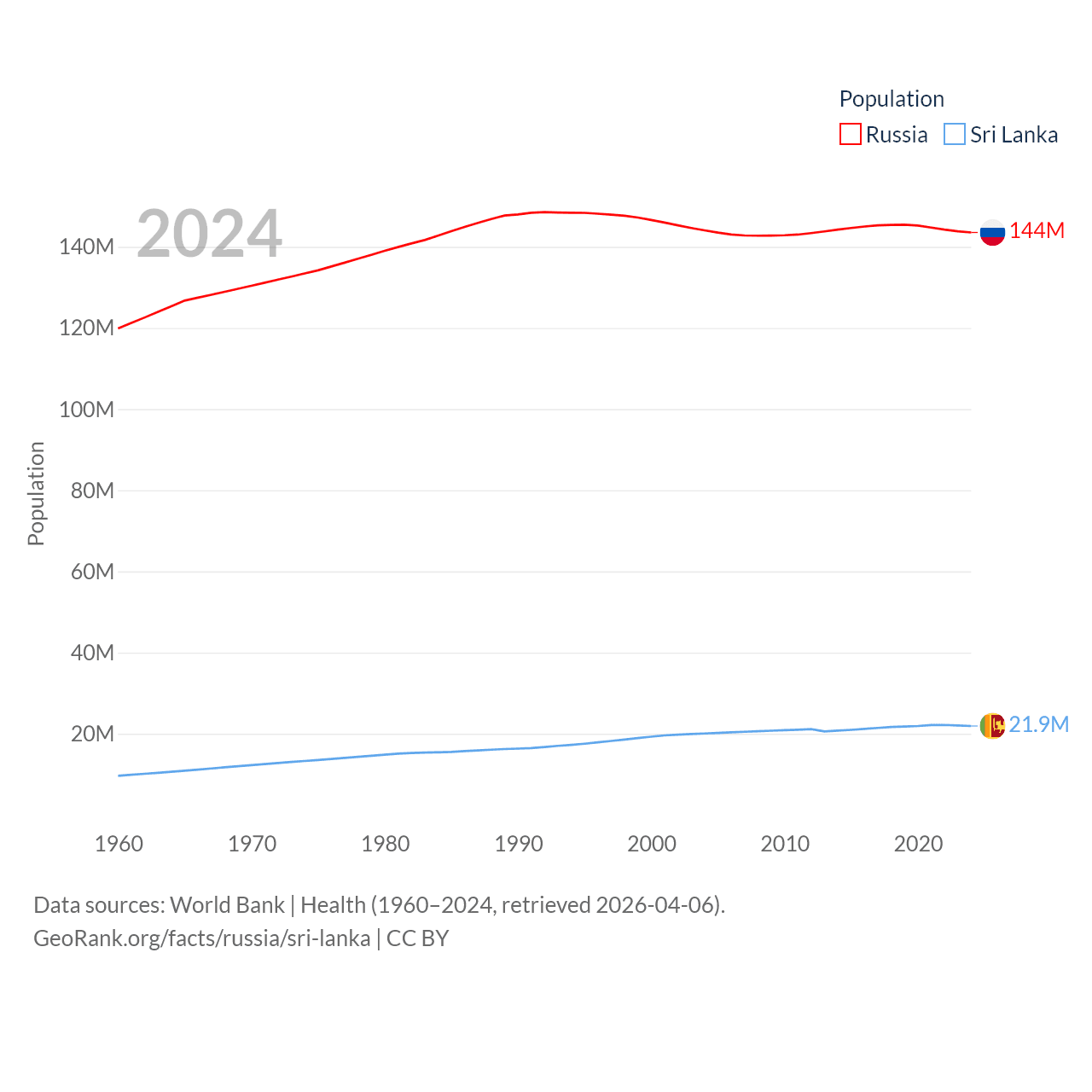 Russia has a population of 144M (ranked 9/197), compared with 21.9M in Sri Lanka (ranked 61/197). Russia's land area is 6,323,145 sq mi versus 23,884 sq mi for Sri Lanka (ranked 1st vs. 122nd).