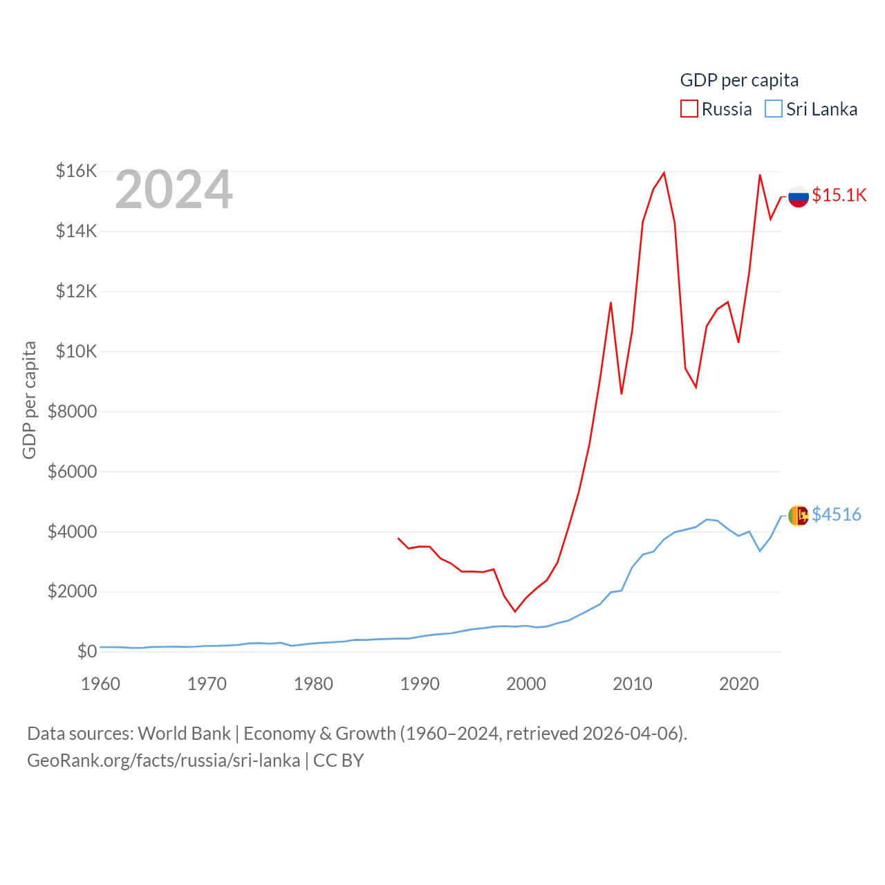 By GDP, Russia ranks 11/197 ($2.17T) and Sri Lanka ranks 72/197 ($99B). By GDP per capita, Russia ranks 68/197 ($15,145), while Sri Lanka ranks 124/197 ($4,516).