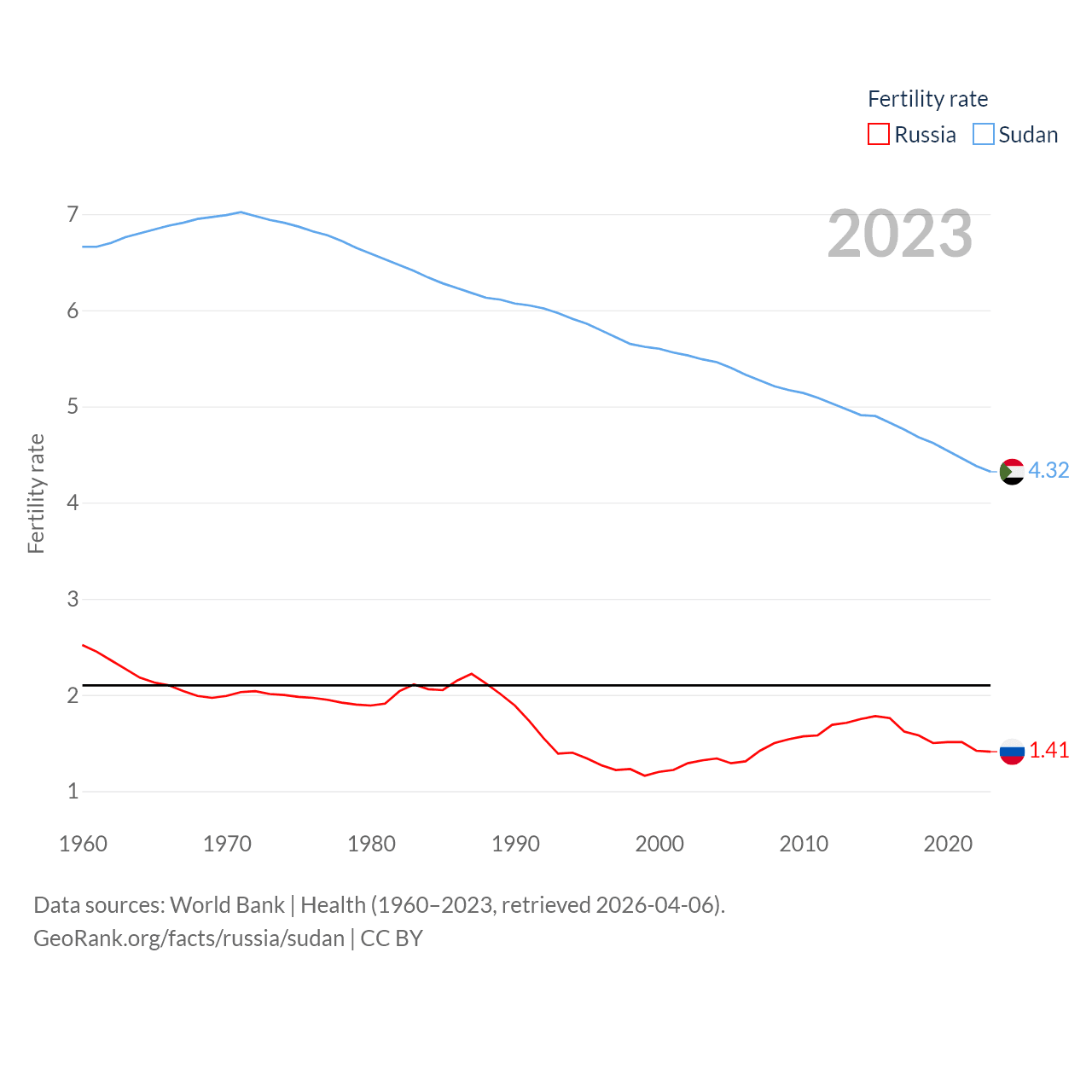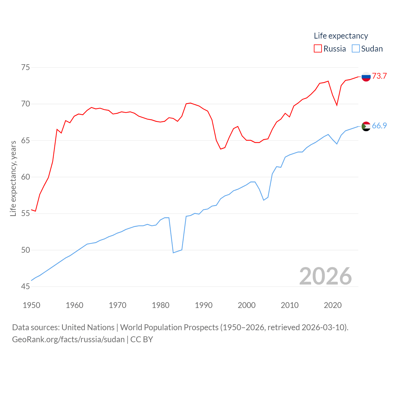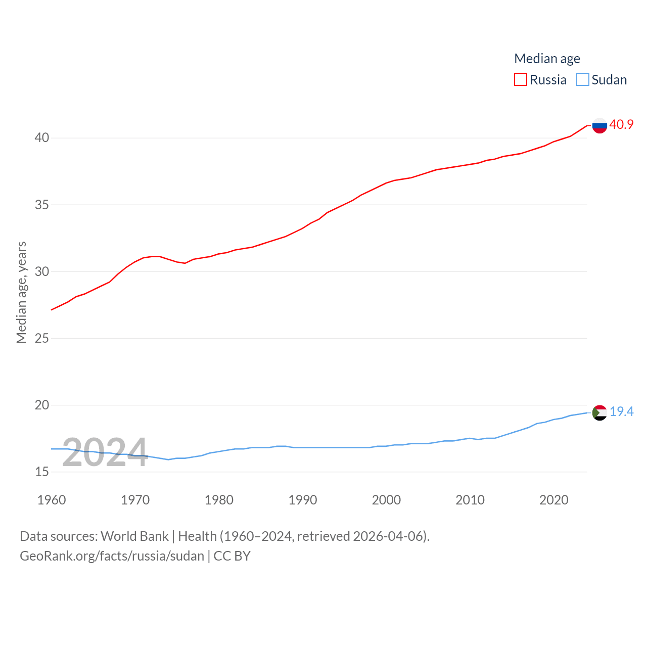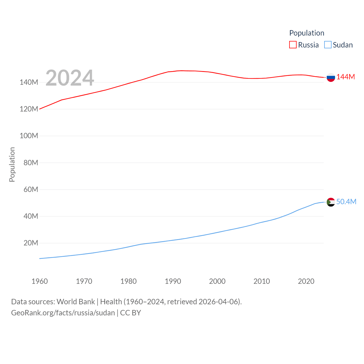 Russia has a population of 144M (ranked 9/197), compared with 50.4M in Sudan (ranked 30/197). Russia's land area is 6,323,145 sq mi versus 721,239 sq mi for Sudan (ranked 1st vs. 15th).