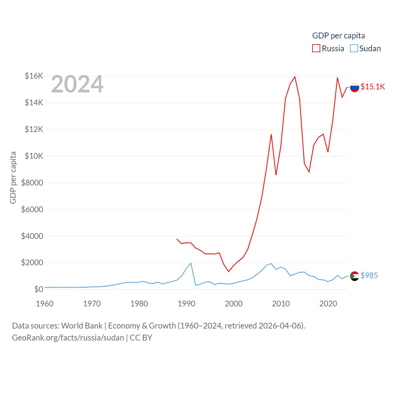 By GDP, Russia ranks 11/197 ($2.17T) and Sudan ranks 94/197 ($49.7B). By GDP per capita, Russia ranks 68/197 ($15,145), while Sudan ranks 179/197 ($985).