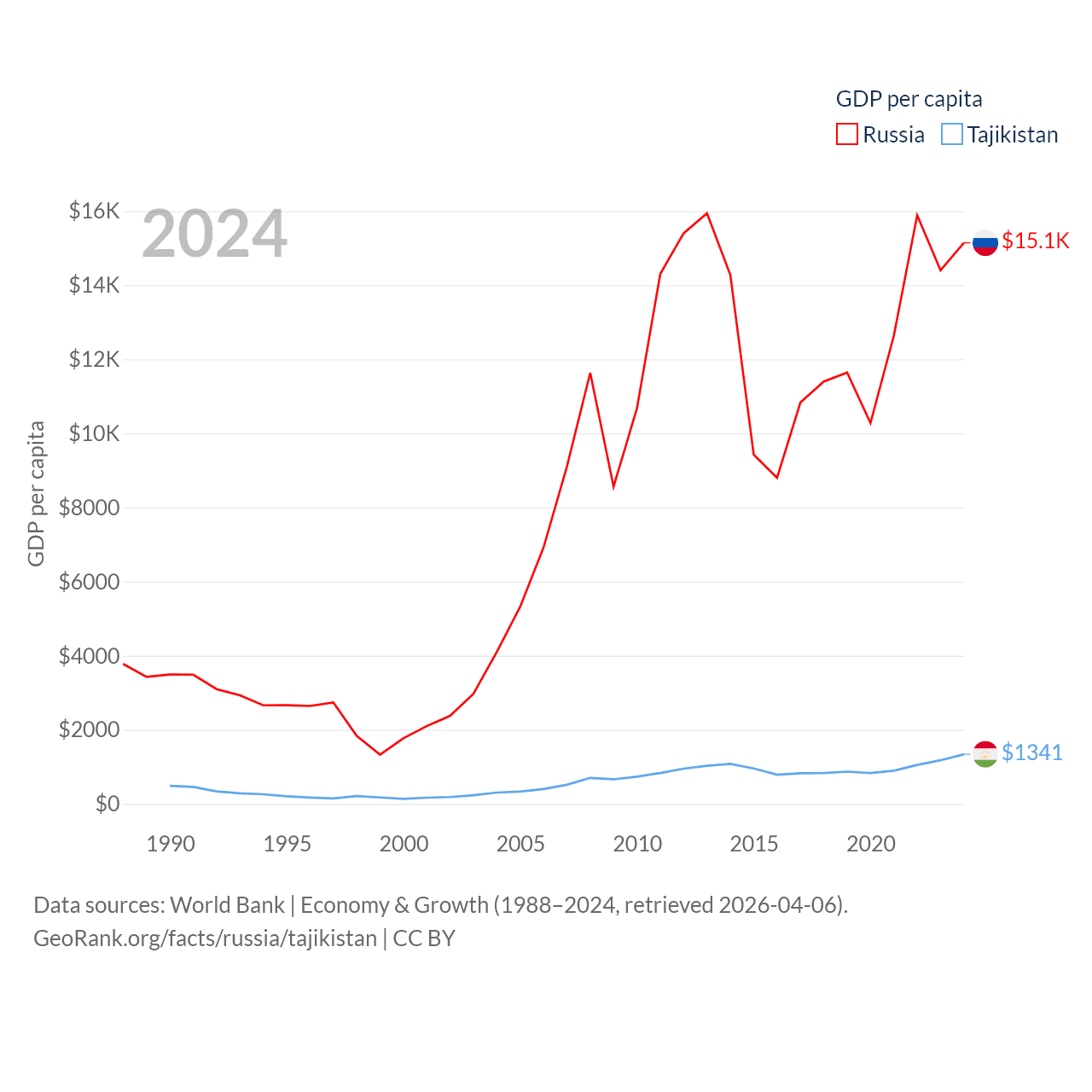 By GDP, Russia ranks 11/197 ($2.17T) and Tajikistan ranks 145/197 ($14.2B). By GDP per capita, Russia ranks 68/197 ($15,145), while Tajikistan ranks 166/197 ($1,341).