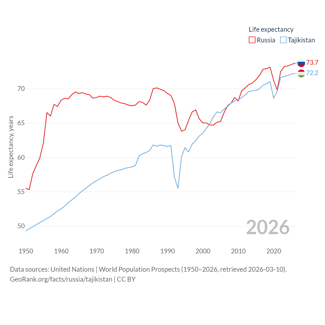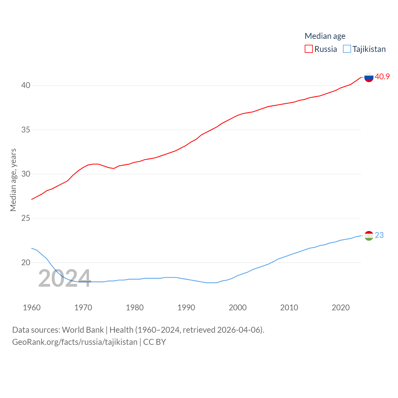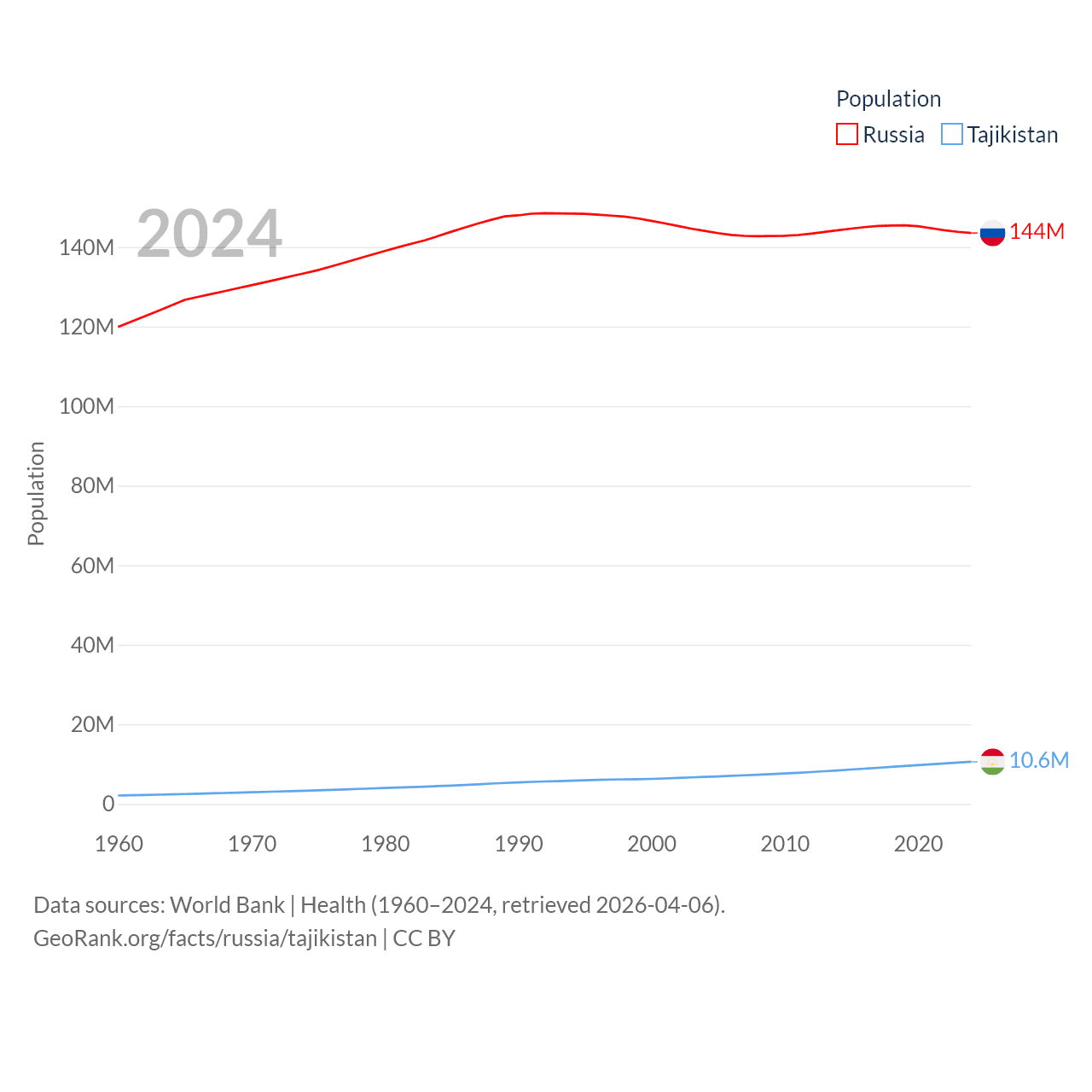 Russia has a population of 144M (ranked 9/197), compared with 10.6M in Tajikistan (ranked 91/197). Russia's land area is 6,323,145 sq mi versus 53,587 sq mi for Tajikistan (ranked 1st vs. 93rd).