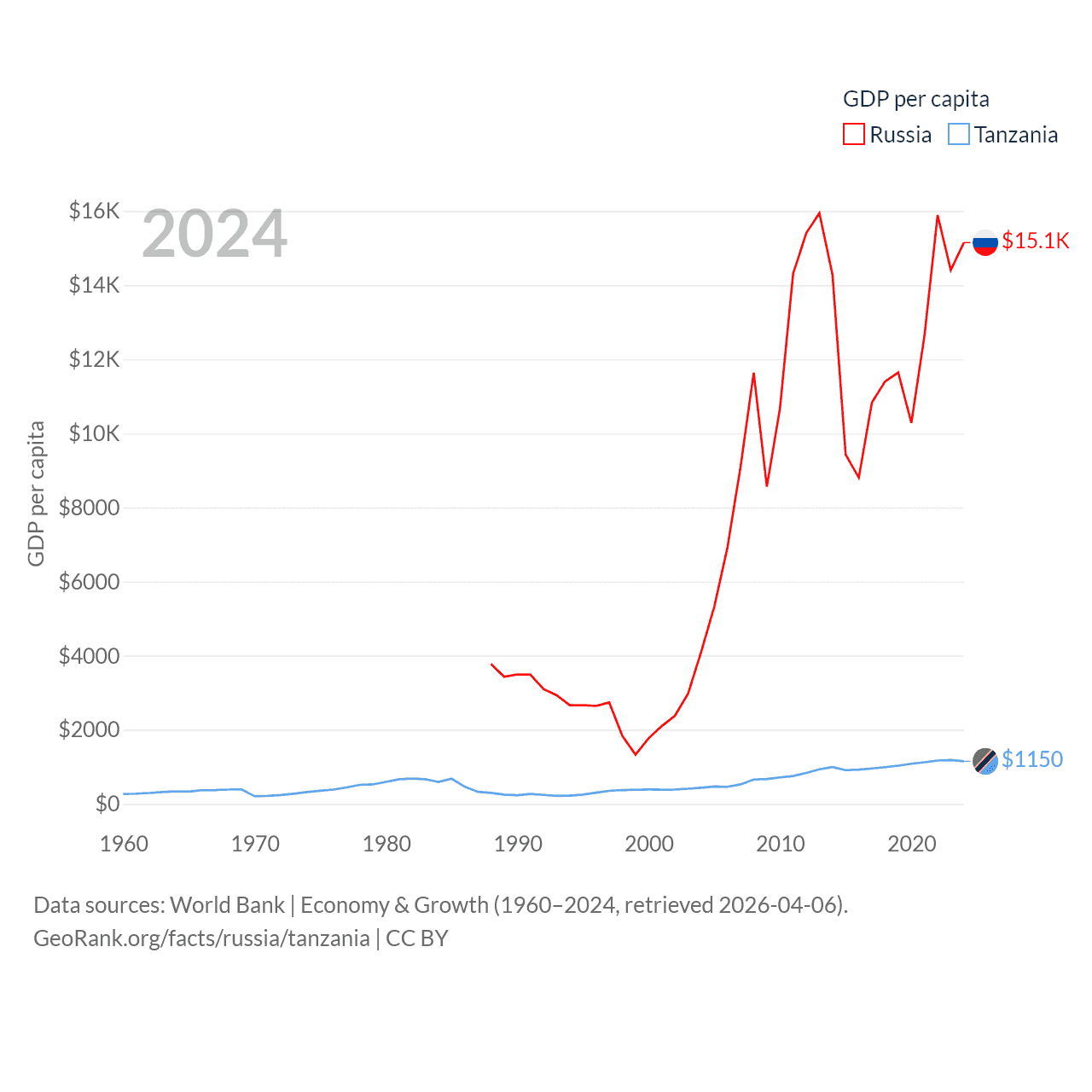 By GDP, Russia ranks 11/197 ($2.17T) and Tanzania ranks 82/197 ($78.8B). By GDP per capita, Russia ranks 68/197 ($15,145), while Tanzania ranks 170/197 ($1,150).
