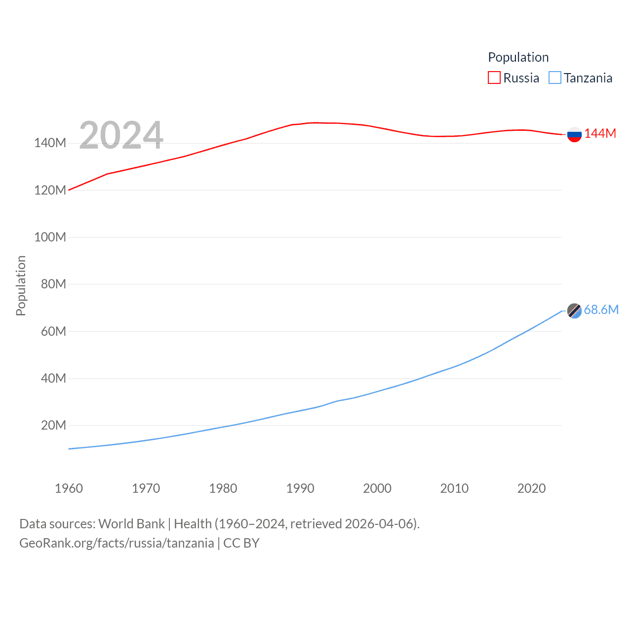 Russia has a population of 144M (ranked 9/197), compared with 68.6M in Tanzania (ranked 22/197). Russia's land area is 6,323,145 sq mi versus 342,009 sq mi for Tanzania (ranked 1st vs. 31st).