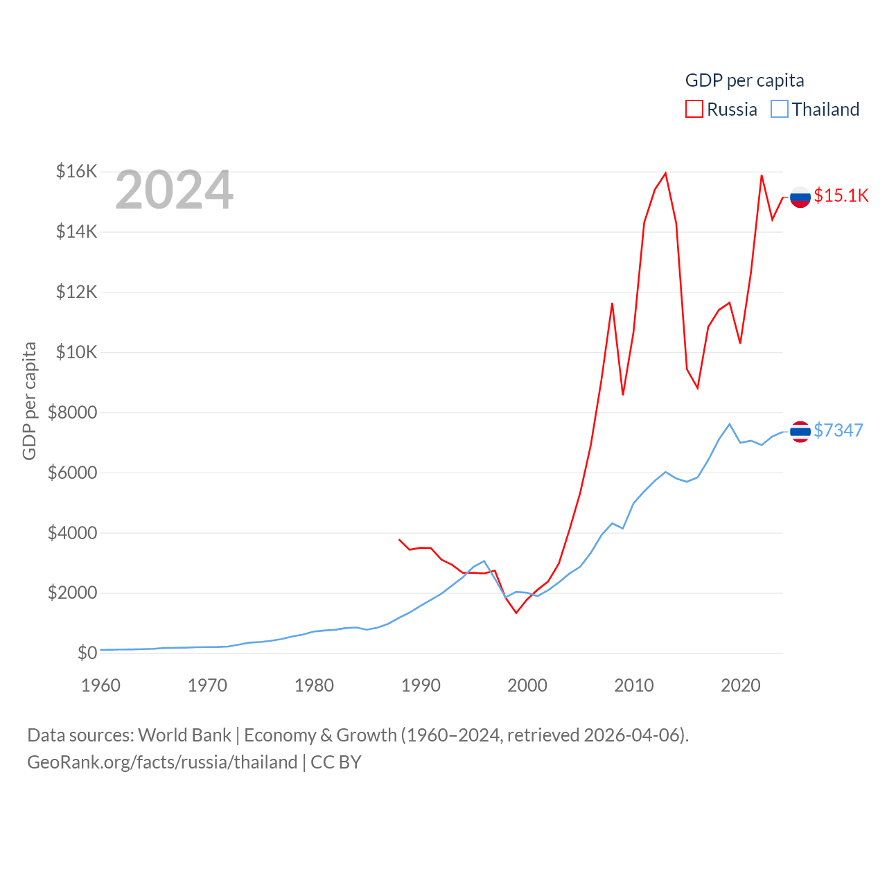 By GDP, Russia ranks 11/197 ($2.17T) and Thailand ranks 31/197 ($527B). By GDP per capita, Russia ranks 68/197 ($15,145), while Thailand ranks 100/197 ($7,347).