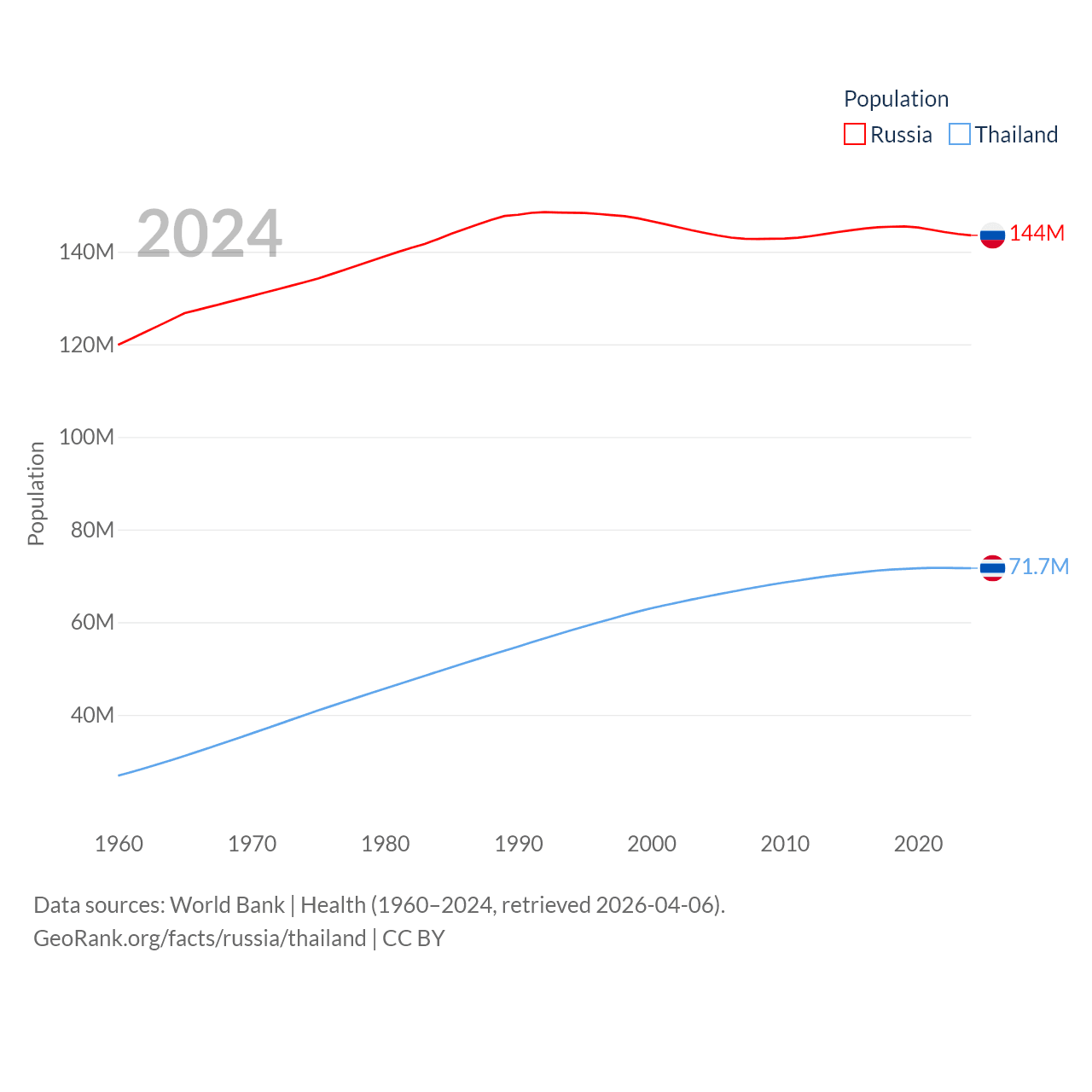 Russia has a population of 144M (ranked 9/197), compared with 71.7M in Thailand (ranked 20/197). Russia's land area is 6,323,145 sq mi versus 197,256 sq mi for Thailand (ranked 1st vs. 50th).