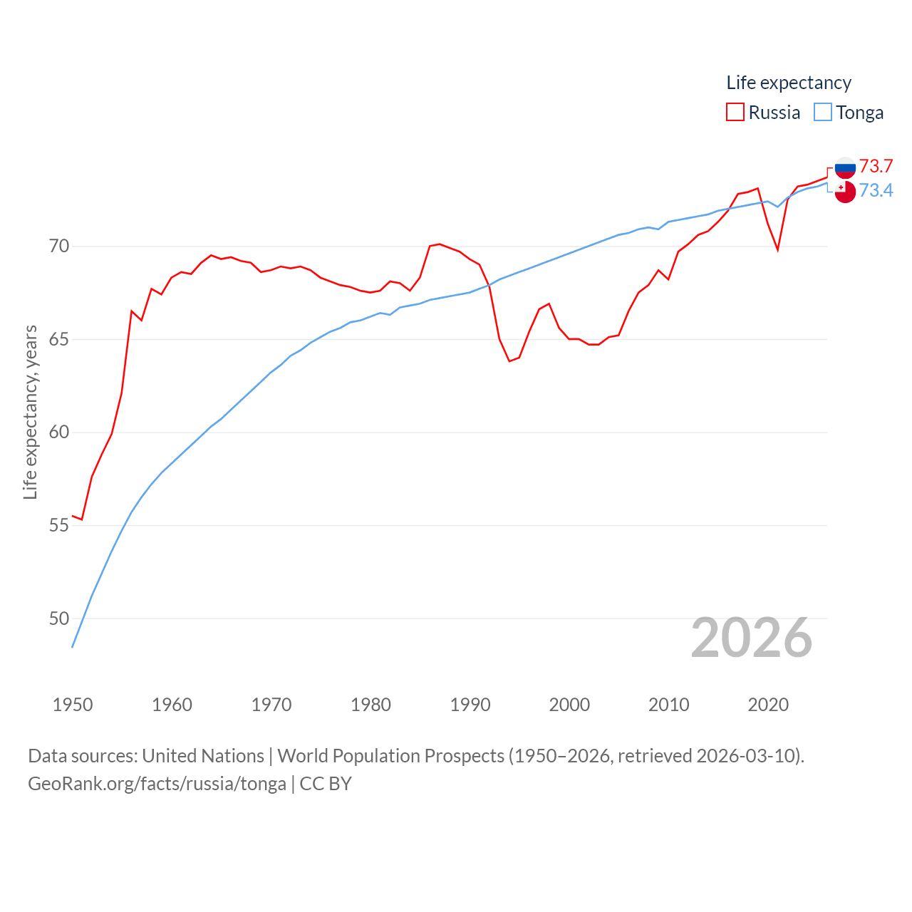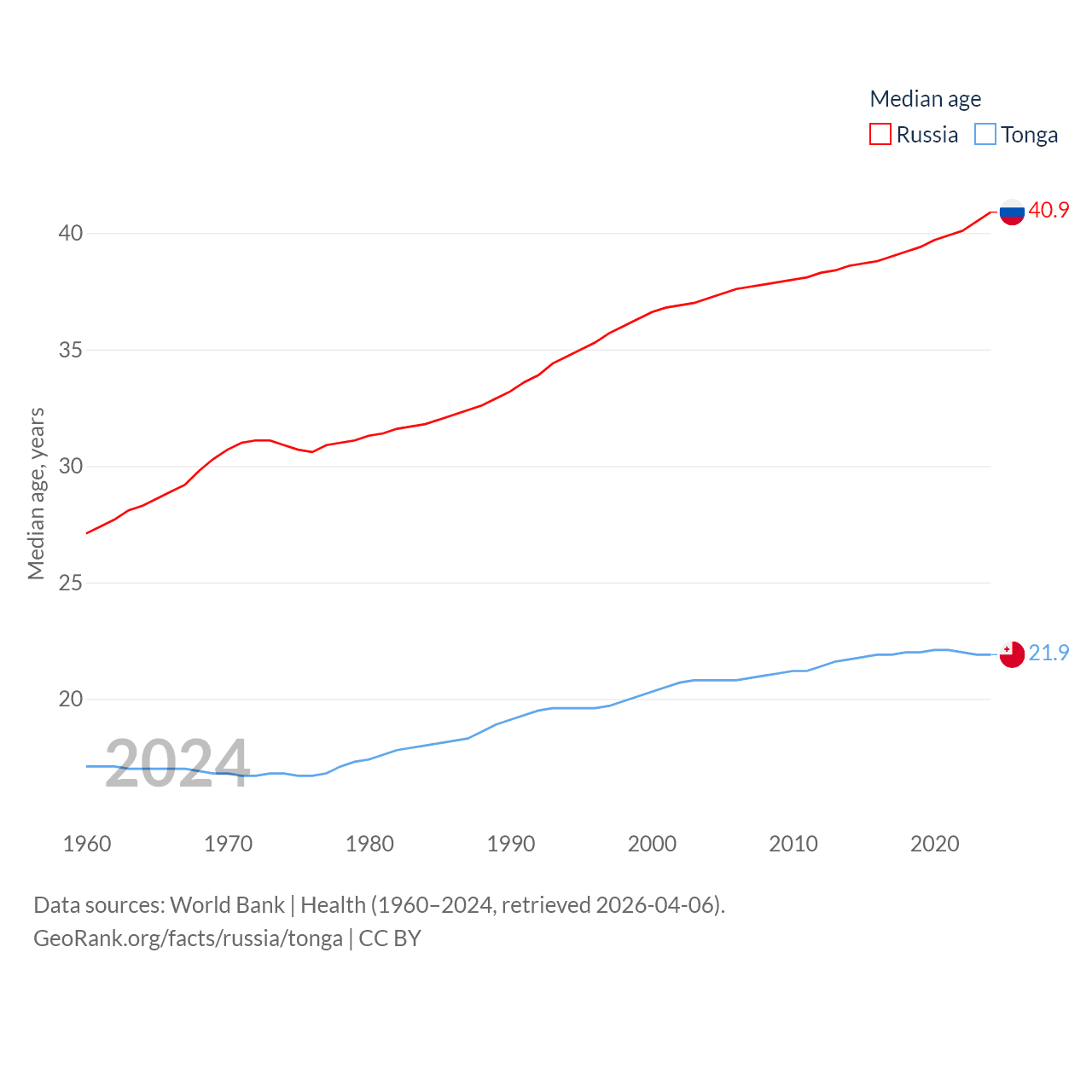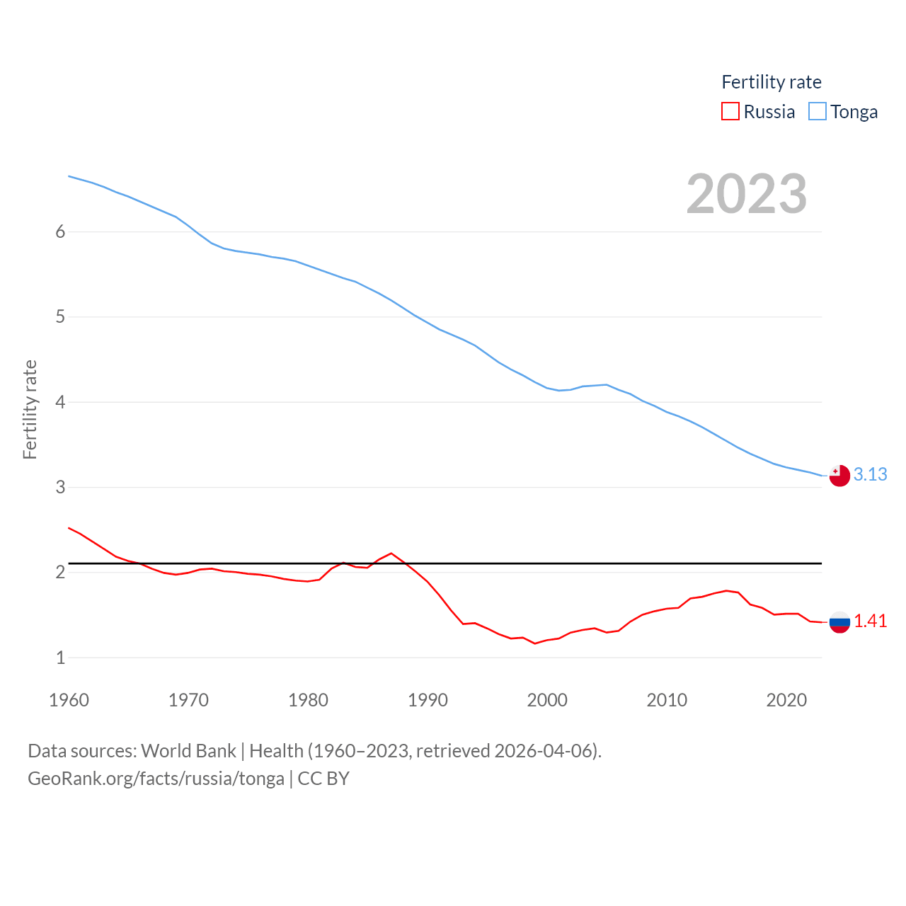 Russia has a population of 144M (ranked 9/197), compared with 104K in Tonga (ranked 183/197). Russia's land area is 6,323,145 sq mi versus 278 sq mi for Tonga (ranked 1st vs. 176th).