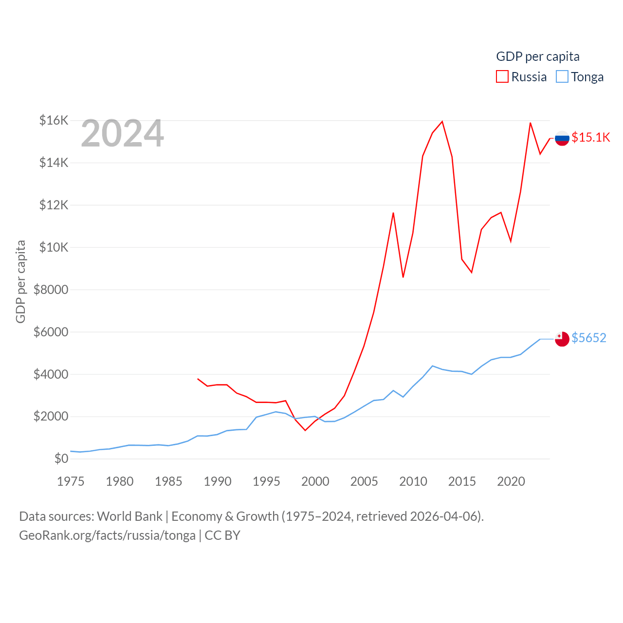 By GDP, Russia ranks 11/197 ($2.17T) and Tonga ranks 191/197 ($591M). By GDP per capita, Russia ranks 68/197 ($15,145), while Tonga ranks 115/197 ($5,652).