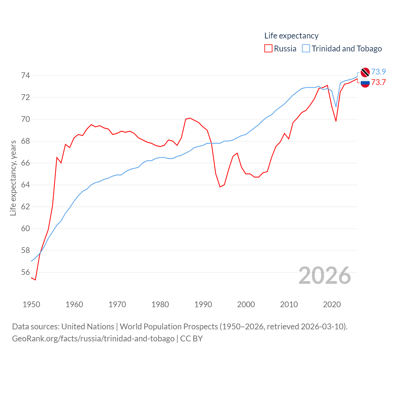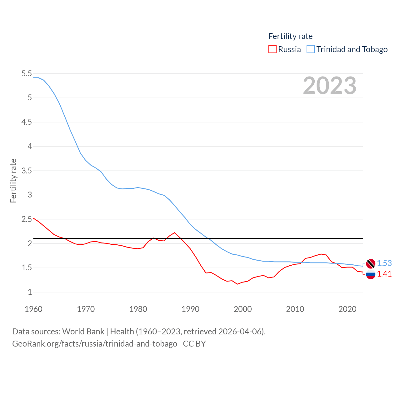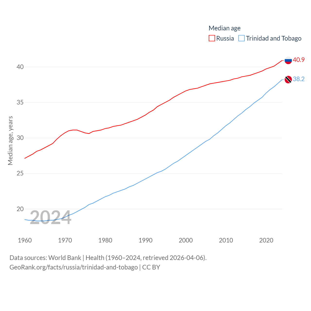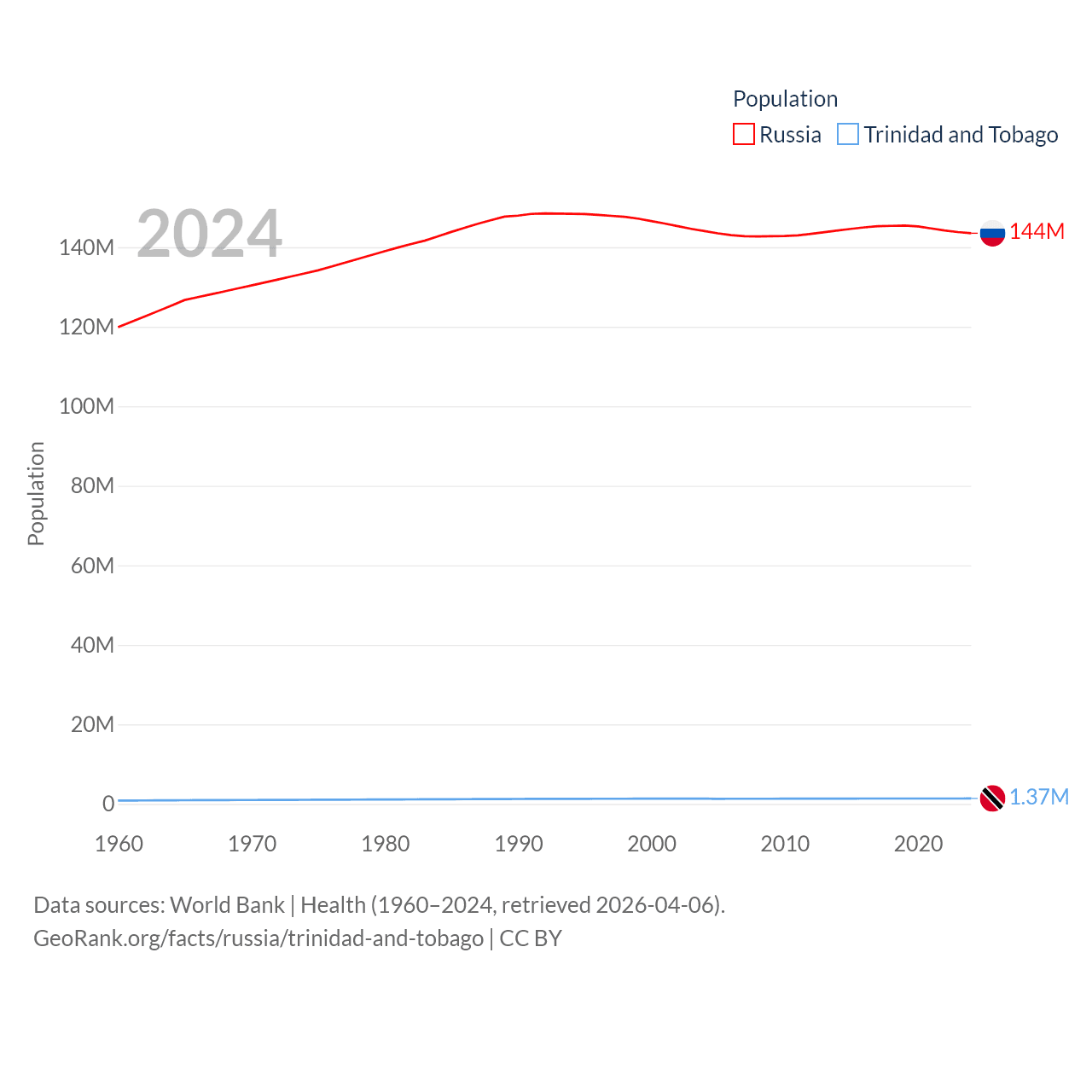 Russia has a population of 144M (ranked 9/197), compared with 1.37M in Trinidad and Tobago (ranked 154/197). Russia's land area is 6,323,145 sq mi versus 1,981 sq mi for Trinidad and Tobago (ranked 1st vs. 166th).