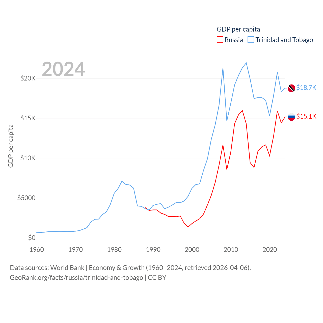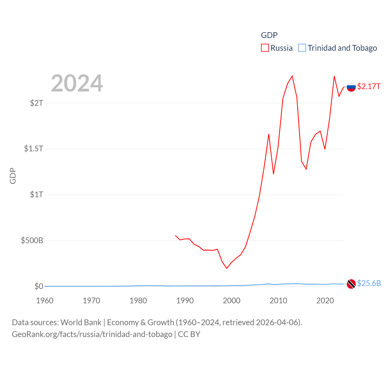 By GDP, Russia ranks 11/197 ($2.17T) and Trinidad and Tobago ranks 115/197 ($25.6B). By GDP per capita, Russia ranks 68/197 ($15,145), while Trinidad and Tobago ranks 61/197 ($18,733).