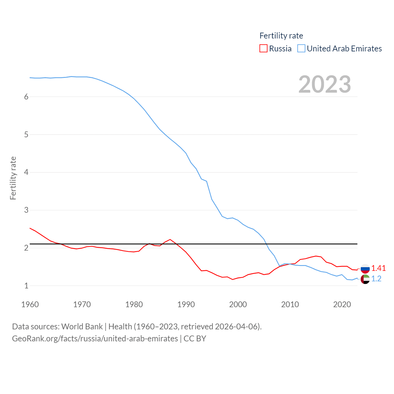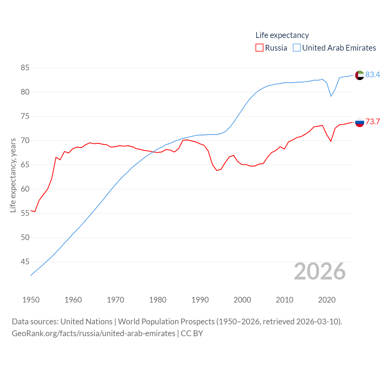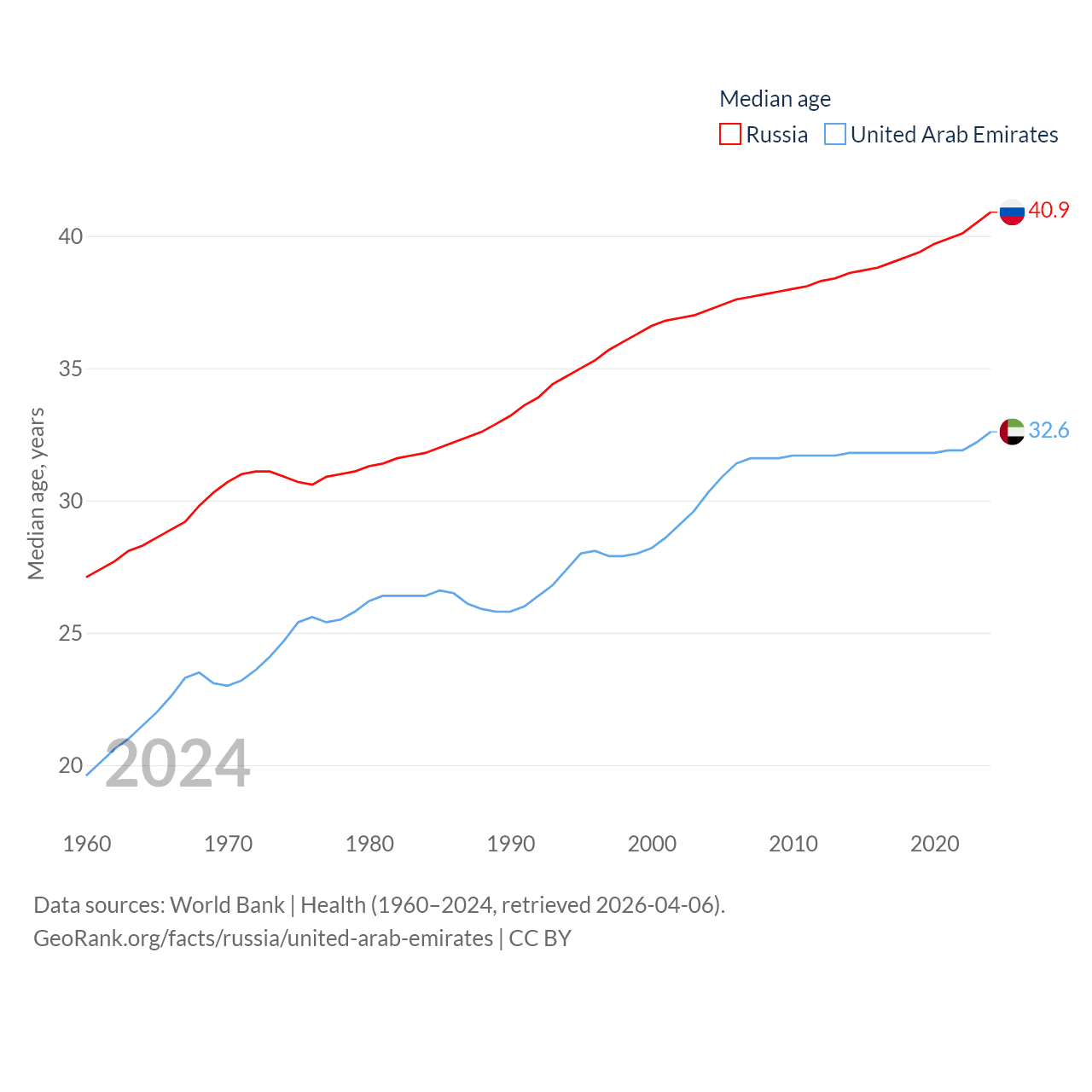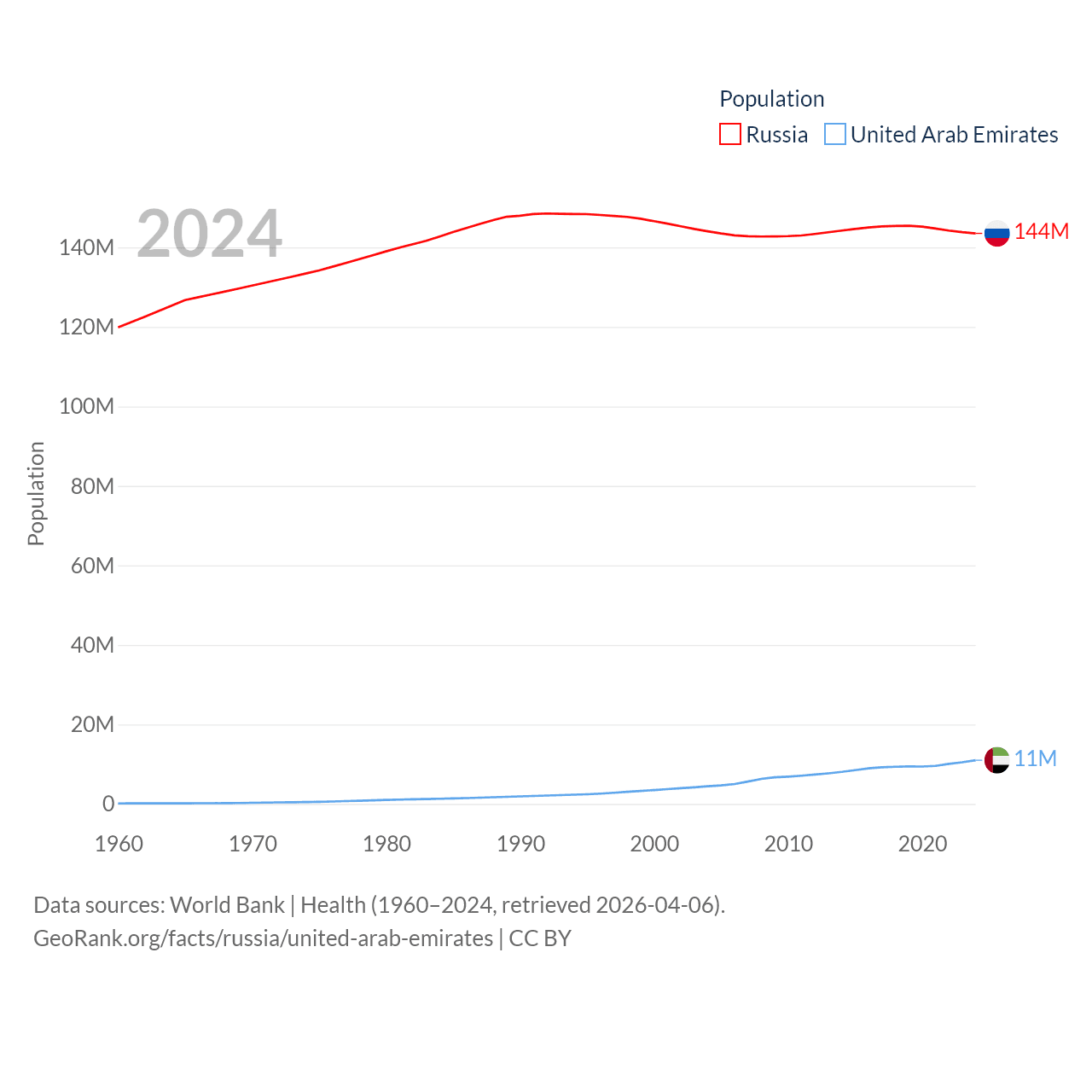 Russia has a population of 144M (ranked 9/197), compared with 11M in The United Arab Emirates (ranked 86/197). Russia's land area is 6,323,145 sq mi versus 27,421 sq mi for The United Arab Emirates (ranked 1st vs. 117th).