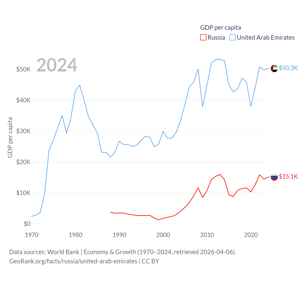 By GDP, Russia ranks 11/197 ($2.17T) and The United Arab Emirates ranks 27/197 ($552B). By GDP per capita, Russia ranks 68/197 ($15,145), while The United Arab Emirates ranks 24/197 ($50,274).