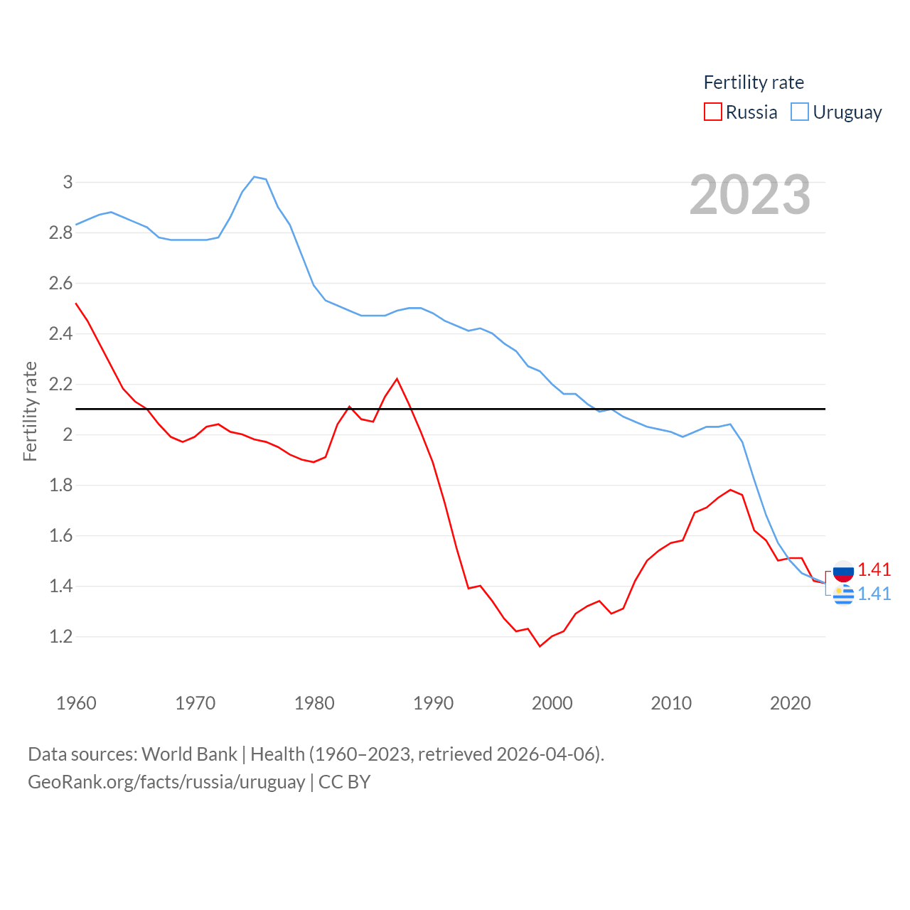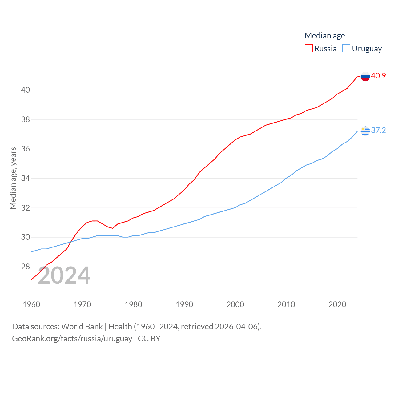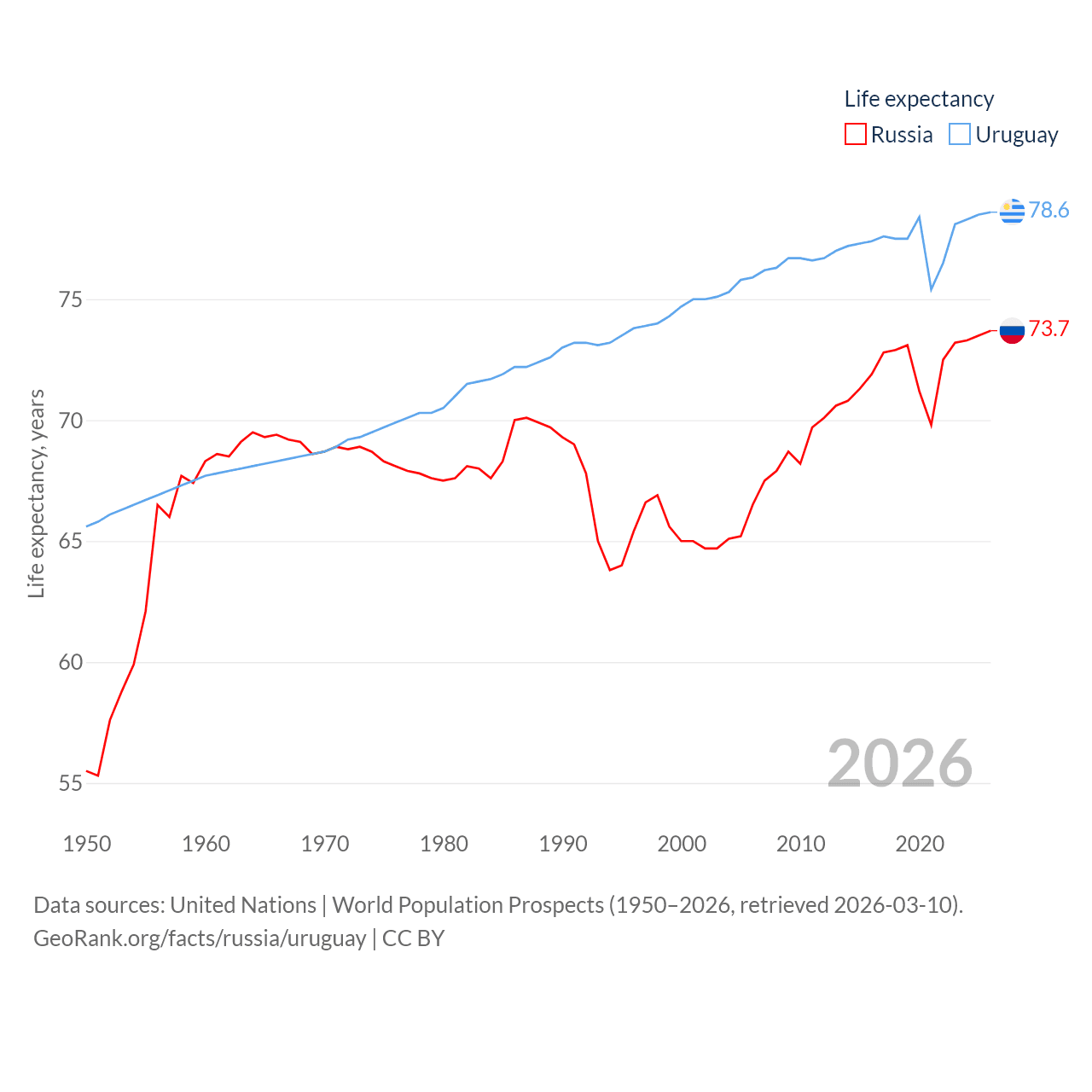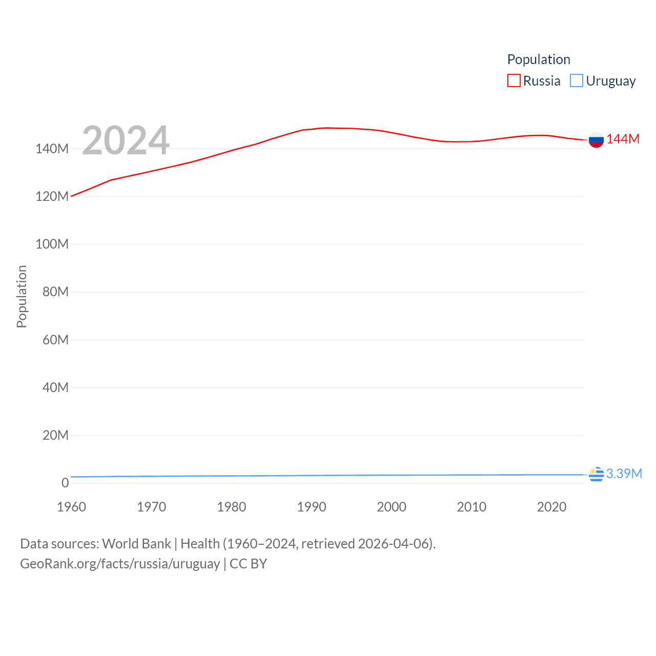Russia has a population of 144M (ranked 9/197), compared with 3.39M in Uruguay (ranked 133/197). Russia's land area is 6,323,145 sq mi versus 67,576 sq mi for Uruguay (ranked 1st vs. 89th).