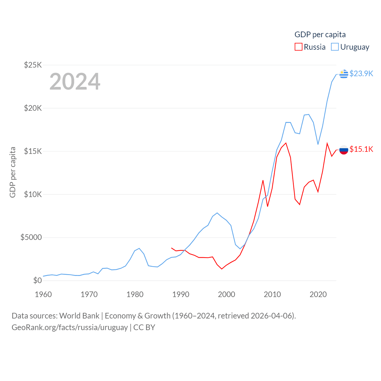 By GDP, Russia ranks 11/197 ($2.17T) and Uruguay ranks 81/197 ($81B). By GDP per capita, Russia ranks 68/197 ($15,145), while Uruguay ranks 52/197 ($23,907).