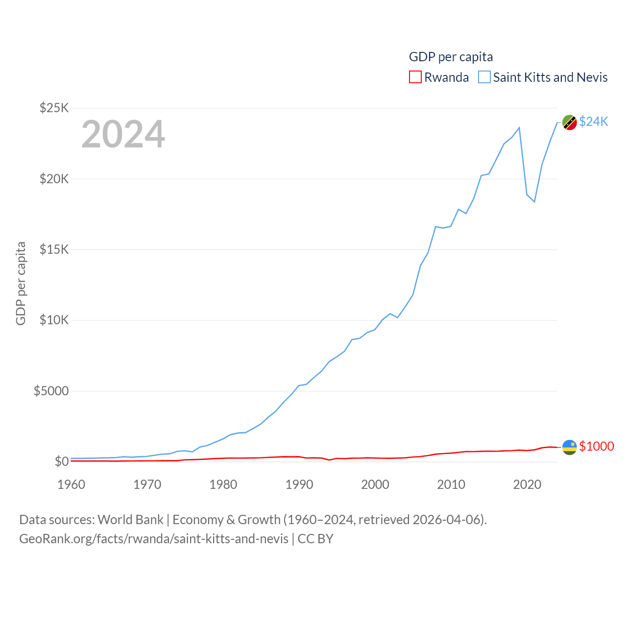 By GDP, Rwanda ranks 144/197 ($14.3B) and Saint Kitts and Nevis ranks 187/197 ($1.12B). By GDP per capita, Rwanda ranks 178/197 ($1,000), while Saint Kitts and Nevis ranks 51/197 ($23,961).