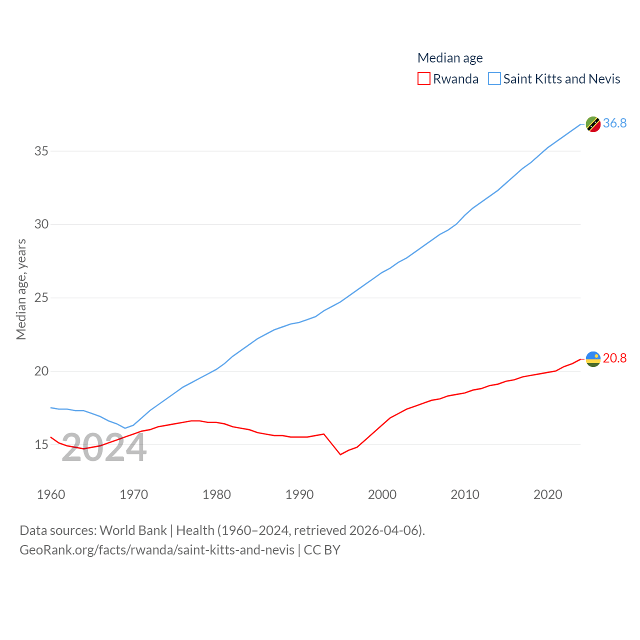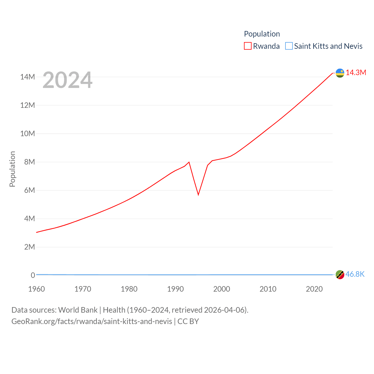 Rwanda has a population of 14.3M (ranked 77/197), compared with 46.8K in Saint Kitts and Nevis (ranked 189/197). Rwanda's land area is 9,525 sq mi versus 100.4 sq mi for Saint Kitts and Nevis (ranked 146th vs. 189th).