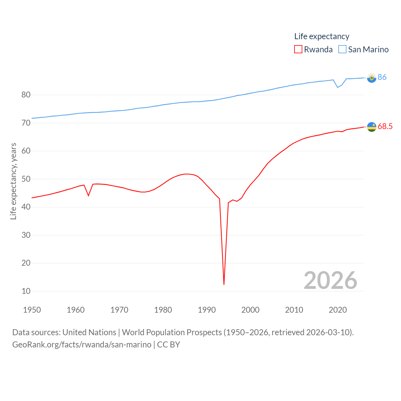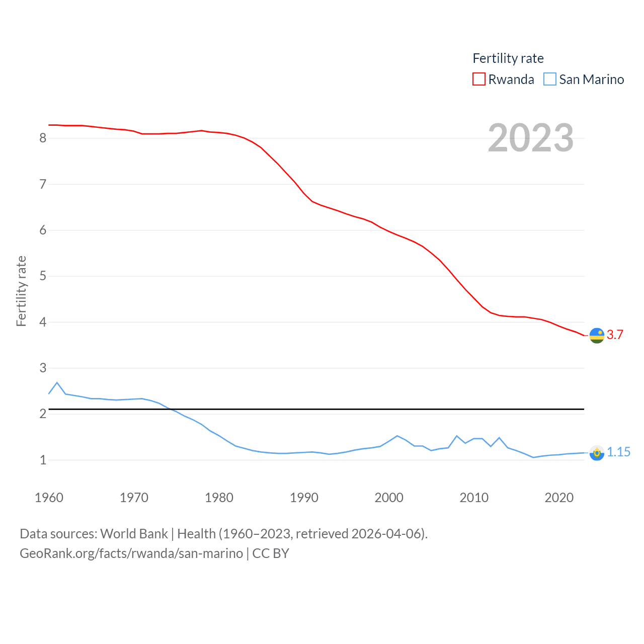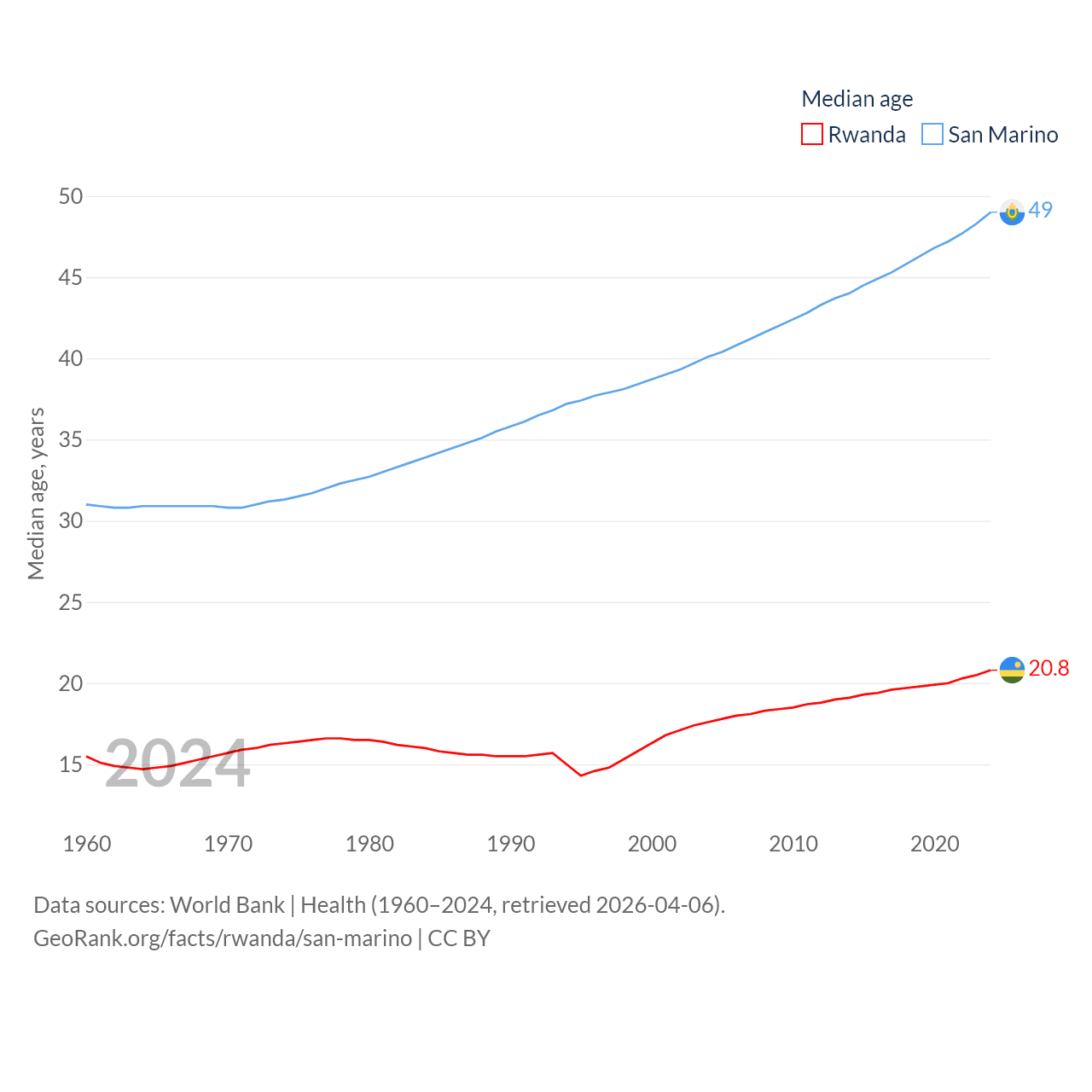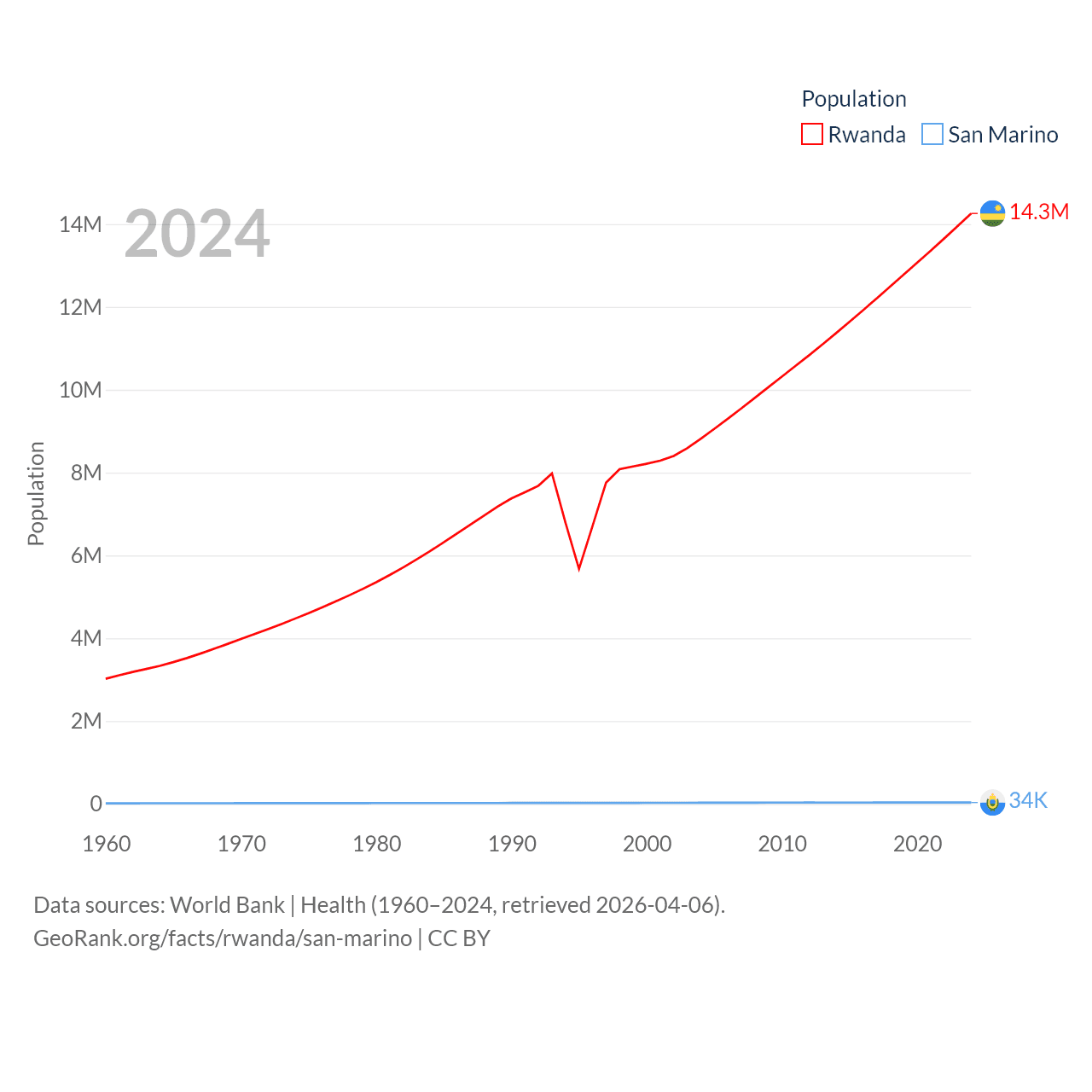 Rwanda has a population of 14.3M (ranked 77/197), compared with 34K in San Marino (ranked 193/197). Rwanda's land area is 9,525 sq mi versus 23.2 sq mi for San Marino (ranked 146th vs. 193rd).