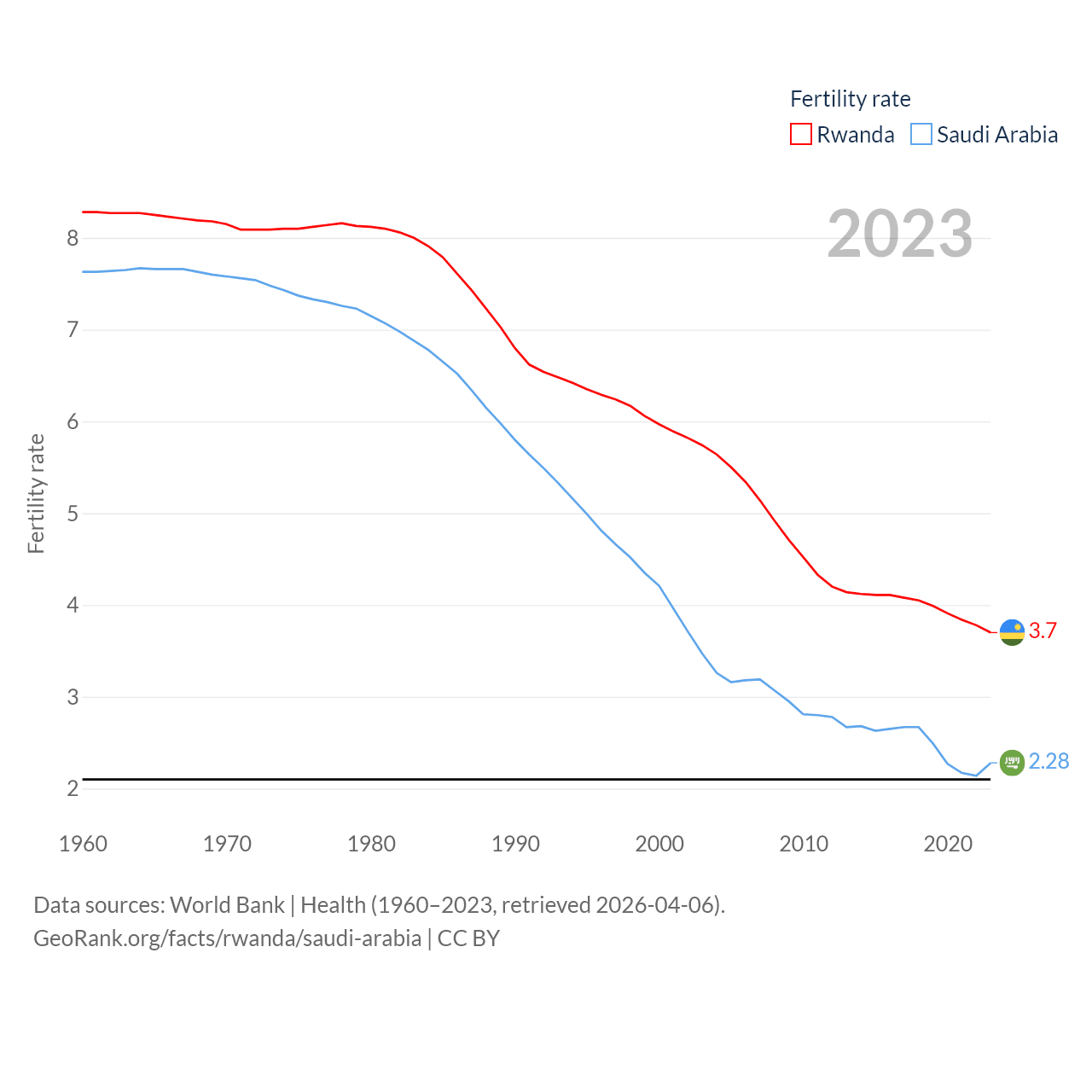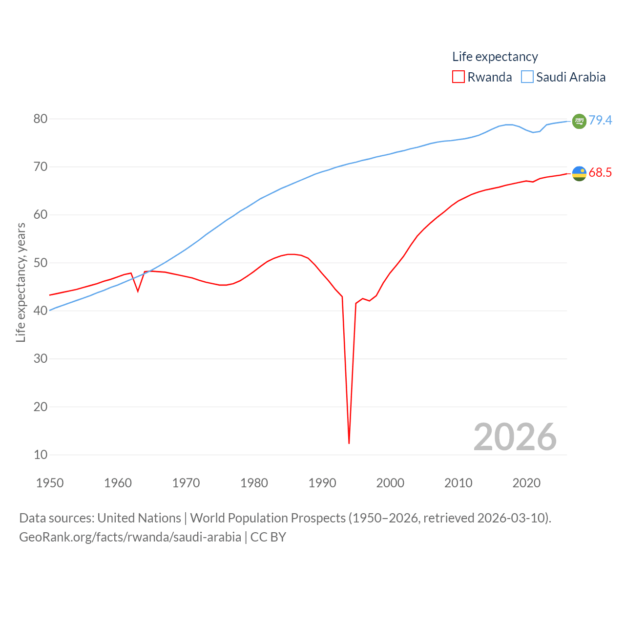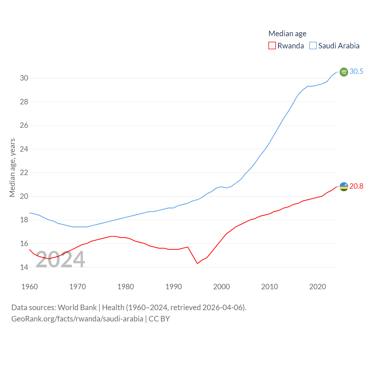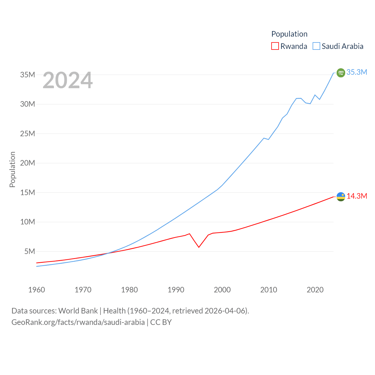 Rwanda has a population of 14.3M (ranked 77/197), compared with 35.3M in Saudi Arabia (ranked 45/197). Rwanda's land area is 9,525 sq mi versus 830,000 sq mi for Saudi Arabia (ranked 146th vs. 12th).