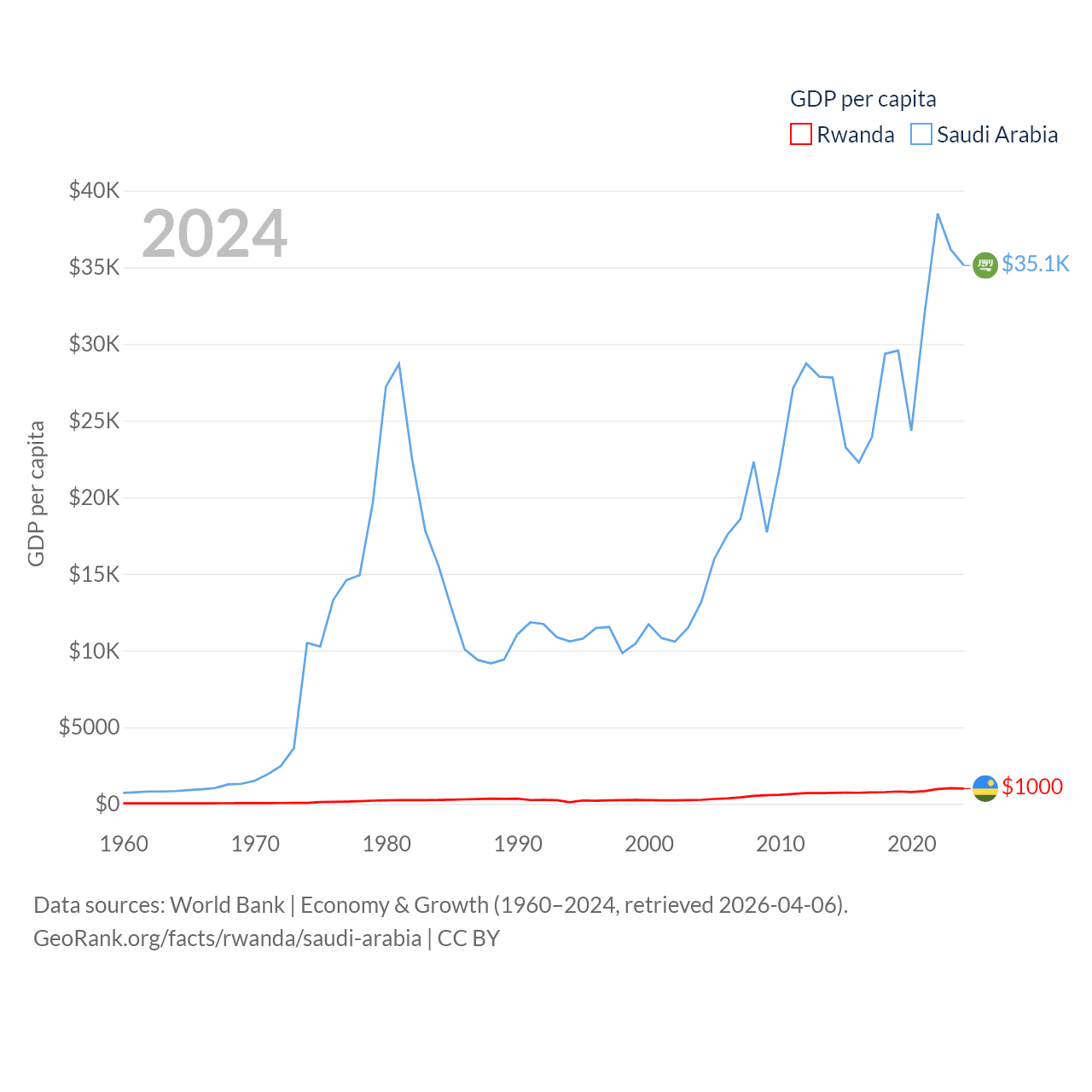 By GDP, Rwanda ranks 144/197 ($14.3B) and Saudi Arabia ranks 18/197 ($1.24T). By GDP per capita, Rwanda ranks 178/197 ($1,000), while Saudi Arabia ranks 33/197 ($35,122).