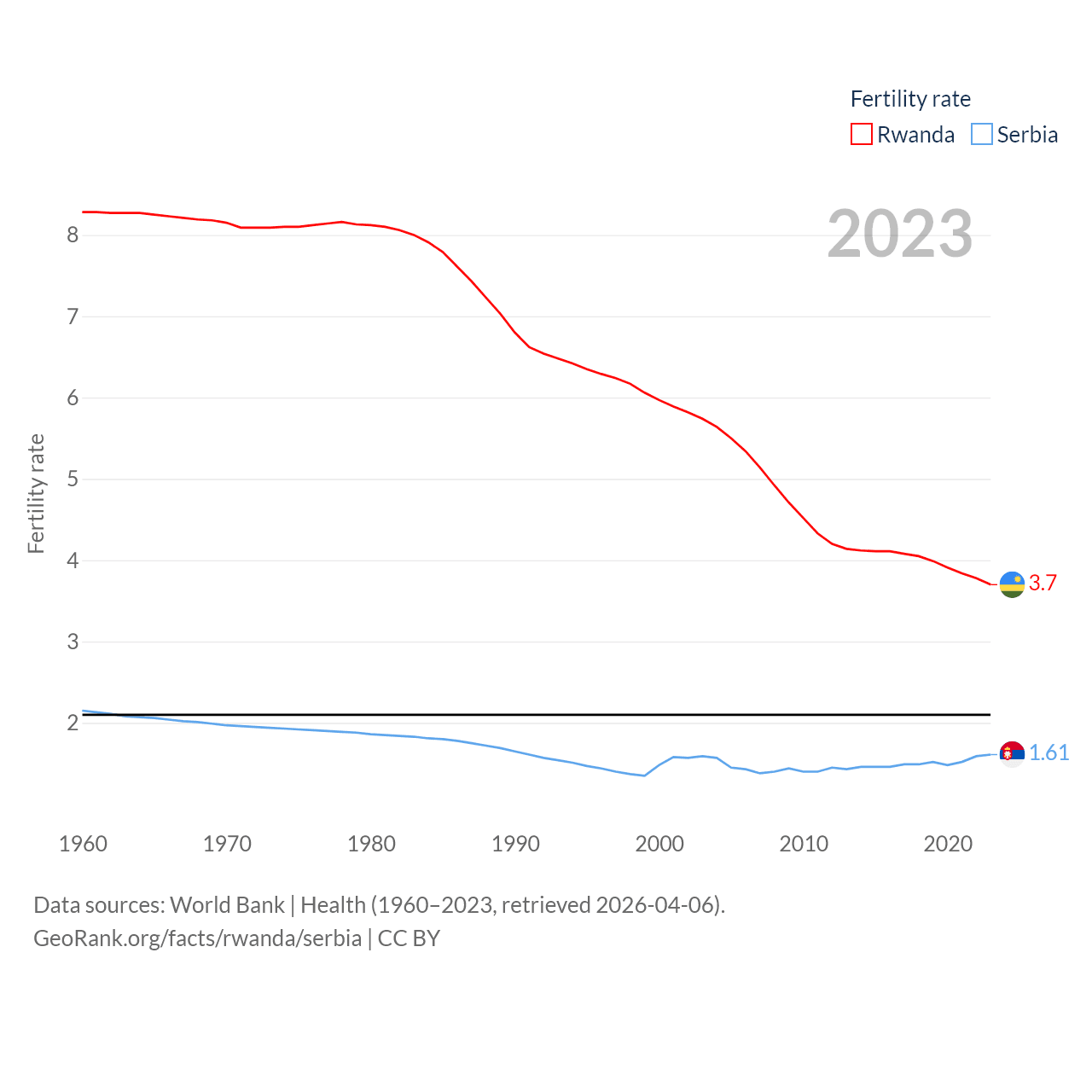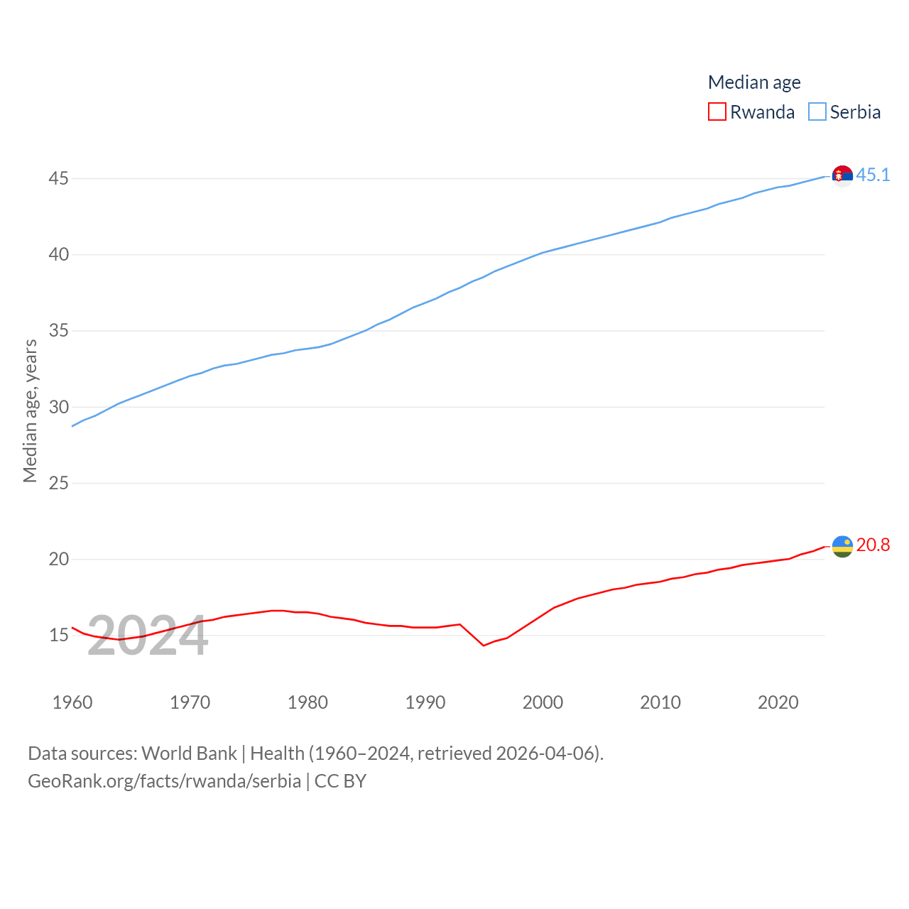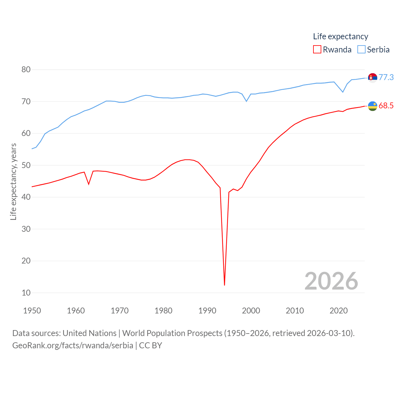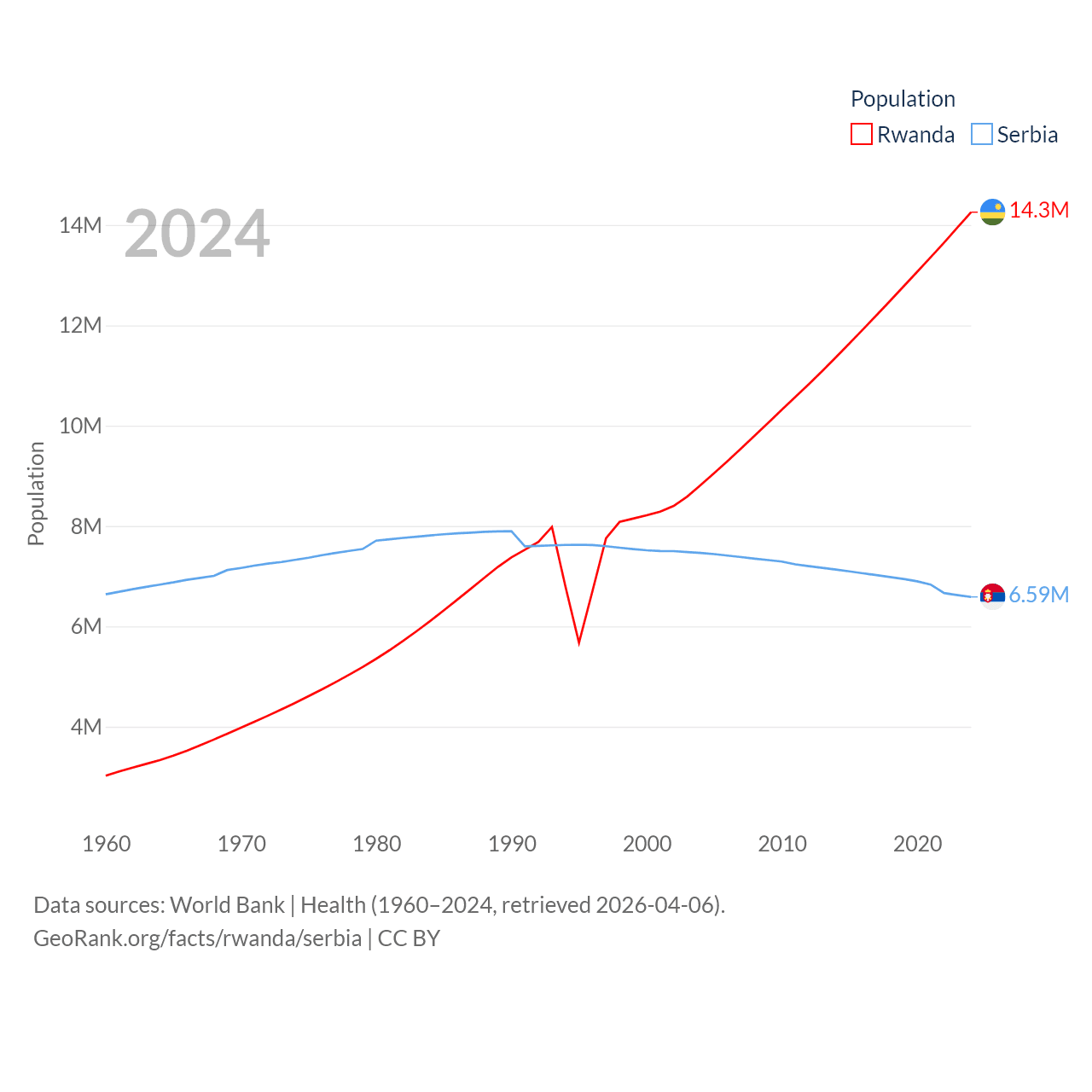 Rwanda has a population of 14.3M (ranked 77/197), compared with 6.59M in Serbia (ranked 109/197). Rwanda's land area is 9,525 sq mi versus 32,467 sq mi for Serbia (ranked 146th vs. 111th).