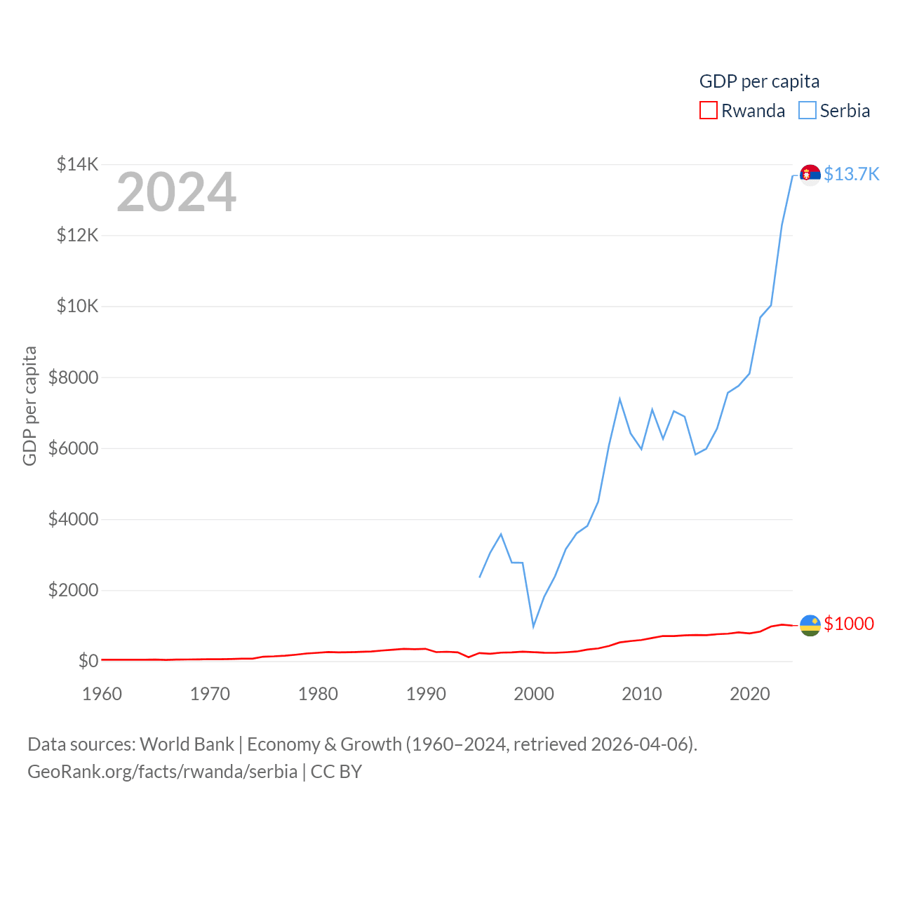 By GDP, Rwanda ranks 144/197 ($14.3B) and Serbia ranks 76/197 ($90.1B). By GDP per capita, Rwanda ranks 178/197 ($1,000), while Serbia ranks 73/197 ($13,679).