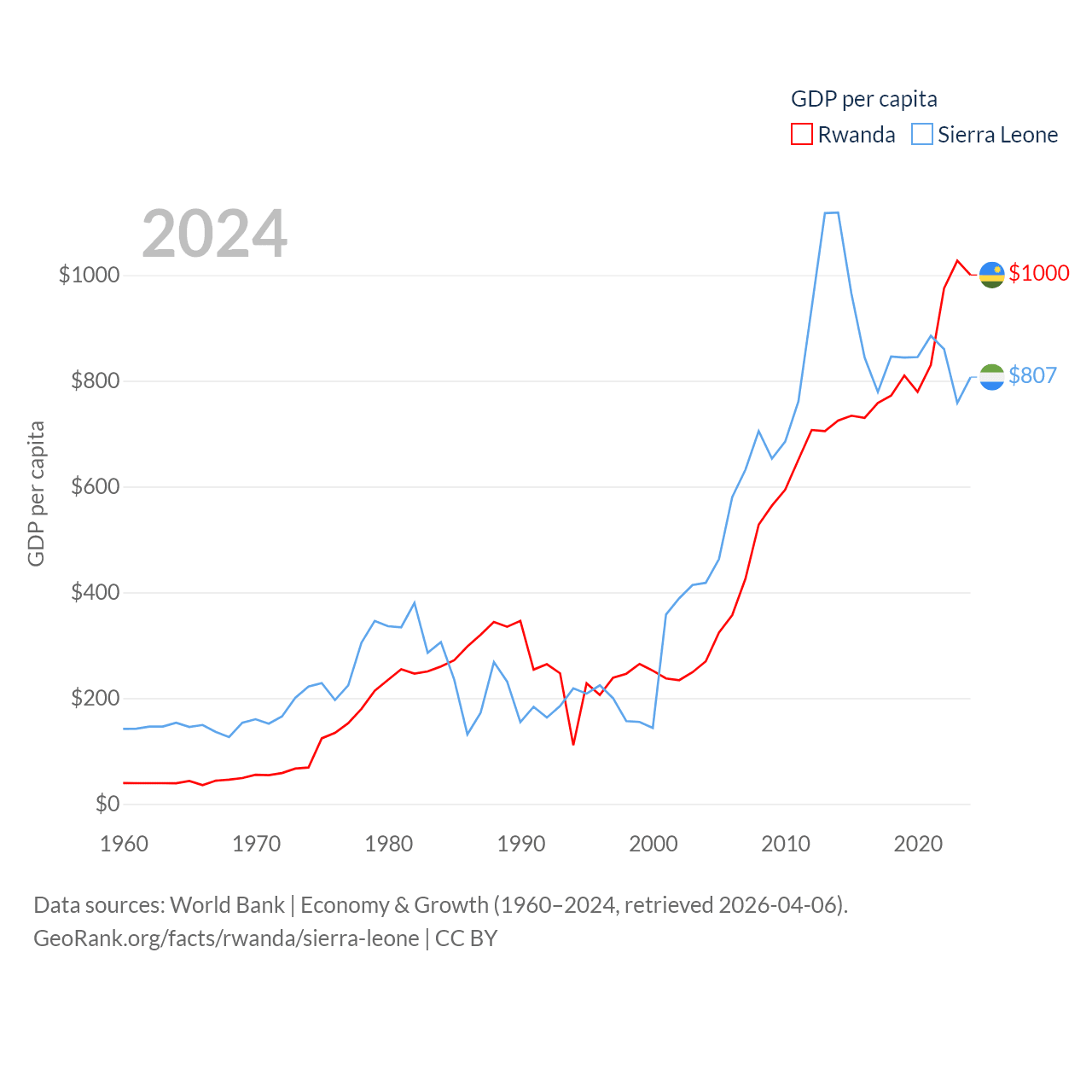 By GDP, Rwanda ranks 144/197 ($14.3B) and Sierra Leone ranks 160/197 ($6.97B). By GDP per capita, Rwanda ranks 178/197 ($1,000), while Sierra Leone ranks 186/197 ($807).