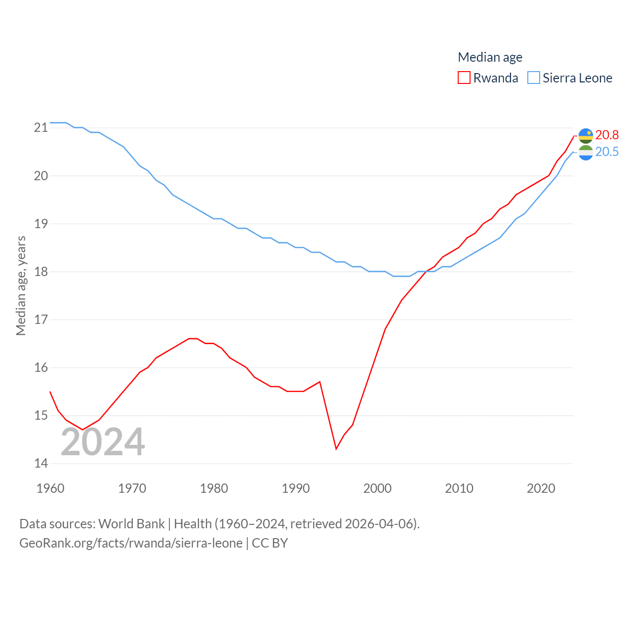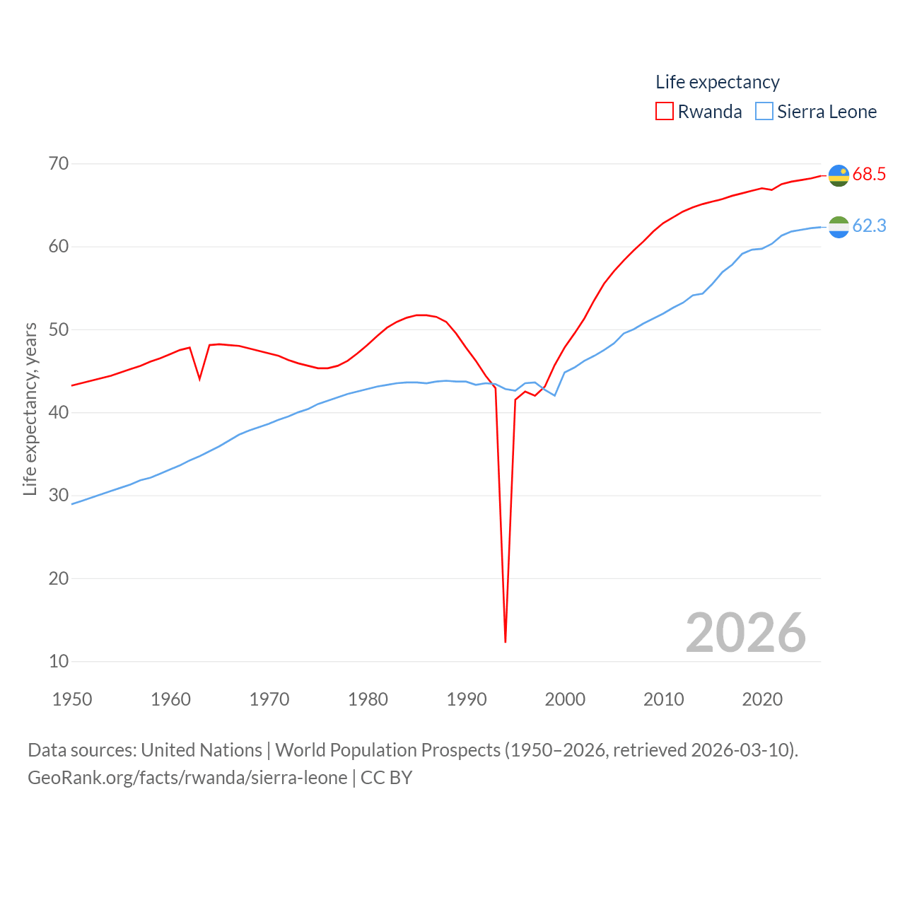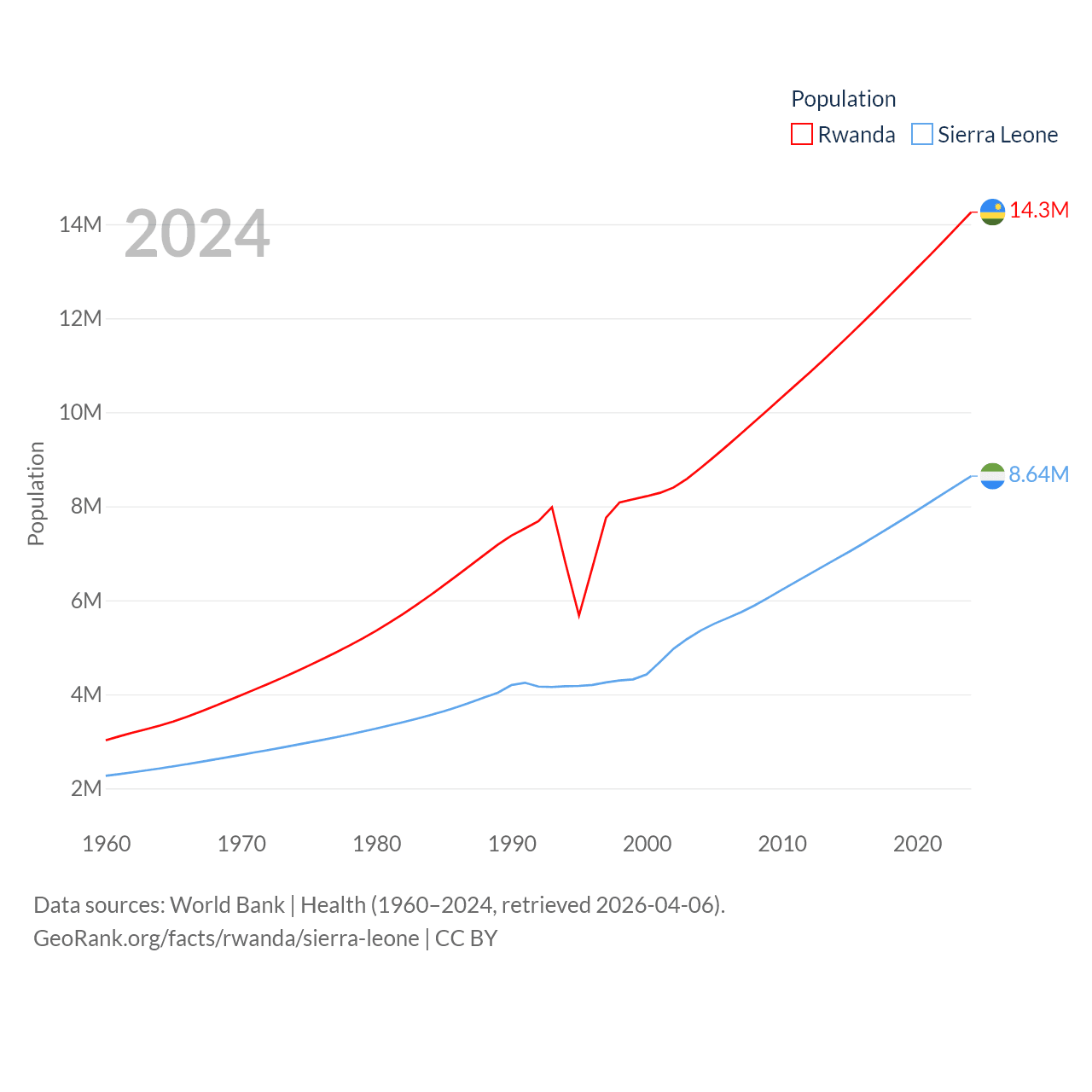 Rwanda has a population of 14.3M (ranked 77/197), compared with 8.64M in Sierra Leone (ranked 102/197). Rwanda's land area is 9,525 sq mi versus 27,869 sq mi for Sierra Leone (ranked 146th vs. 116th).