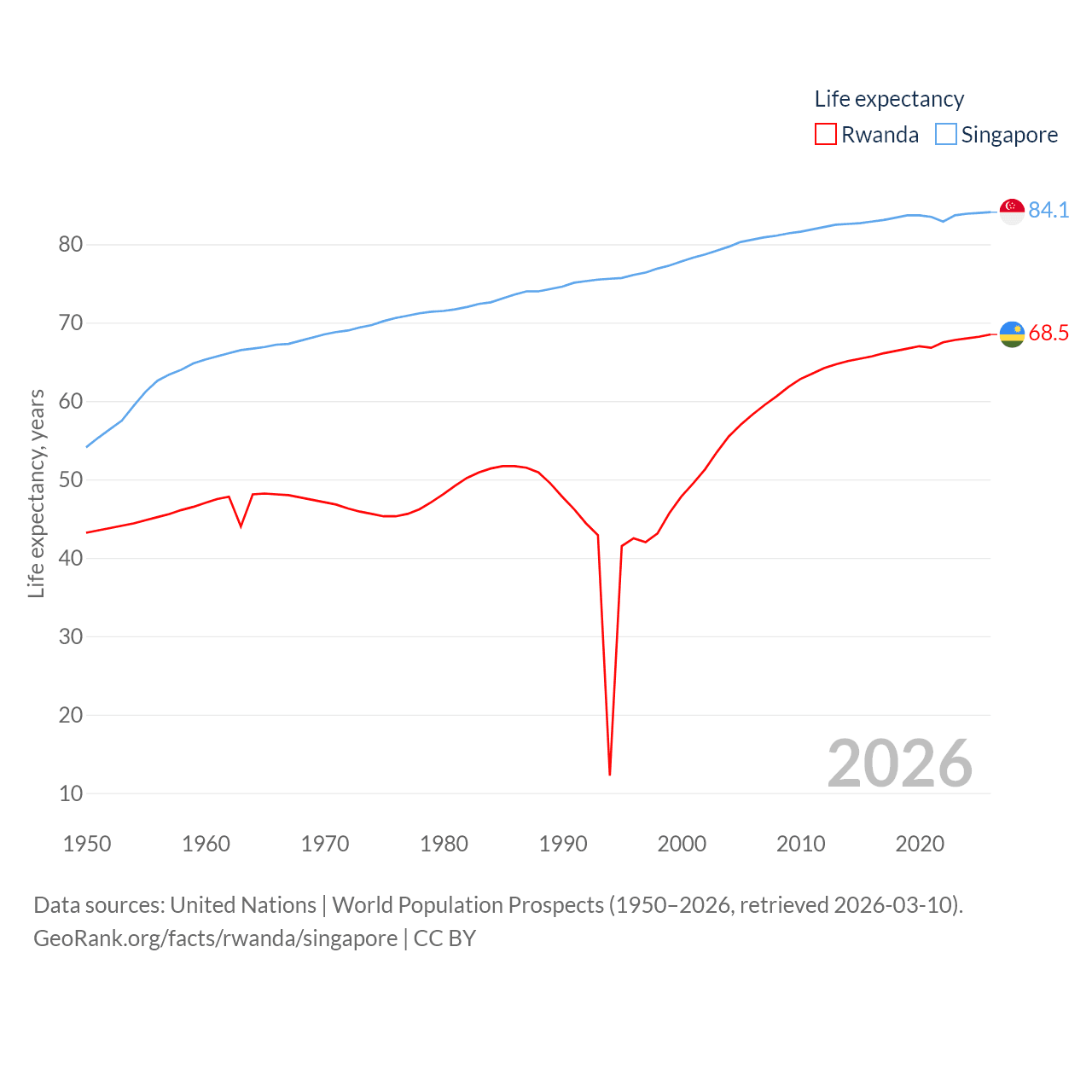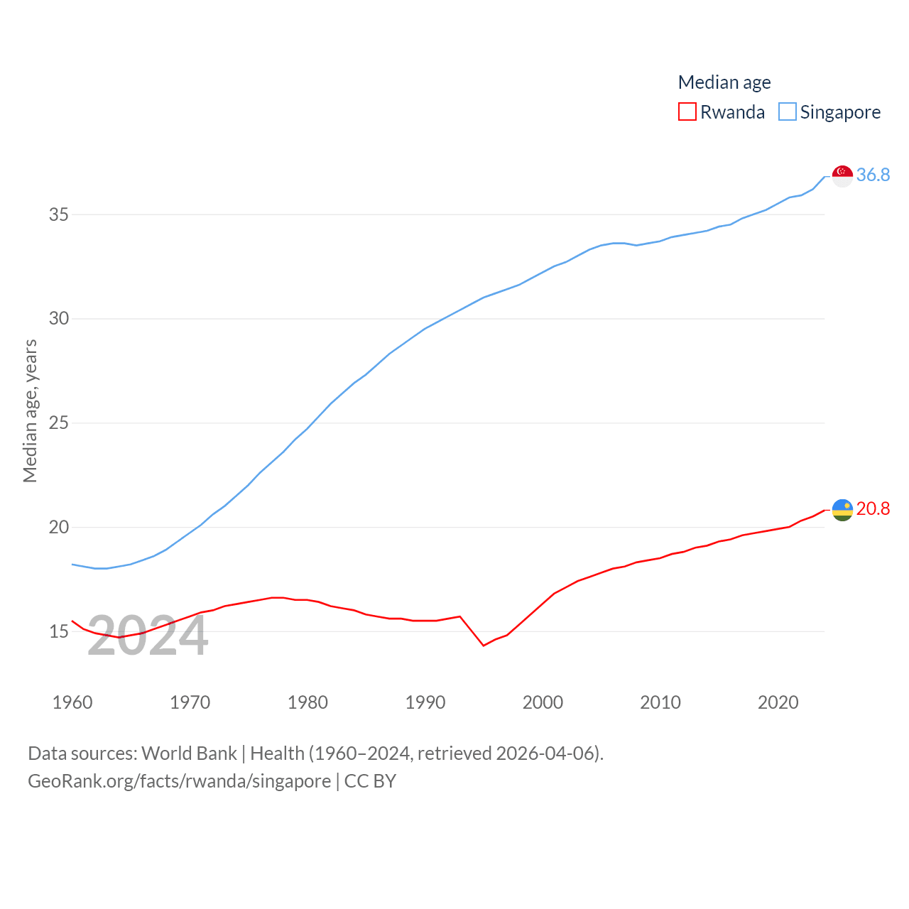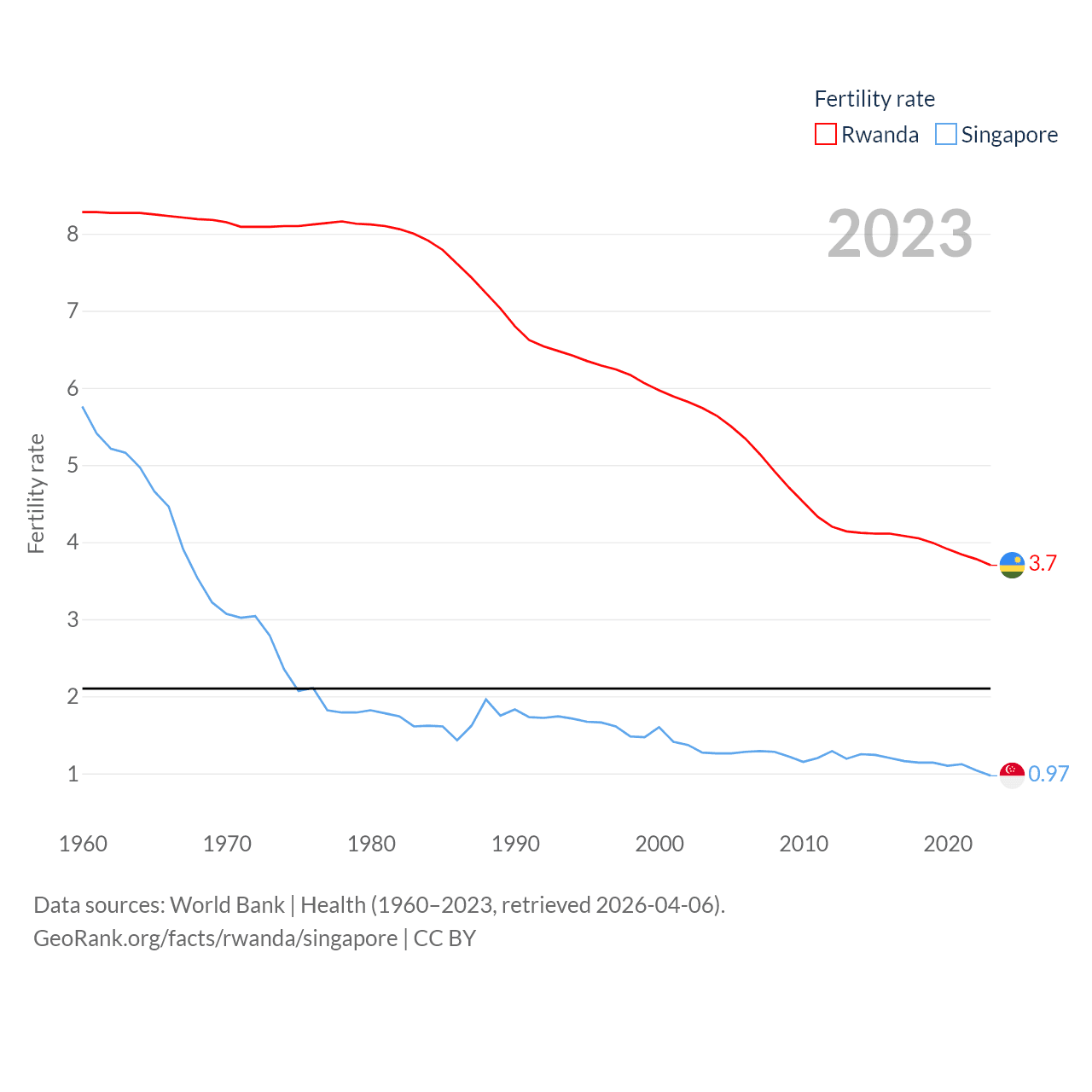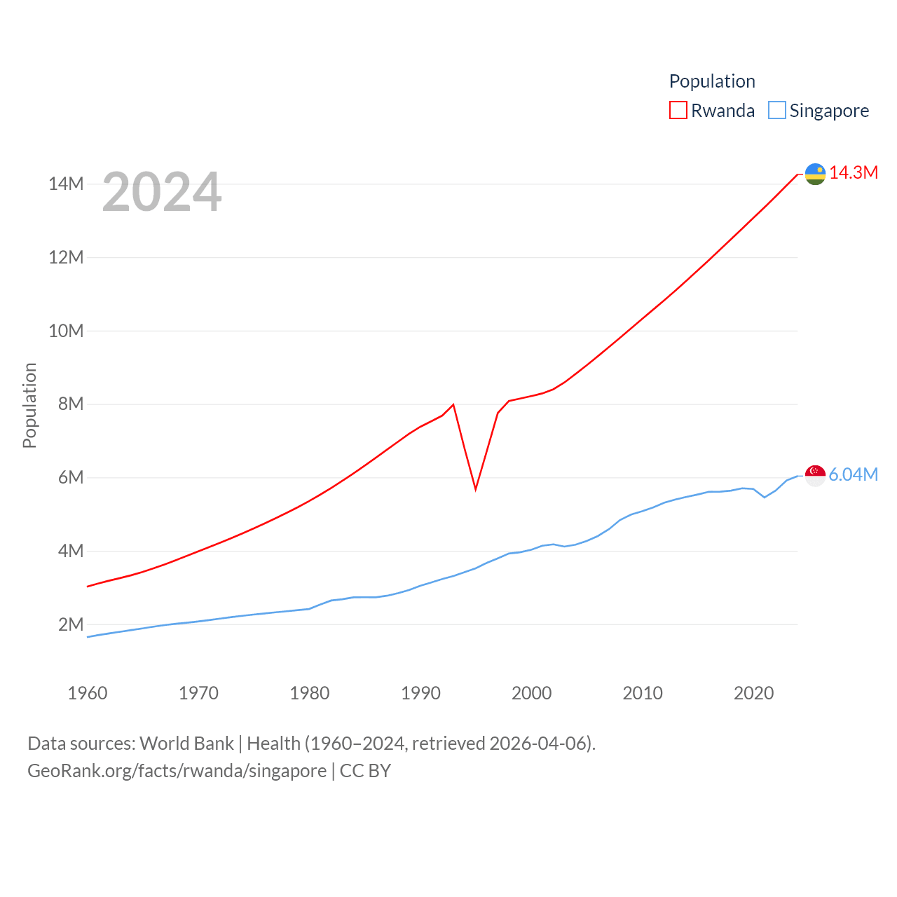 Rwanda has a population of 14.3M (ranked 77/197), compared with 6.04M in Singapore (ranked 113/197). Rwanda's land area is 9,525 sq mi versus 277.2 sq mi for Singapore (ranked 146th vs. 177th).