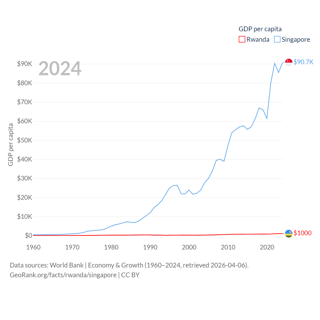 By GDP, Rwanda ranks 144/197 ($14.3B) and Singapore ranks 28/197 ($547B). By GDP per capita, Rwanda ranks 178/197 ($1,000), while Singapore ranks 7/197 ($90,674).